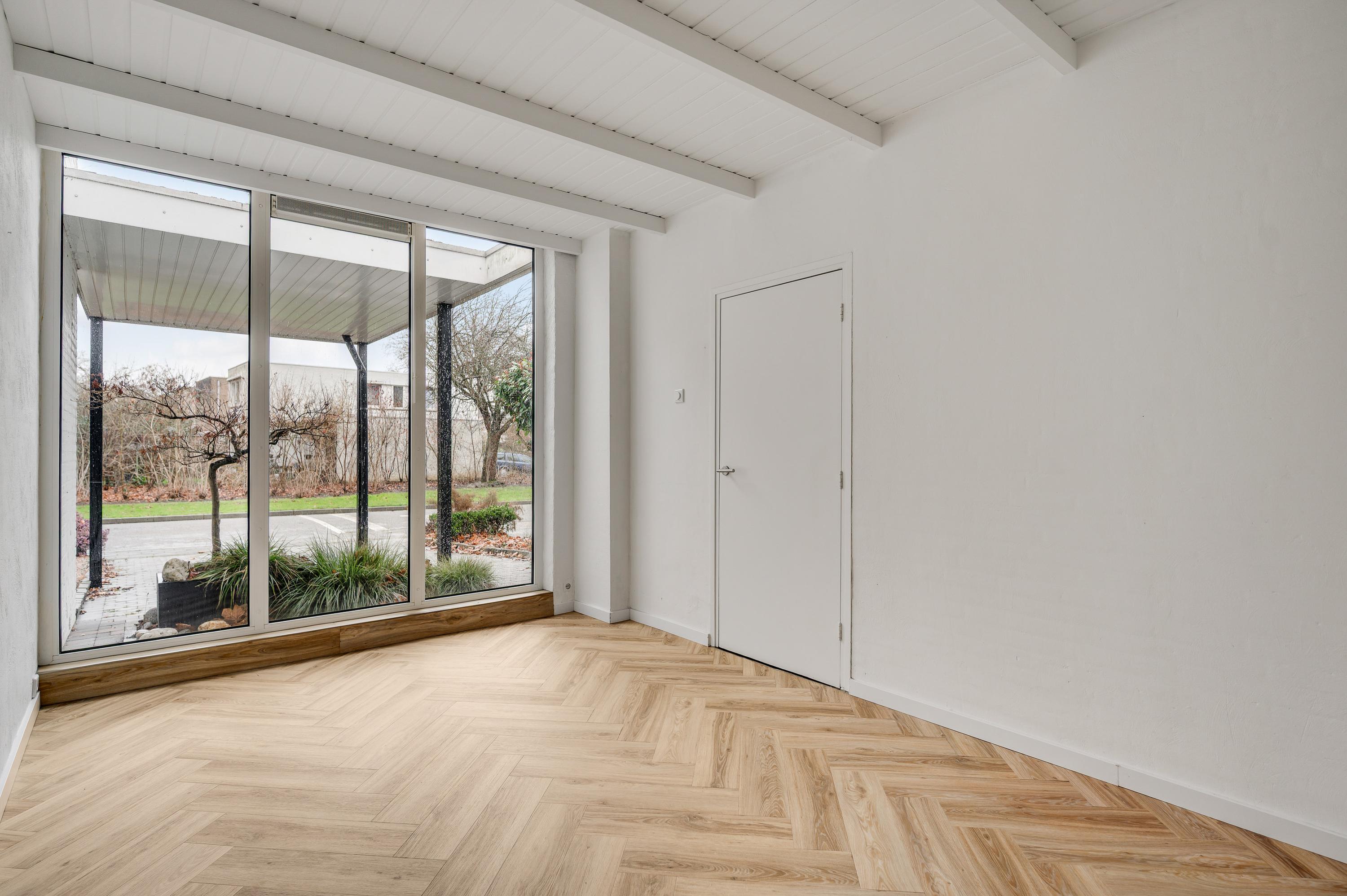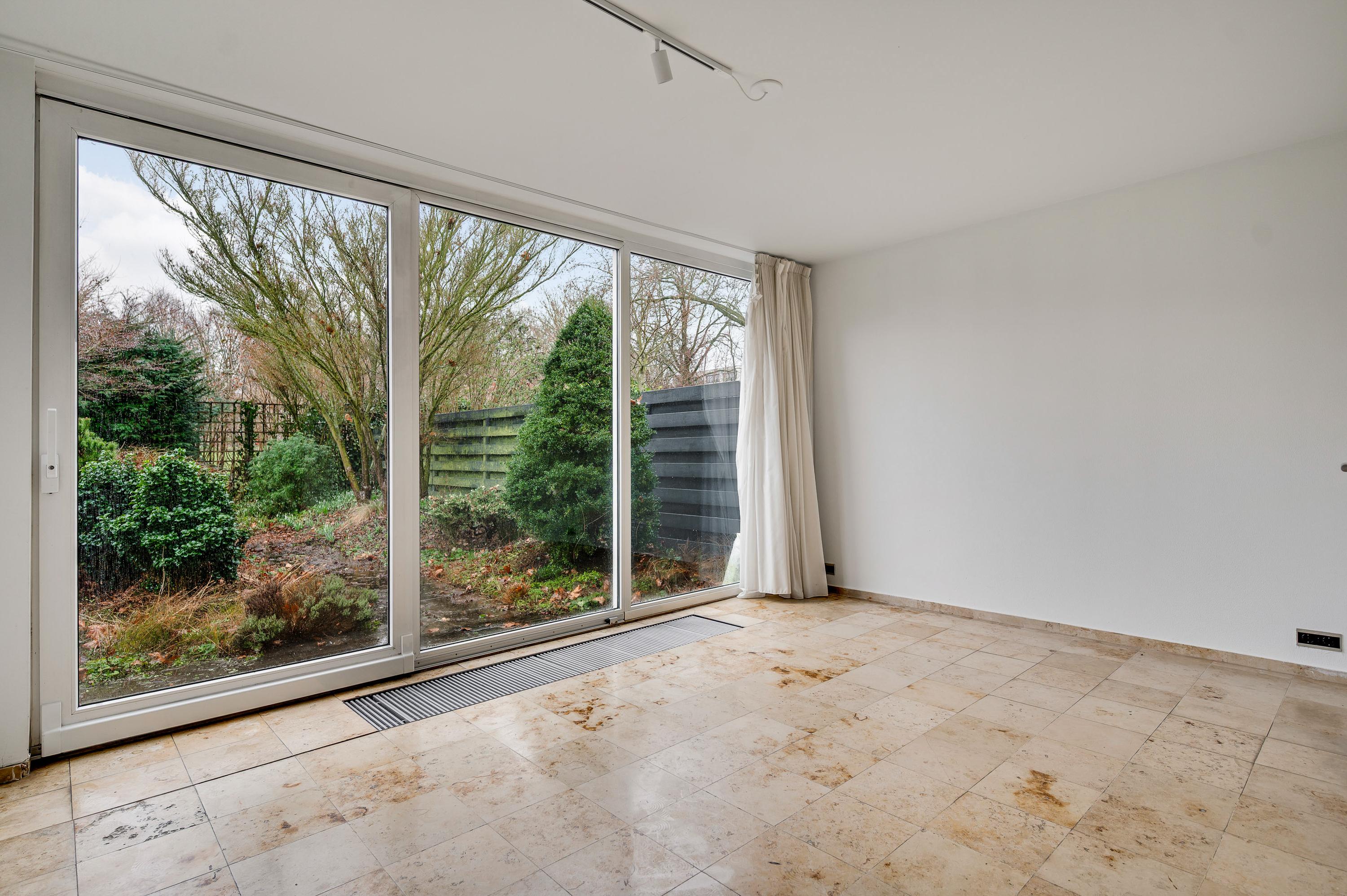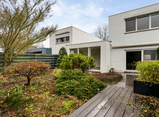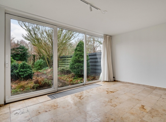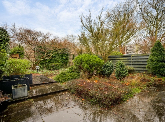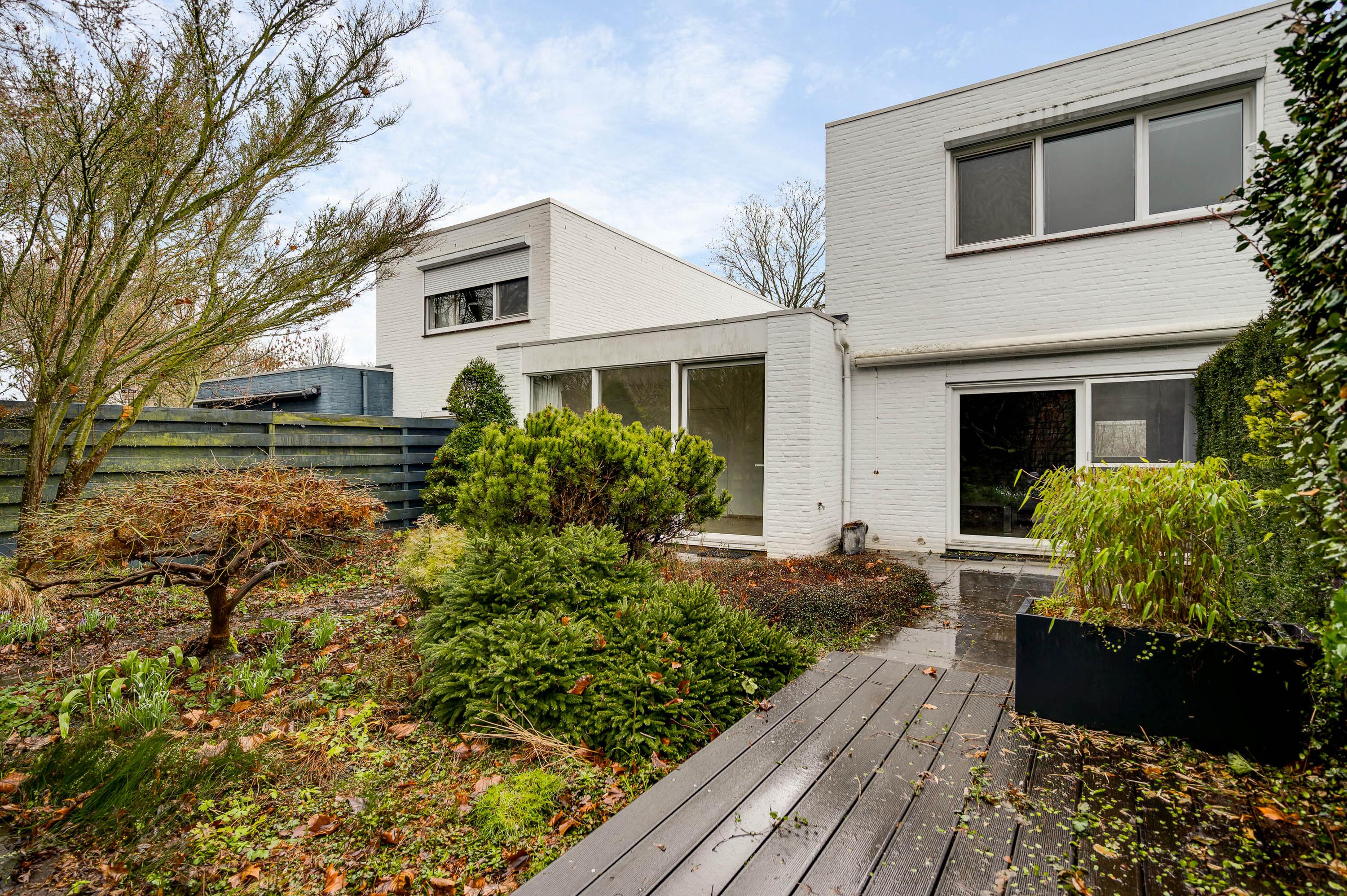 Er zijn twee grote schuifpuien naar de achtertuin, gesitueerd op het zuidoosten. U ziet gevarieerde beplanting, groene hagen en tegels van groot formaat. Omdat omliggende bebouwing laag is, ervaart u veel privacy in de tuin.