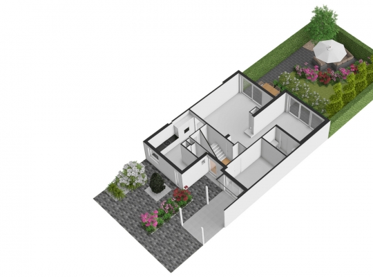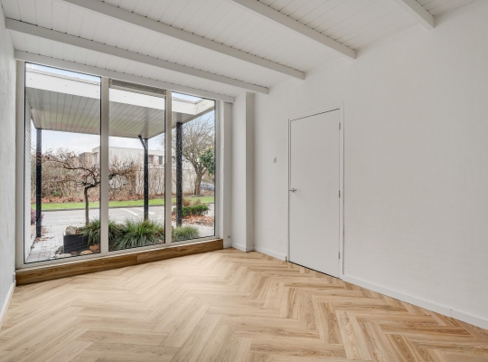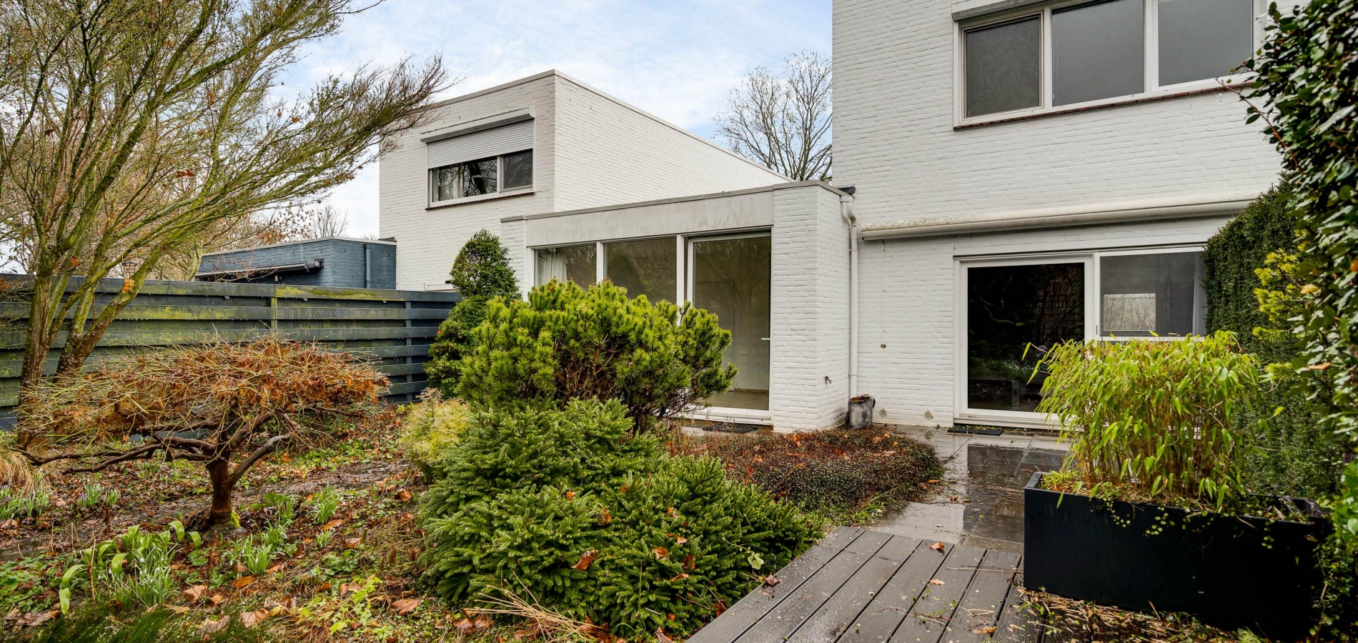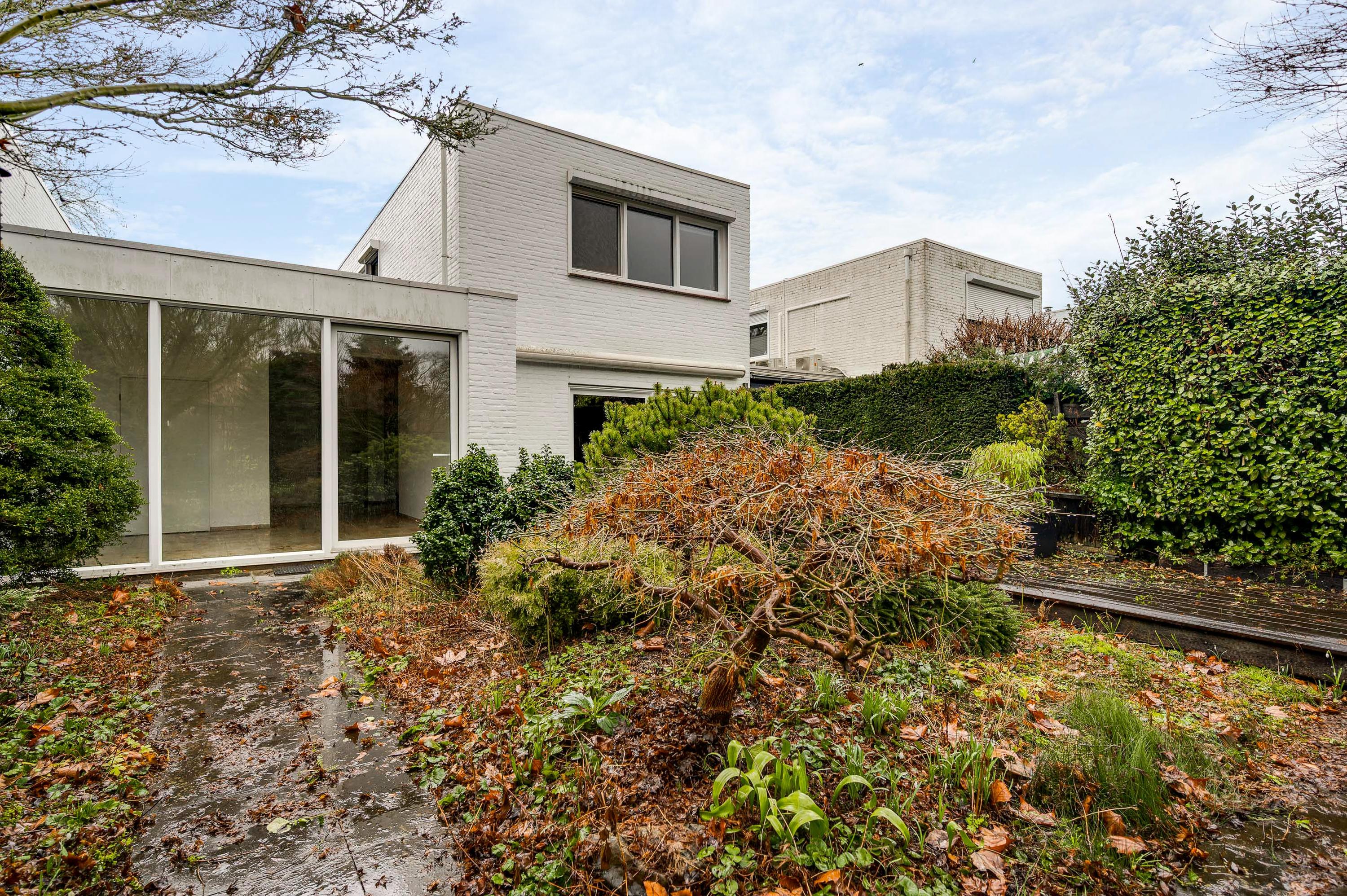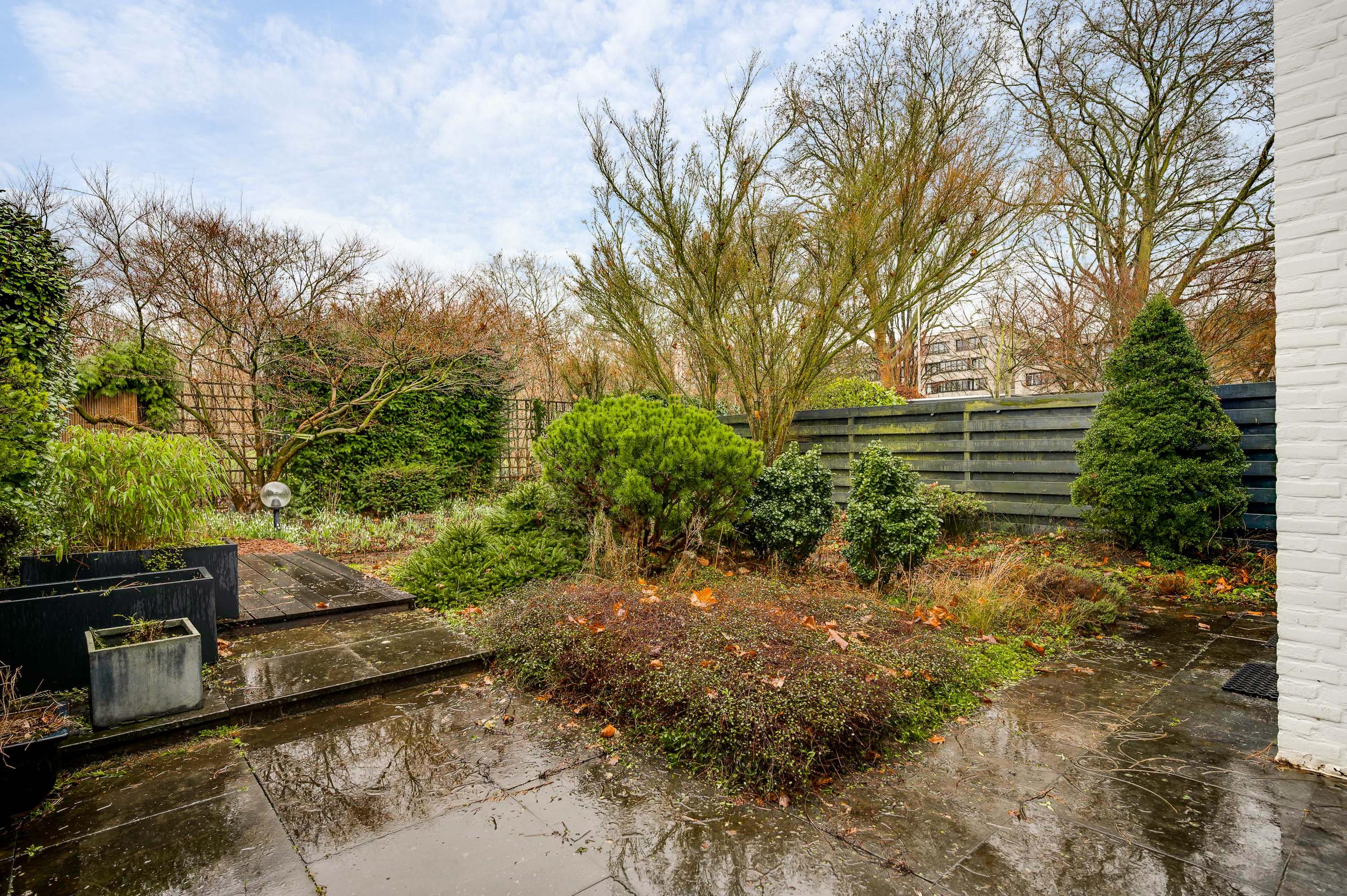Er zijn twee grote schuifpuien naar de achtertuin, gesitueerd op het zuidoosten. U ziet gevarieerde beplanting, groene hagen en tegels van groot formaat. Omdat omliggende bebouwing laag is, ervaart u veel privacy in de tuin.