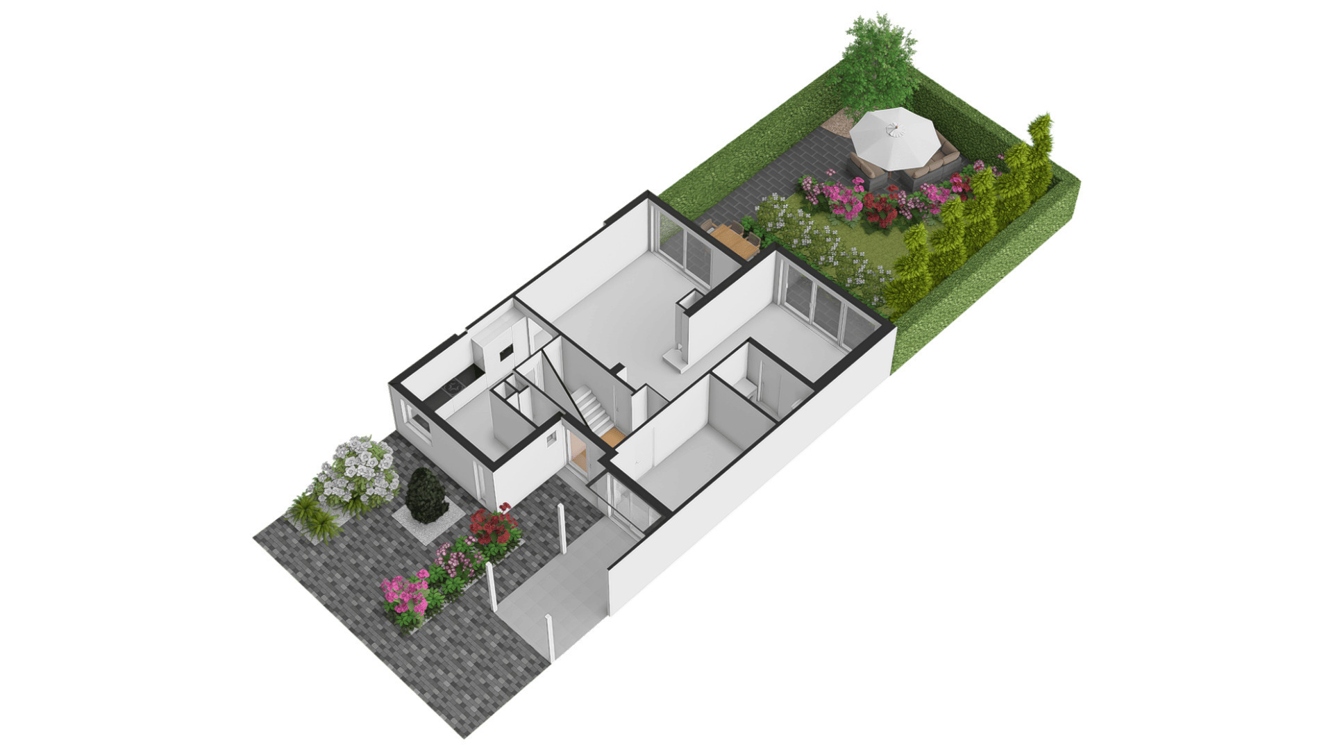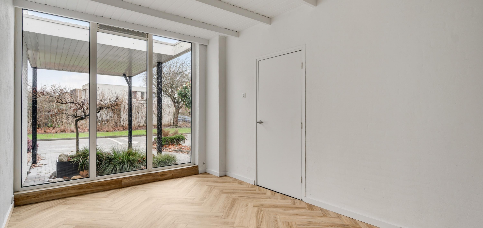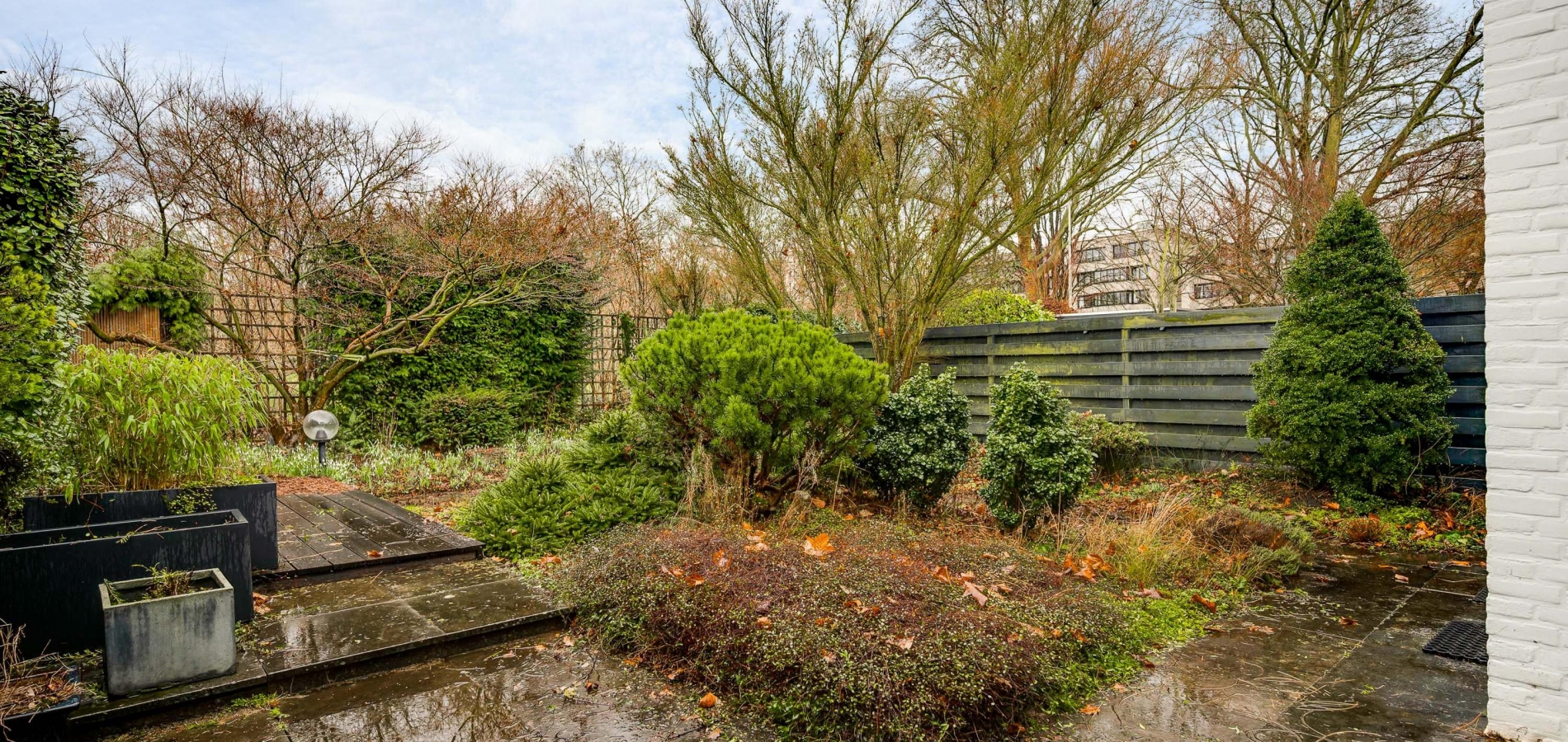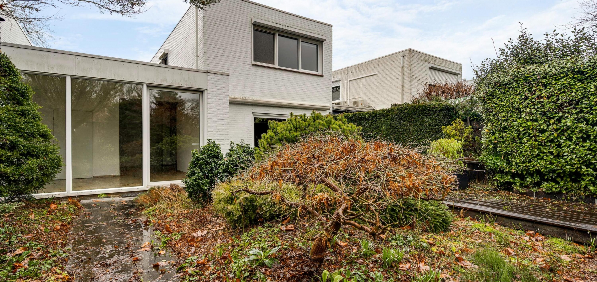 Er zijn twee grote schuifpuien naar de achtertuin, gesitueerd op het zuidoosten. U ziet gevarieerde beplanting, groene hagen en tegels van groot formaat. Omdat omliggende bebouwing laag is, ervaart u veel privacy in de tuin.