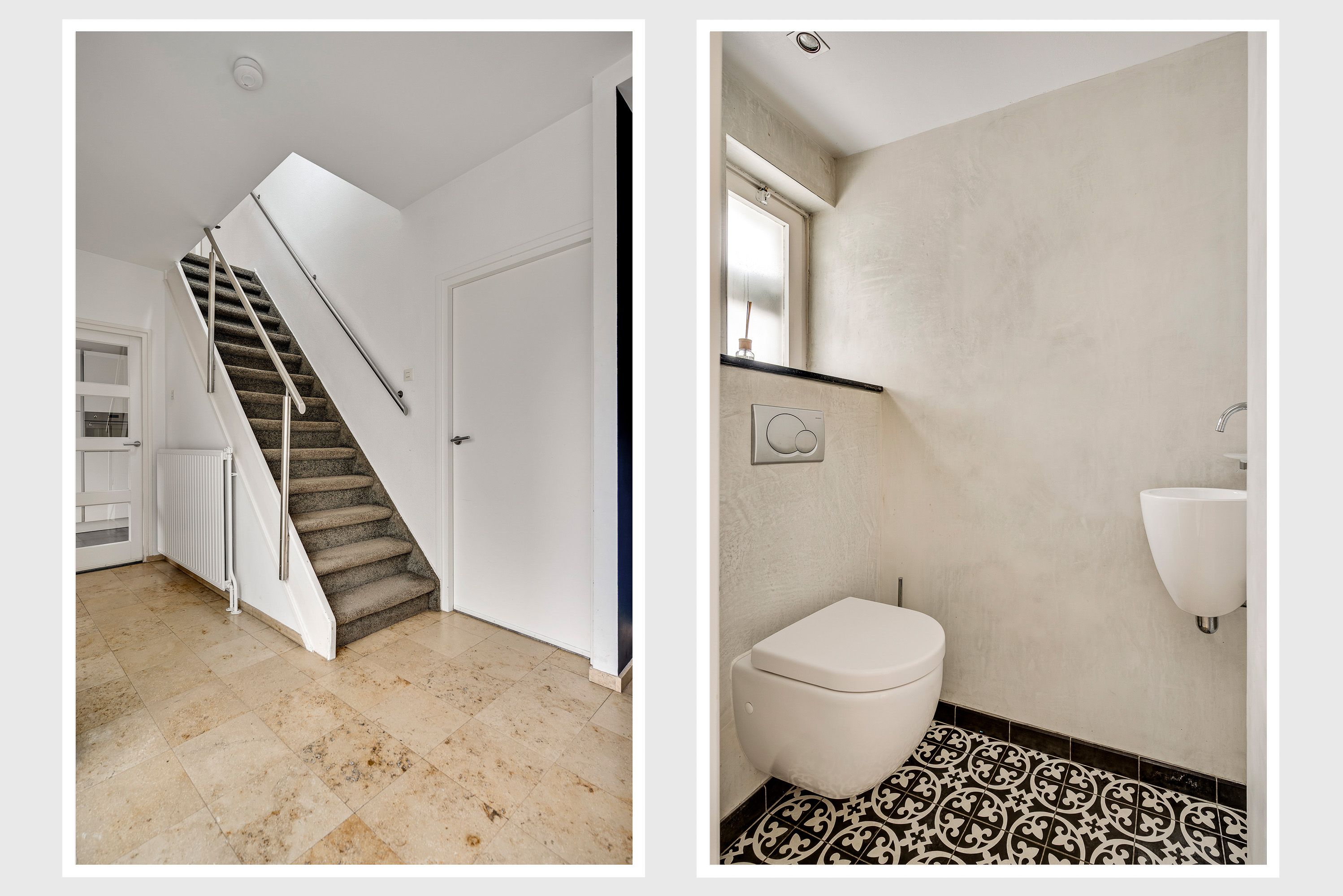 Op een paar stappen van de carport is de entree van deze lichte en goed ingedeelde woning. In de hal valt uw oog op de natuursteen vloer en de trap naar de eerste verdieping. Vanuit de hal is er onder andere toegang tot de fraaie toiletruimte en slaapkamer I (circa 4,61 x 2,86), met een grote pui aan de voorzijde en een visgraatvloer.