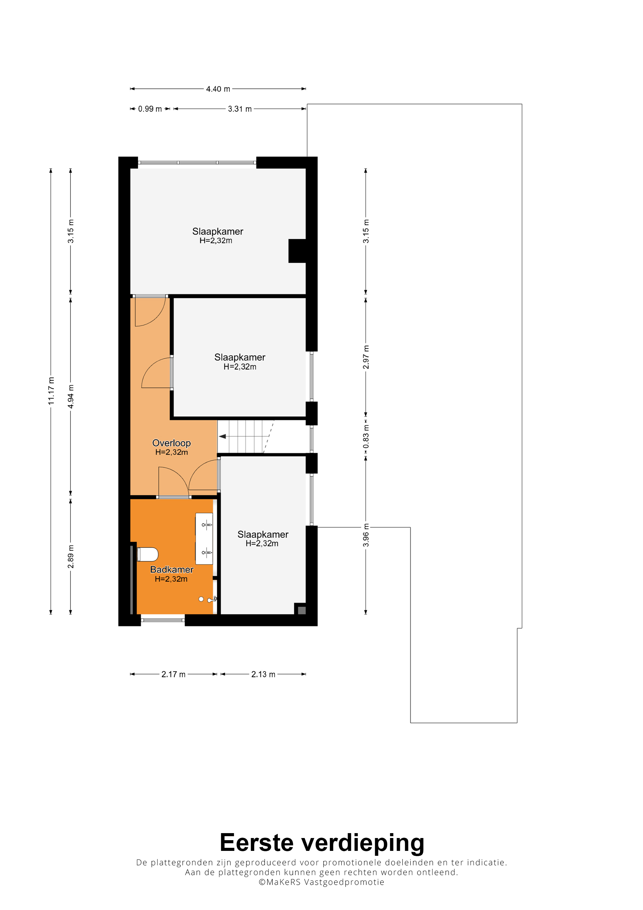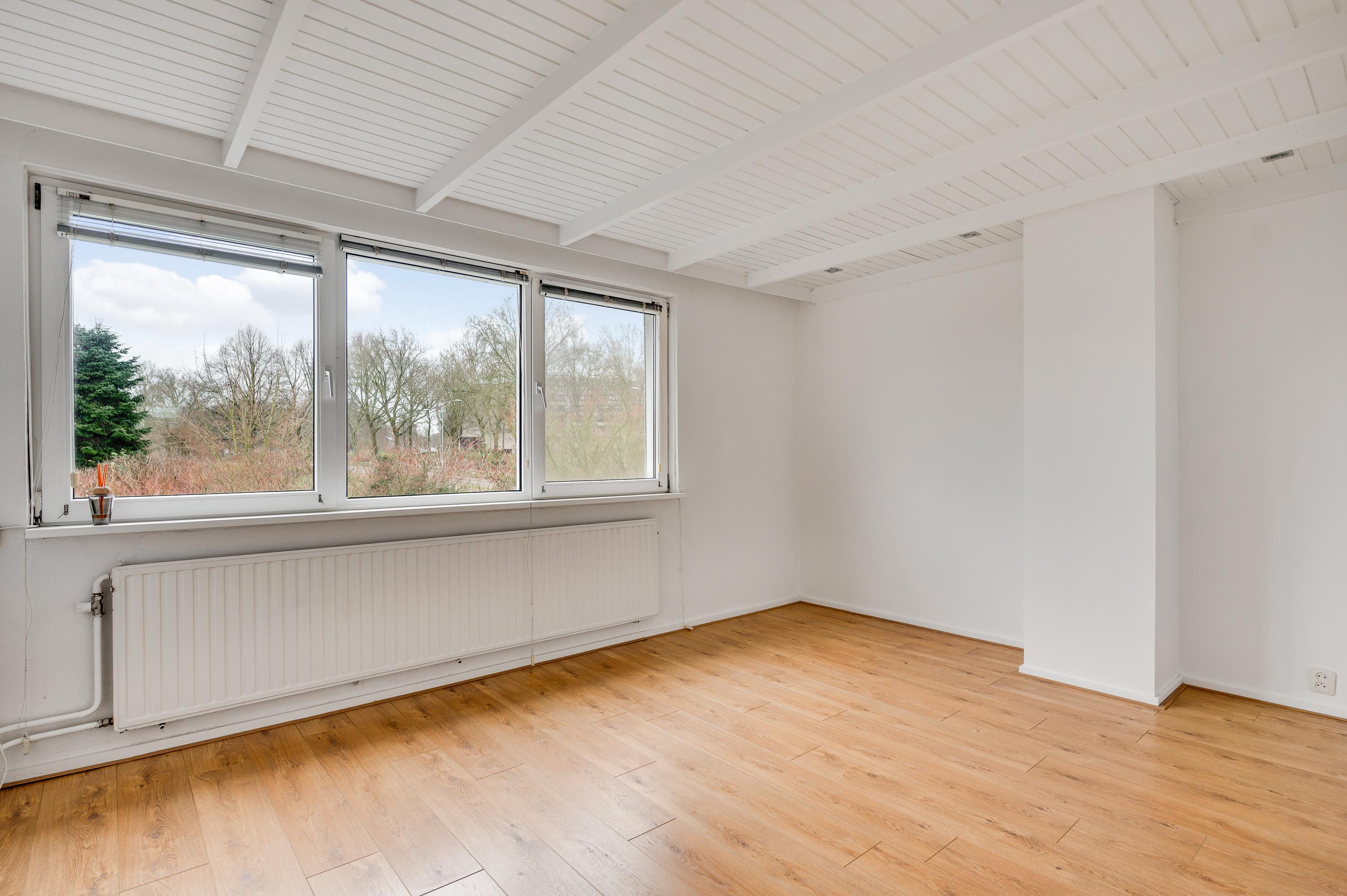 Met drie slaapkamers en een badkamer heeft de eerste verdieping een goede indeling, ook voor een gezin. Aan de achterzijde is slaapkamer II (circa 4,40 x 3,15), met veel groen als uitzicht. Naast deze kamer is slaapkamer III (circa 3,31 x 2,97) en aan de voorzijde vindt u slaapkamer IV (circa 3,96 x 2,13).