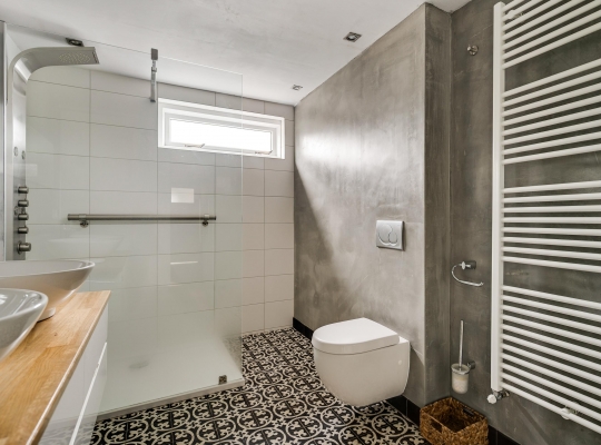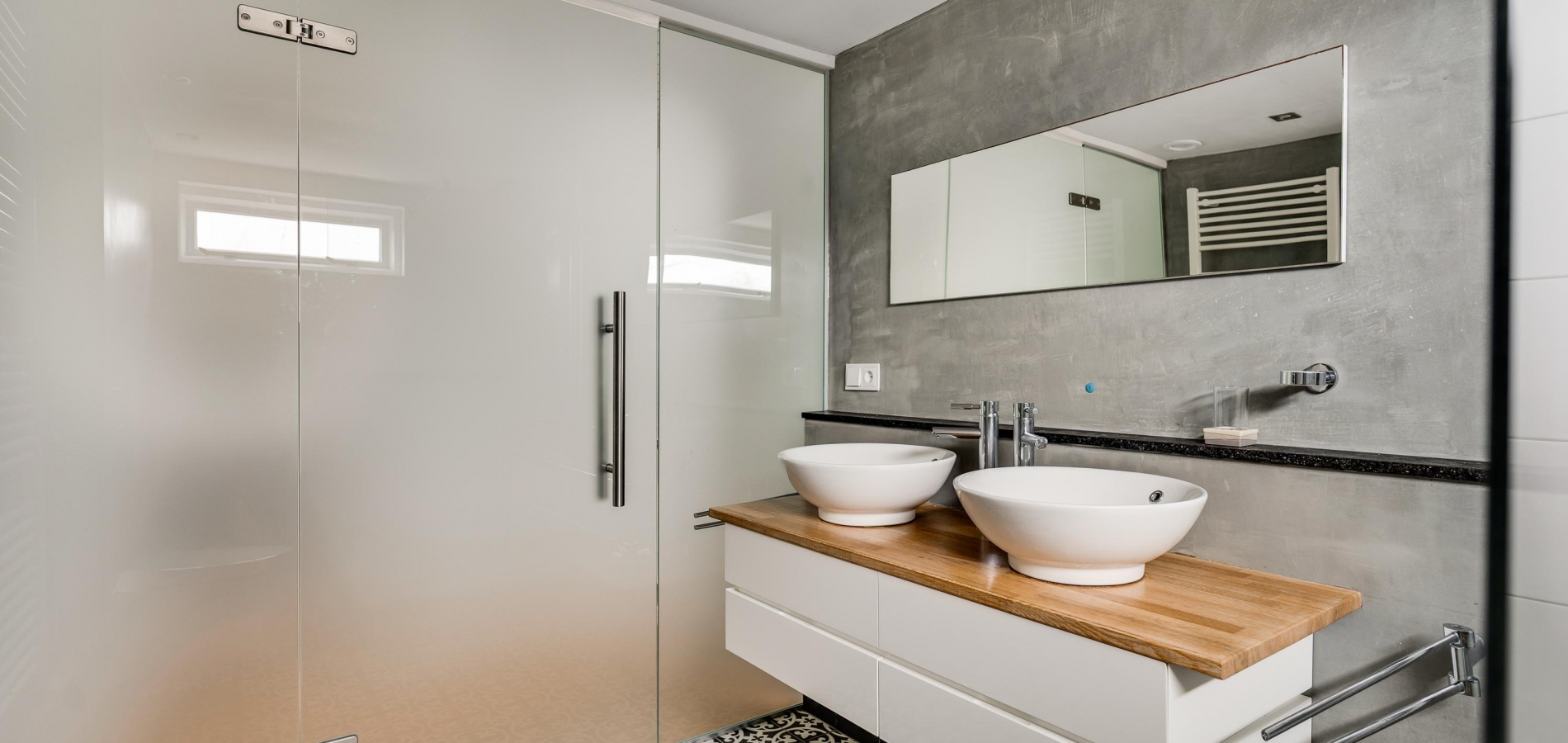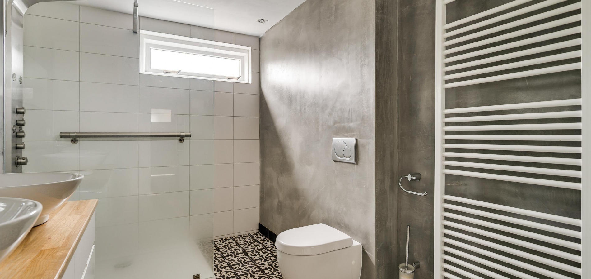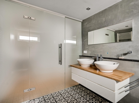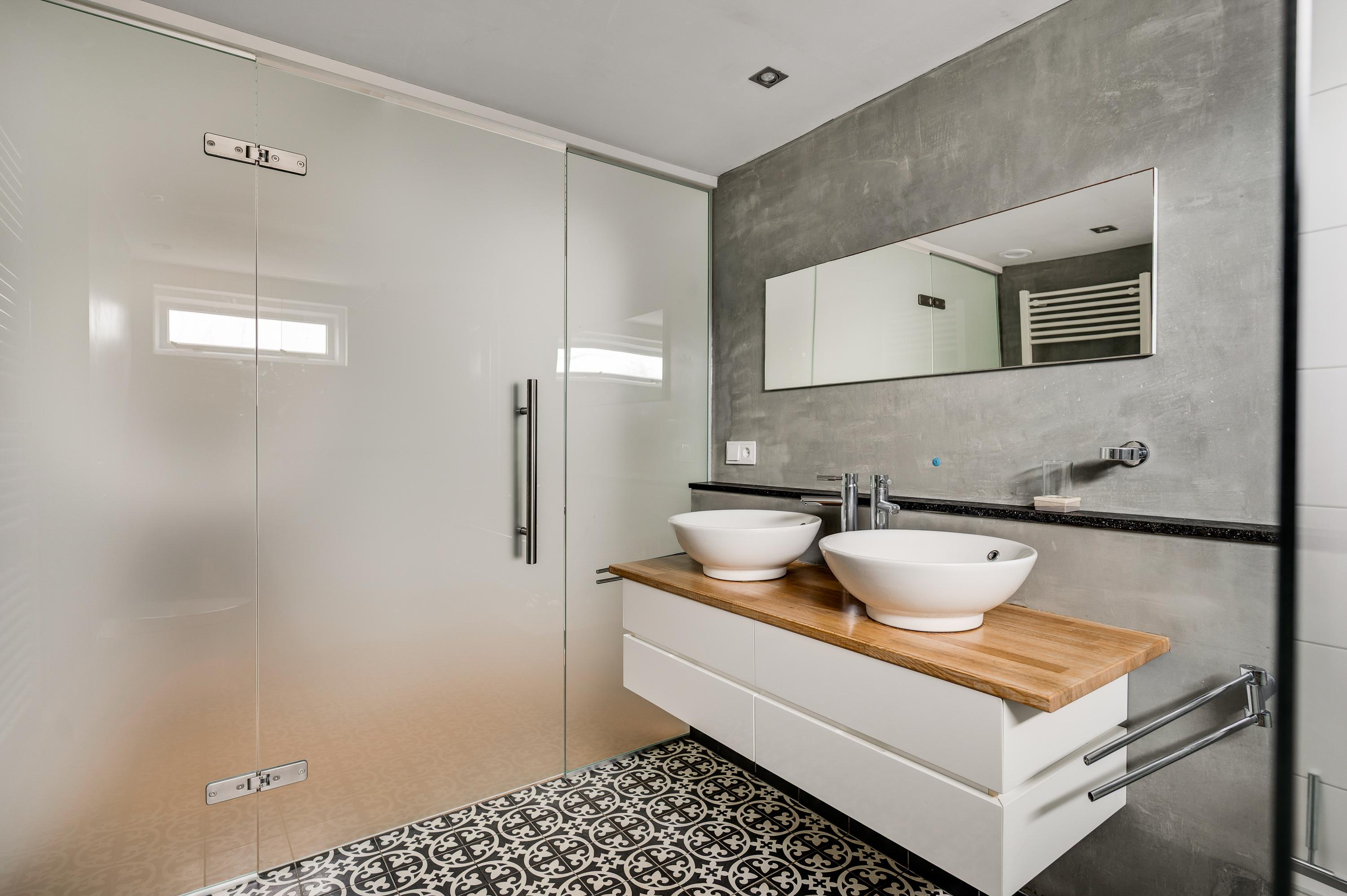 De badkamer (circa 2,89 x 2,17) is uitgevoerd in dezelfde stijl als de toiletruimte op de begane grond. U heeft de beschikking over een luxe douche met lage instap, een wandcloset en een badmeubel waarop twee wastafels staan. Een glazen wand met deur, geheel uitgevoerd in melkglas, zorgt voor privacy in de badkamer en voor fijne lichtinval op de overloop.