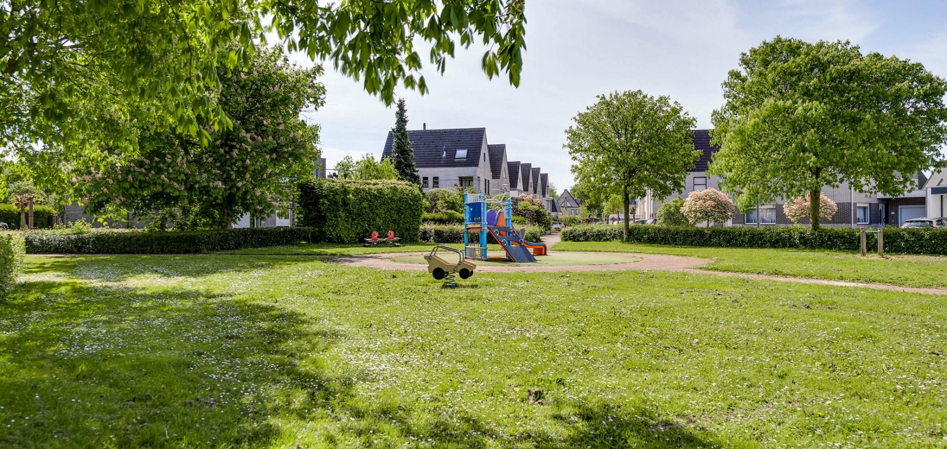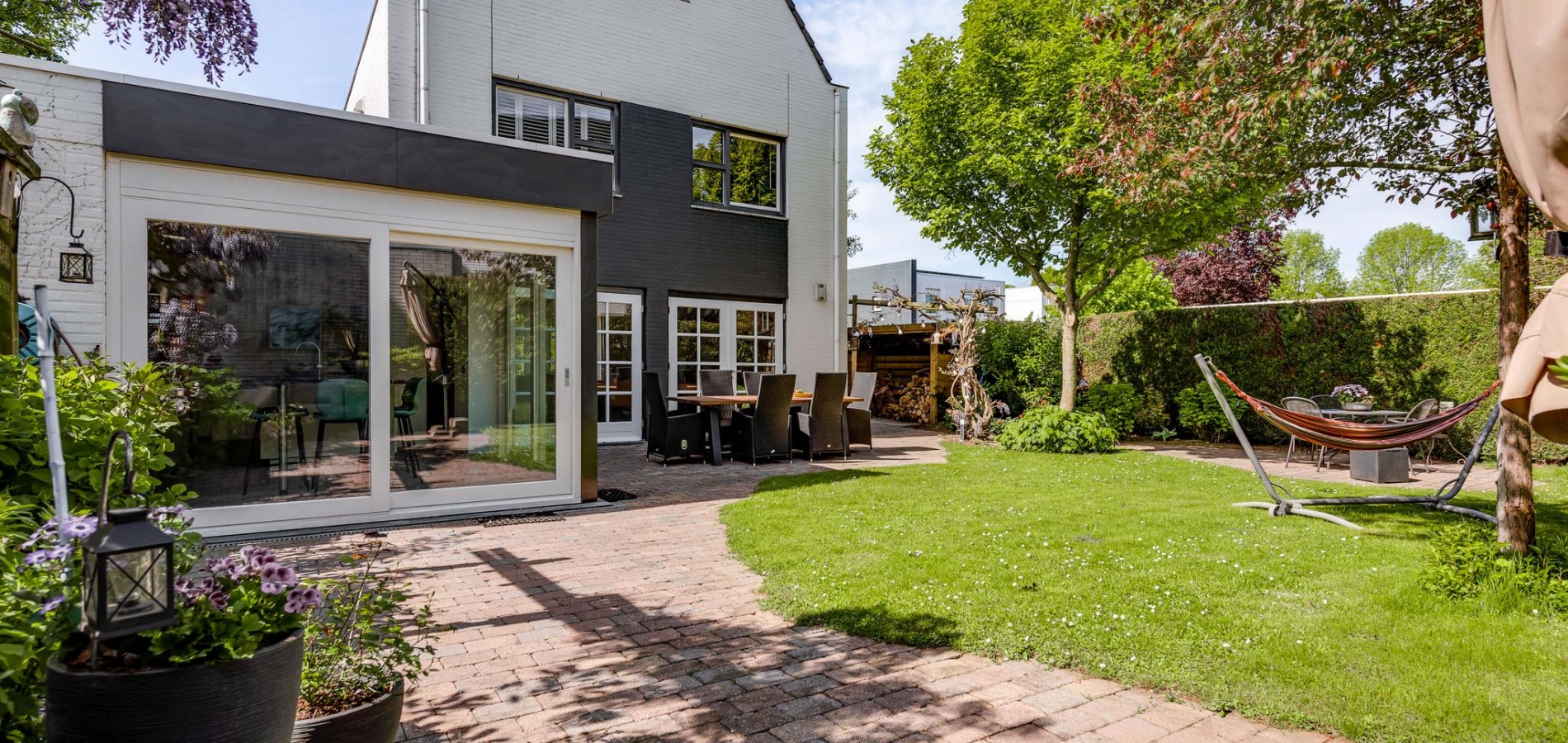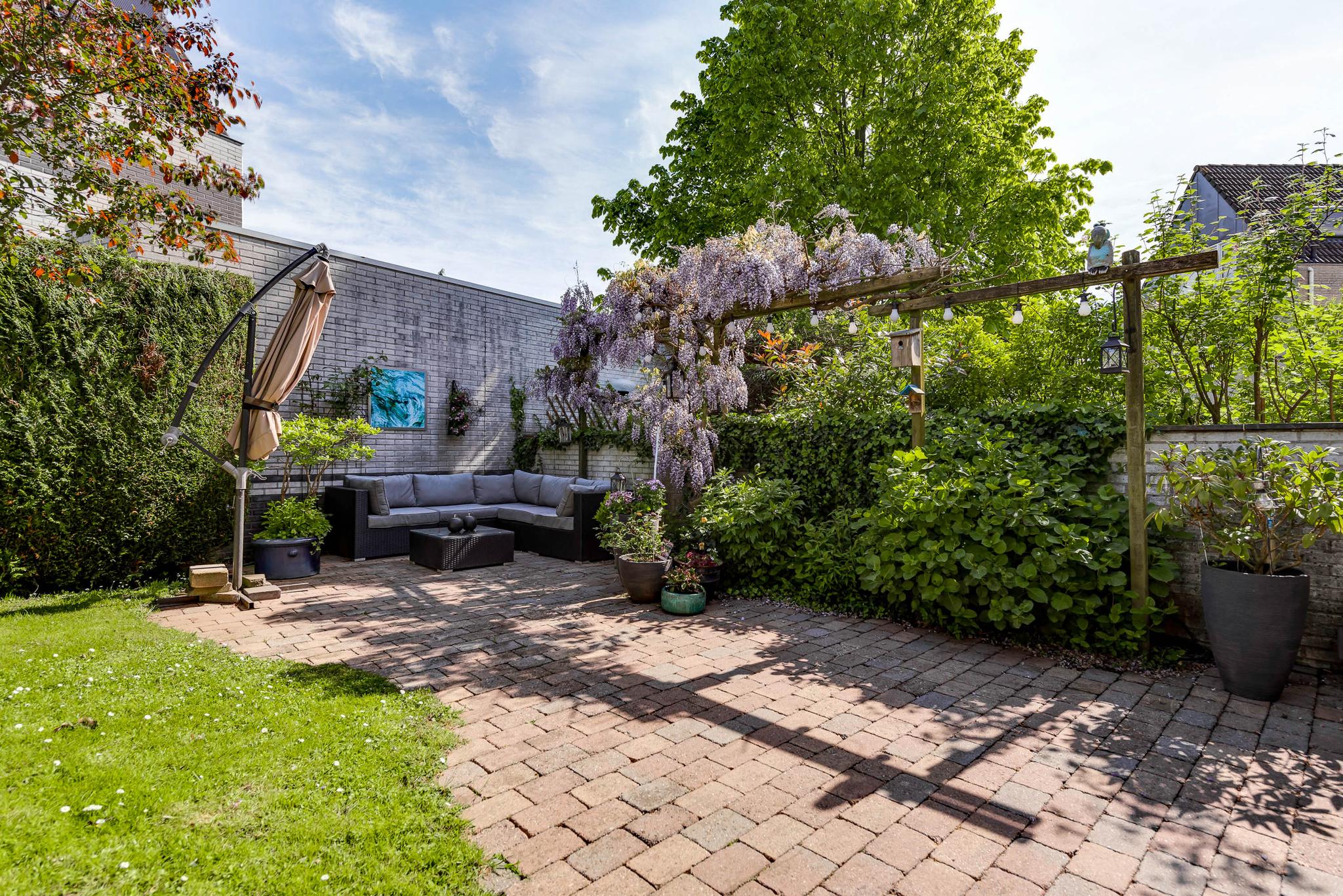De voor- zij- en achtertuin zijn fraai aangelegd met gevarieerde beplanting, terrassen en grind. Bij de keuze van beplanting is het uitgangspunt geweest om een onderhoudsvriendelijke tuin te realiseren. Een hoge groene haag met poort aan de voorzijde zorgt voor privacy in de zij- en achtertuin en er zijn meerdere plekken om buiten te zitten. De tuin is gesitueerd op het Noordwesten.