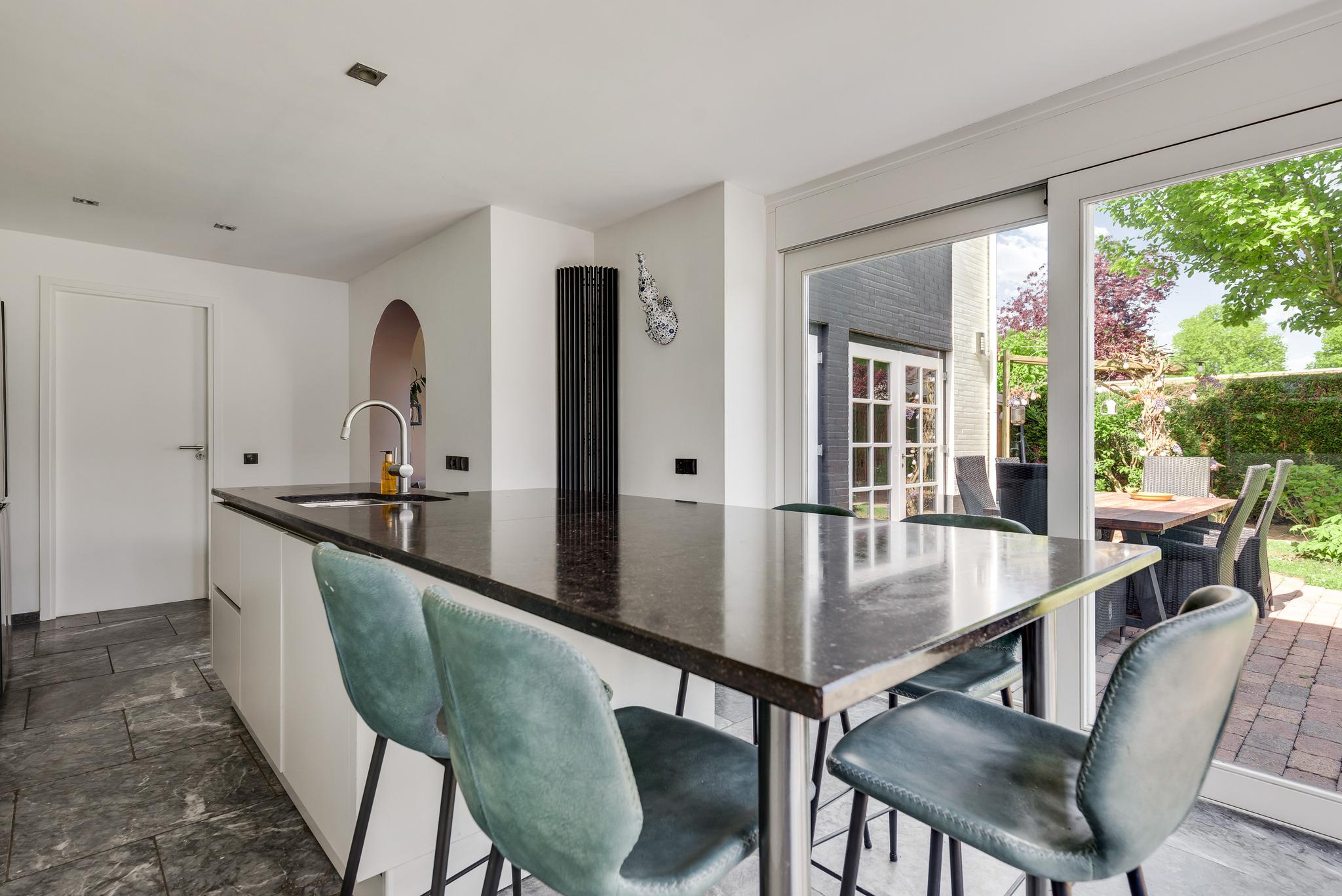 Een hardhouten deur verbindt de hal met de ruime woon/eetkamer circa 45 m2. Bij de tv-hoek/woonkamer is een houtkachel gesitueerd. Het eetgedeelte met ruimte voor een lange tafel bevindt zich ten hoogte van de achtergevel, vanuit het eetgedeelte heeft men middels twee openslaande tuindeuren direct toegang tot de riante tuin met achterom en een ruime overdekte buitenruimte/overkapping in de zij tuin. De aanbouw is fraai ingedeeld als open keuken met een oppervlakte van circa 23 m2, de twee schuifpuien zorgen voor veel lichtinval en optimaal tuincontact.