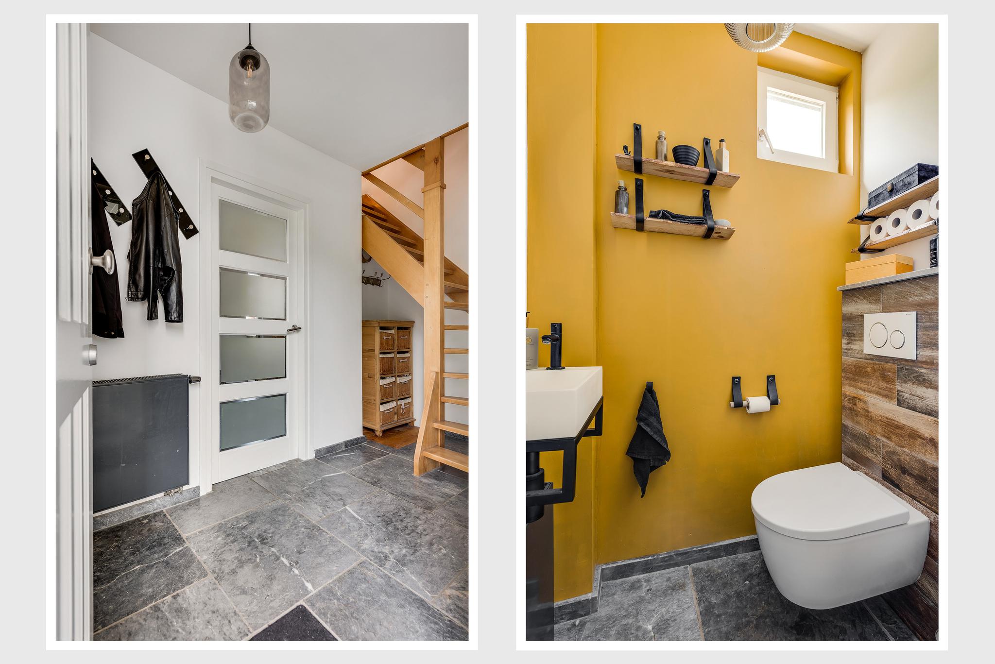 Via de overdekte hardhouten voordeur is de mooie ontvangsthal (1,80 x 4,20) met trapopgang te bereiken. De natuurstenen vloer met vloerverwarming ligt op bijna de hele begane grond, en aan de voorzijde, naast de meterkast, is de moderne toiletruimte met fonteintje. Rechts van de hal is de inpandig te bereiken, garage (3,31 x 2,68) met de opstelling van de HR-ketel (Vaillant Ecotec Plus bwj. 2021 eigendom)en twee openslaande houten deuren naar de oprit.