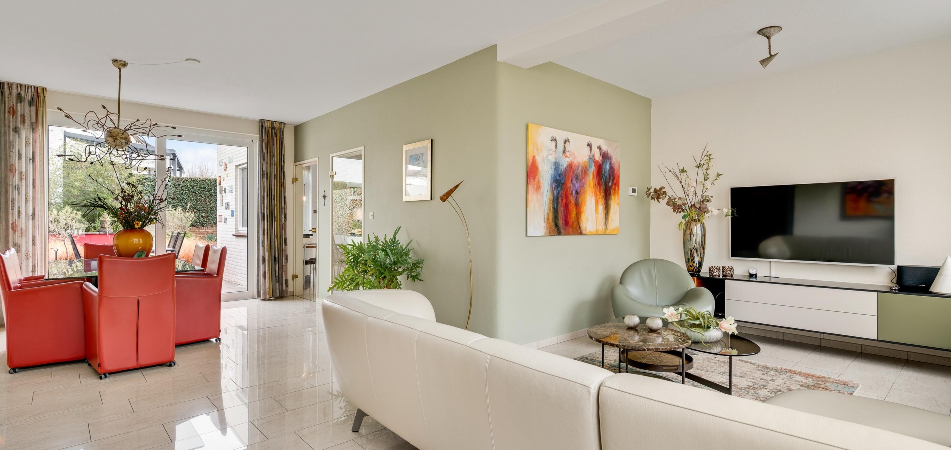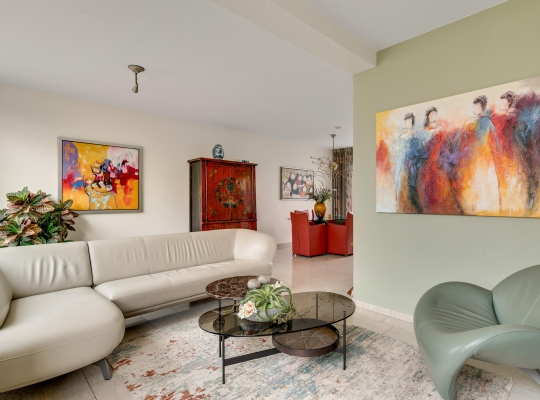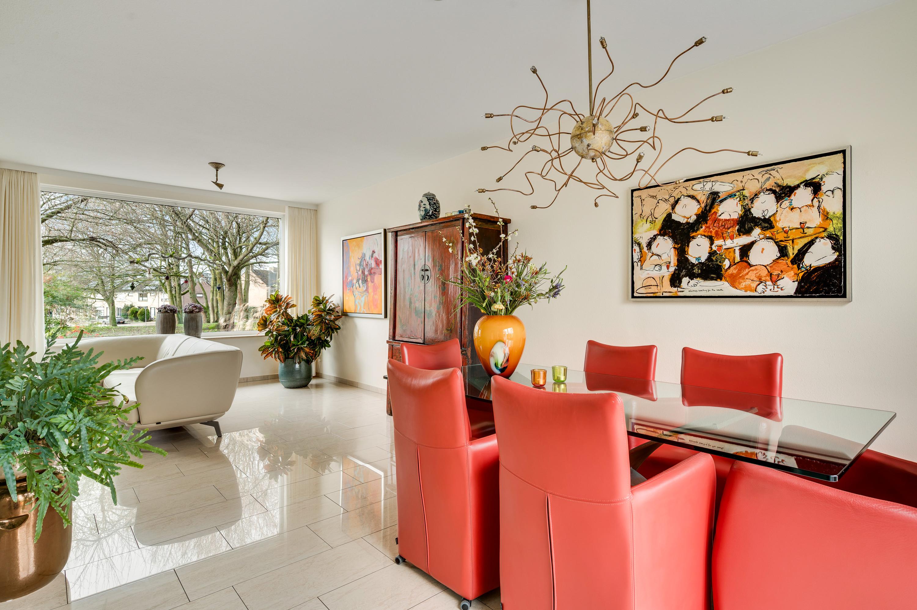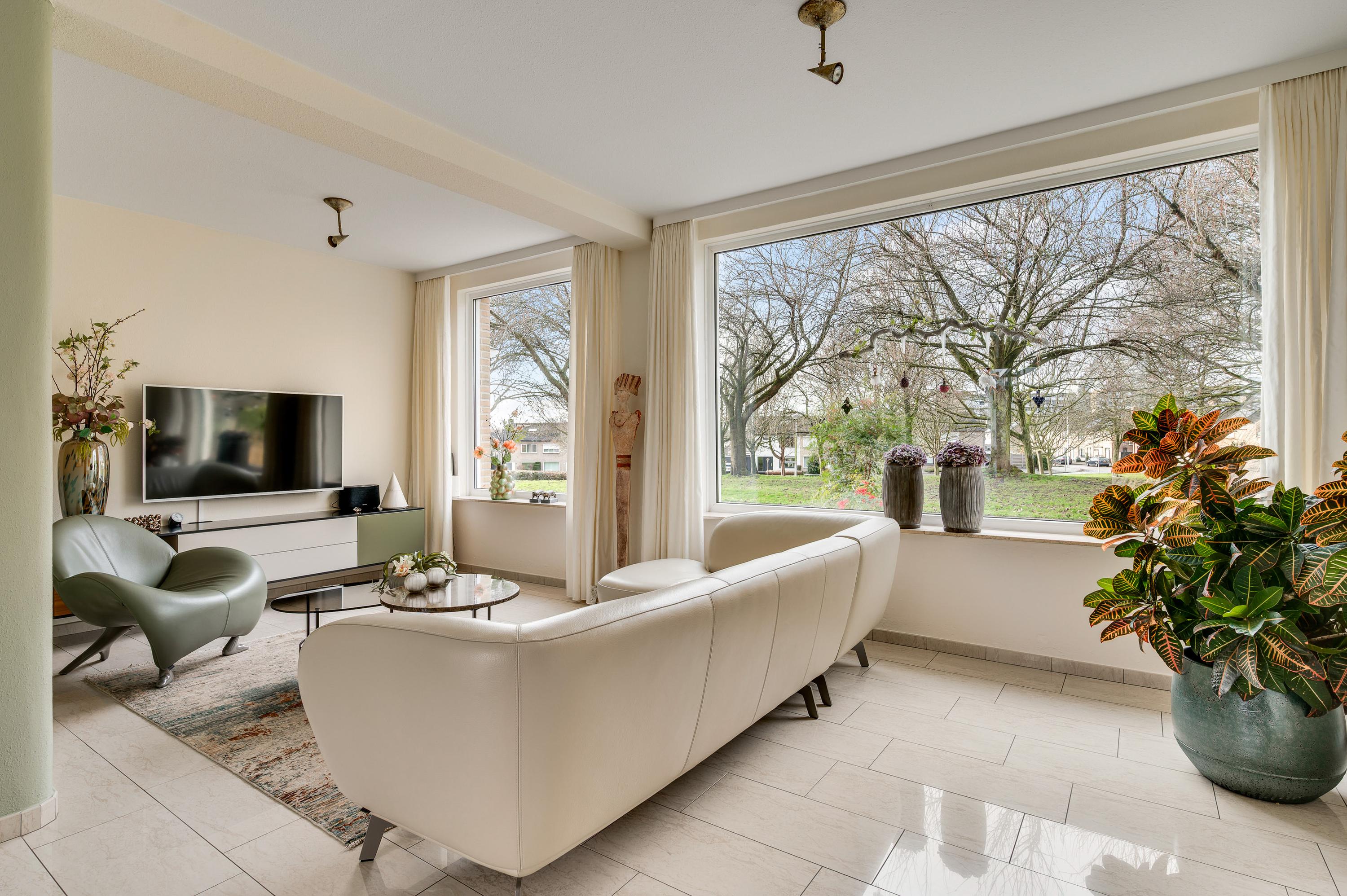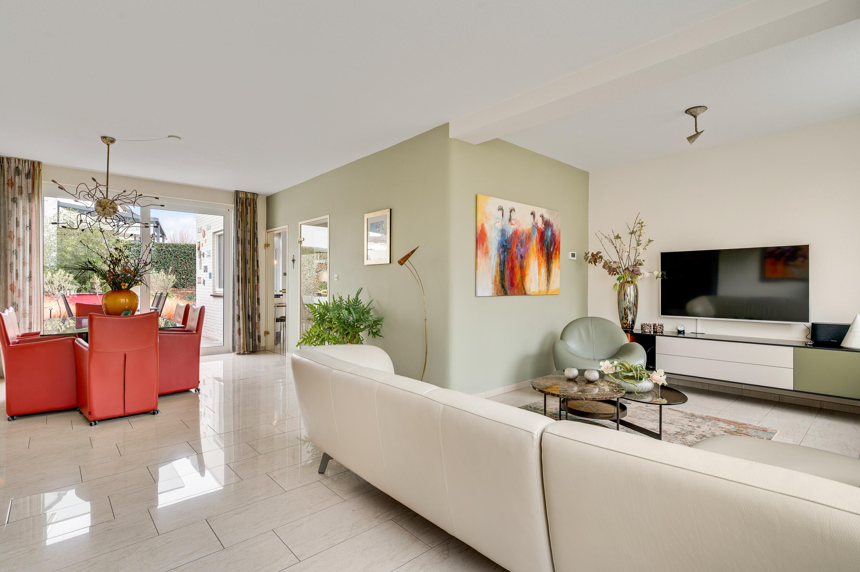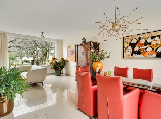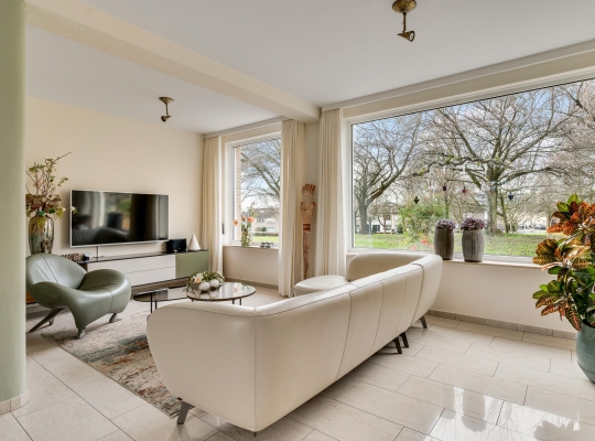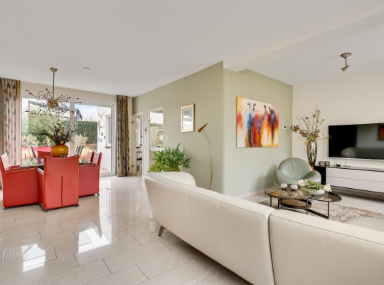 De L-vormige woonkamer (circa 35 m2) is een fijne leefruimte, met een royaal zitgedeelte aan de voorzijde, Het uitzicht naar het plantsoen met hoge bomen is om in te lijsten. Bij het eetgedeelte, met ruimte voor een 6-persoonstafel, zorgt een grote schuifpui voor een optimale verbinding met de tuin. Wat opvalt in de woonkamer is de lichtinval, dankzij de gunstige oost-westligging.