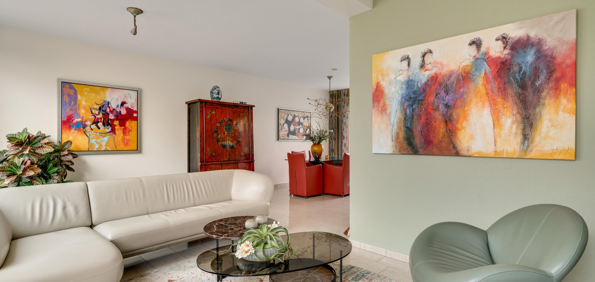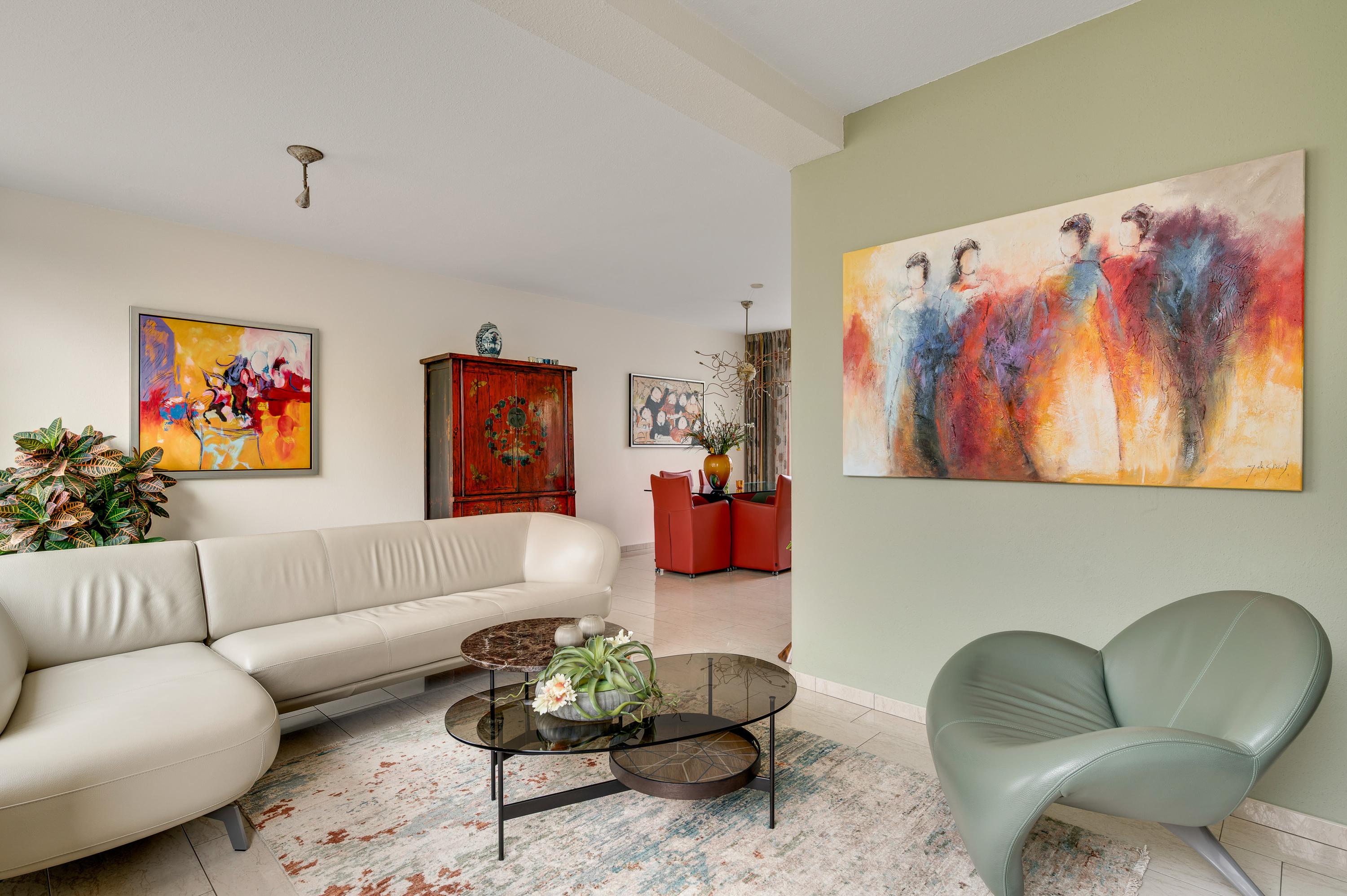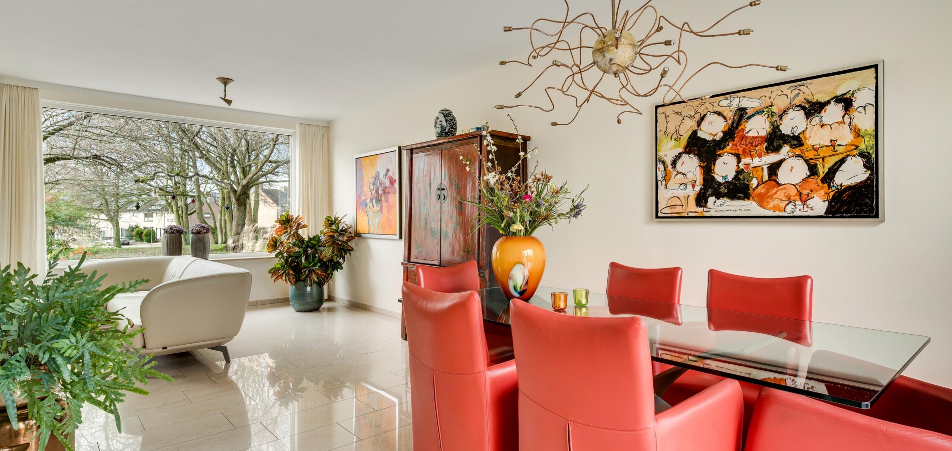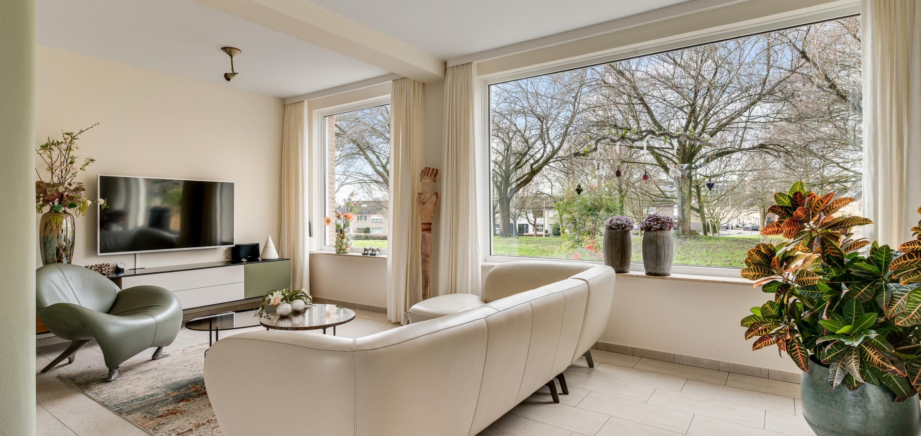 De L-vormige woonkamer (circa 35 m2) is een fijne leefruimte, met een royaal zitgedeelte aan de voorzijde, Het uitzicht naar het plantsoen met hoge bomen is om in te lijsten. Bij het eetgedeelte, met ruimte voor een 6-persoonstafel, zorgt een grote schuifpui voor een optimale verbinding met de tuin. Wat opvalt in de woonkamer is de lichtinval, dankzij de gunstige oost-westligging.