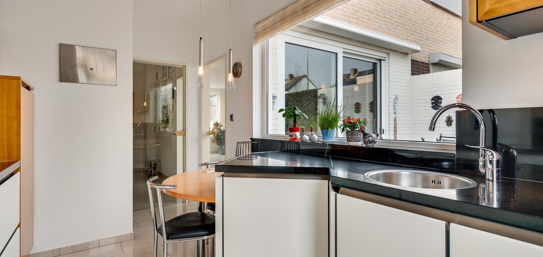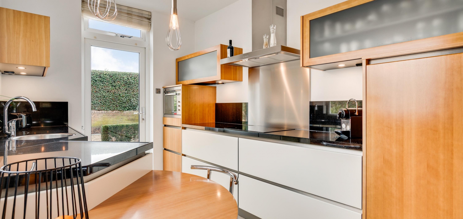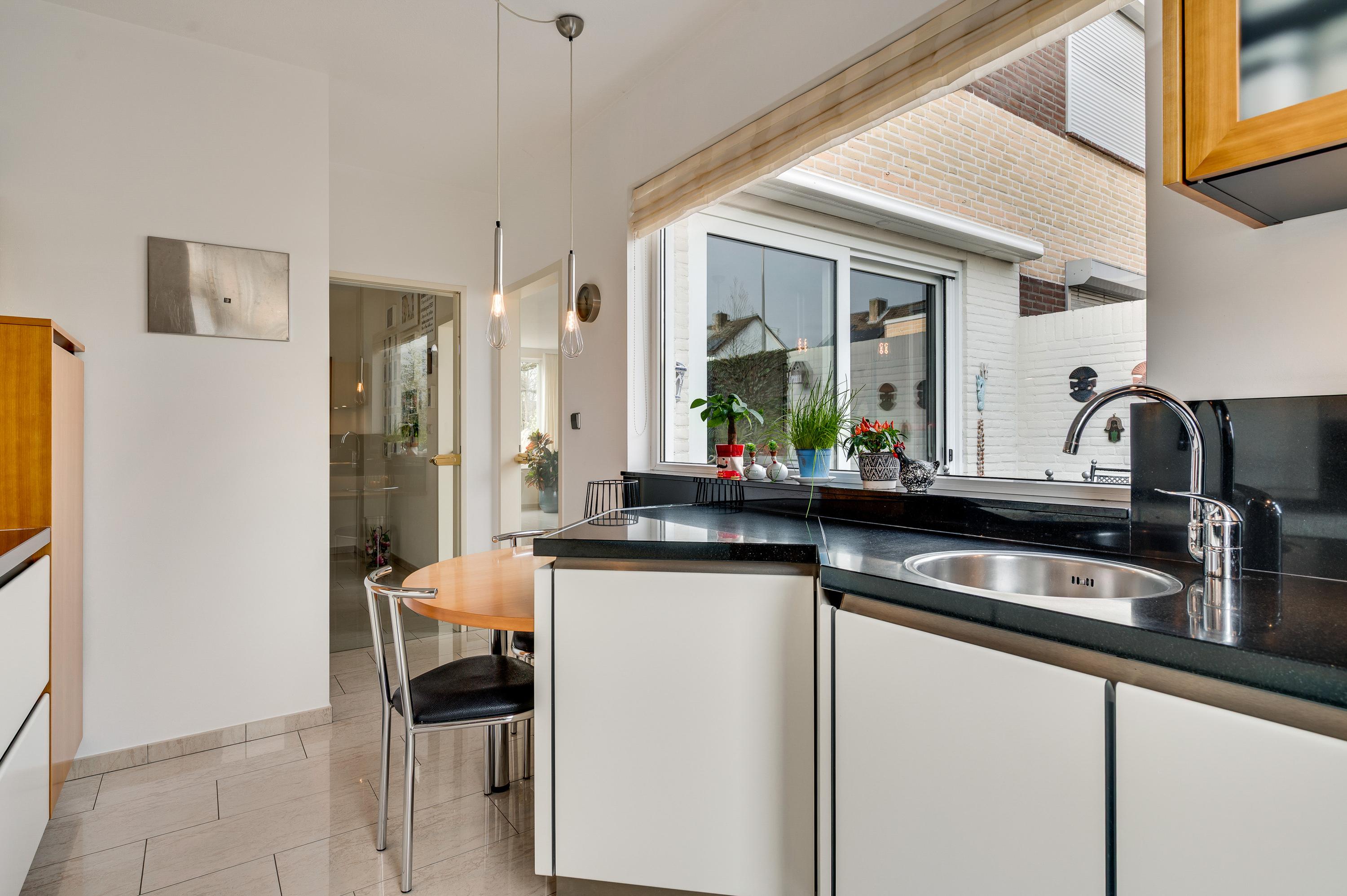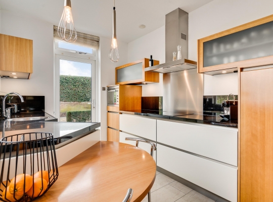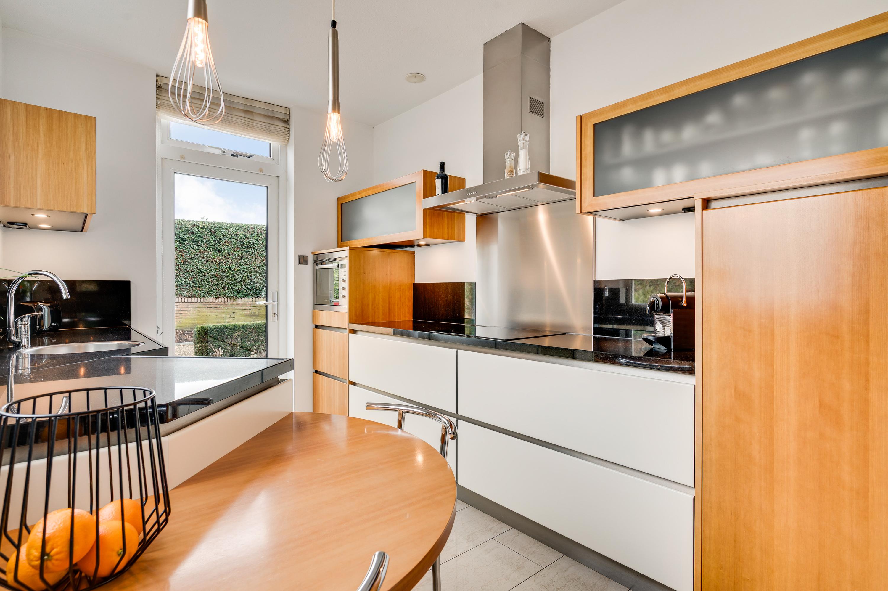 Vanuit de hal en woonkamer is er toegang tot de keuken (circa 9,7 m2). Wat opvalt is de speelse indeling van deze ruimte, met een vaste ontbijttafel en een hoogwaardige keukenopstelling. De aanrechtbladen zijn van natuursteen en de inductie kookplaat, afzuigkap, oven, vaatwasser en koelkast met vriesvak zijn ingebouwd.