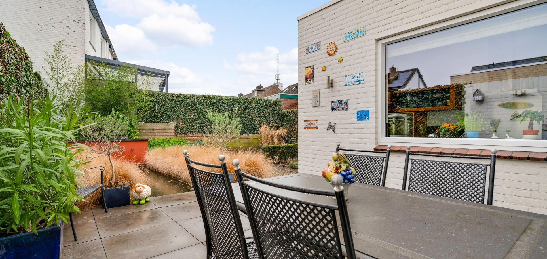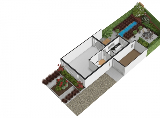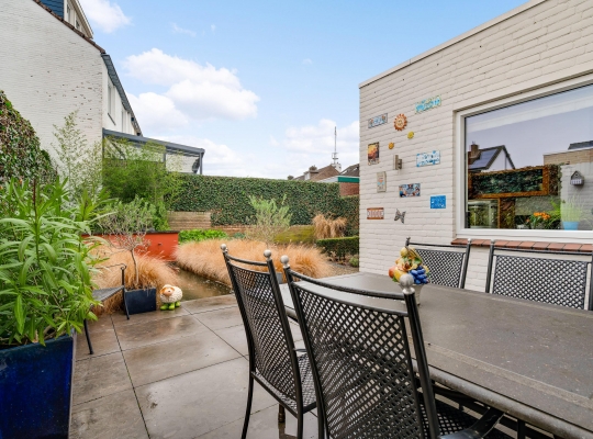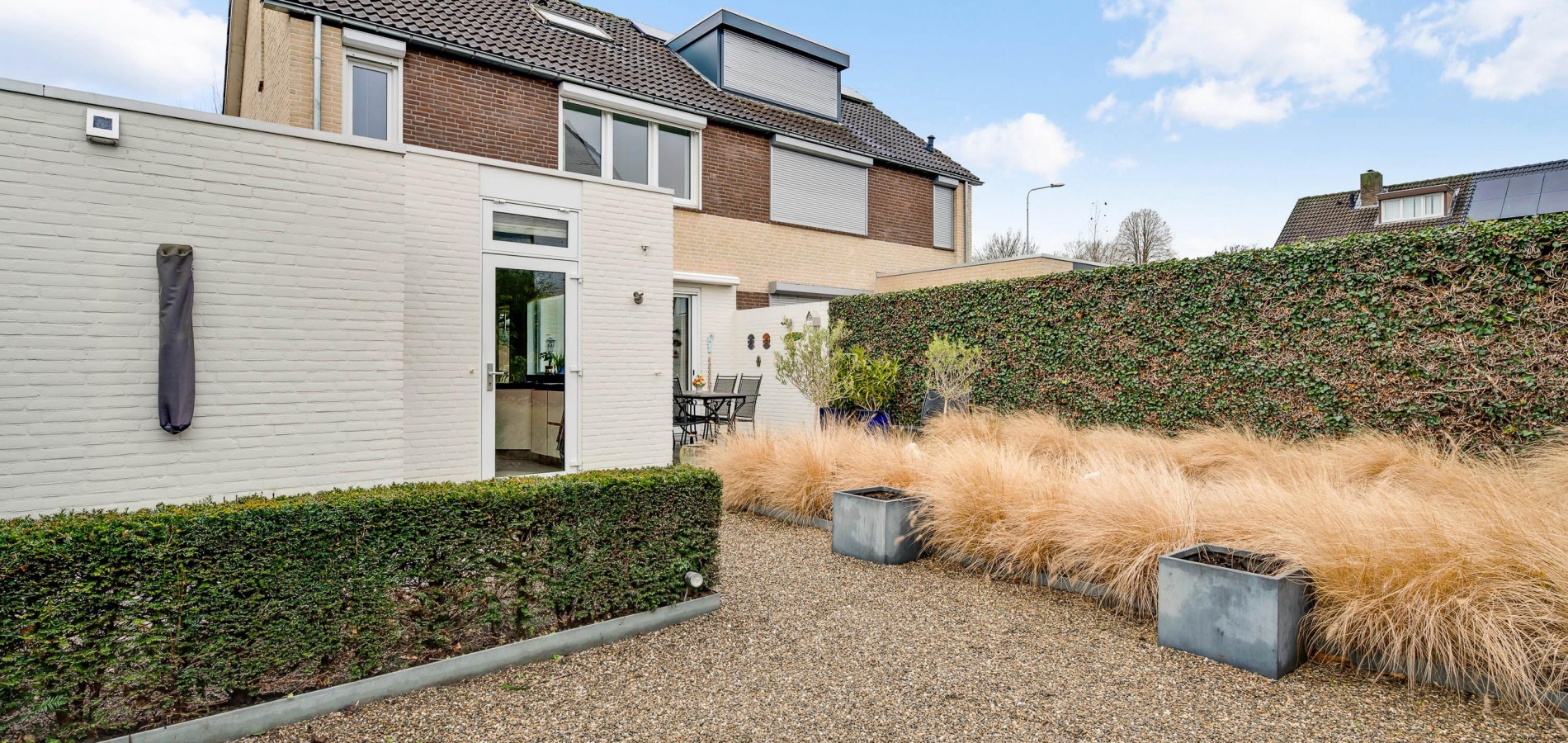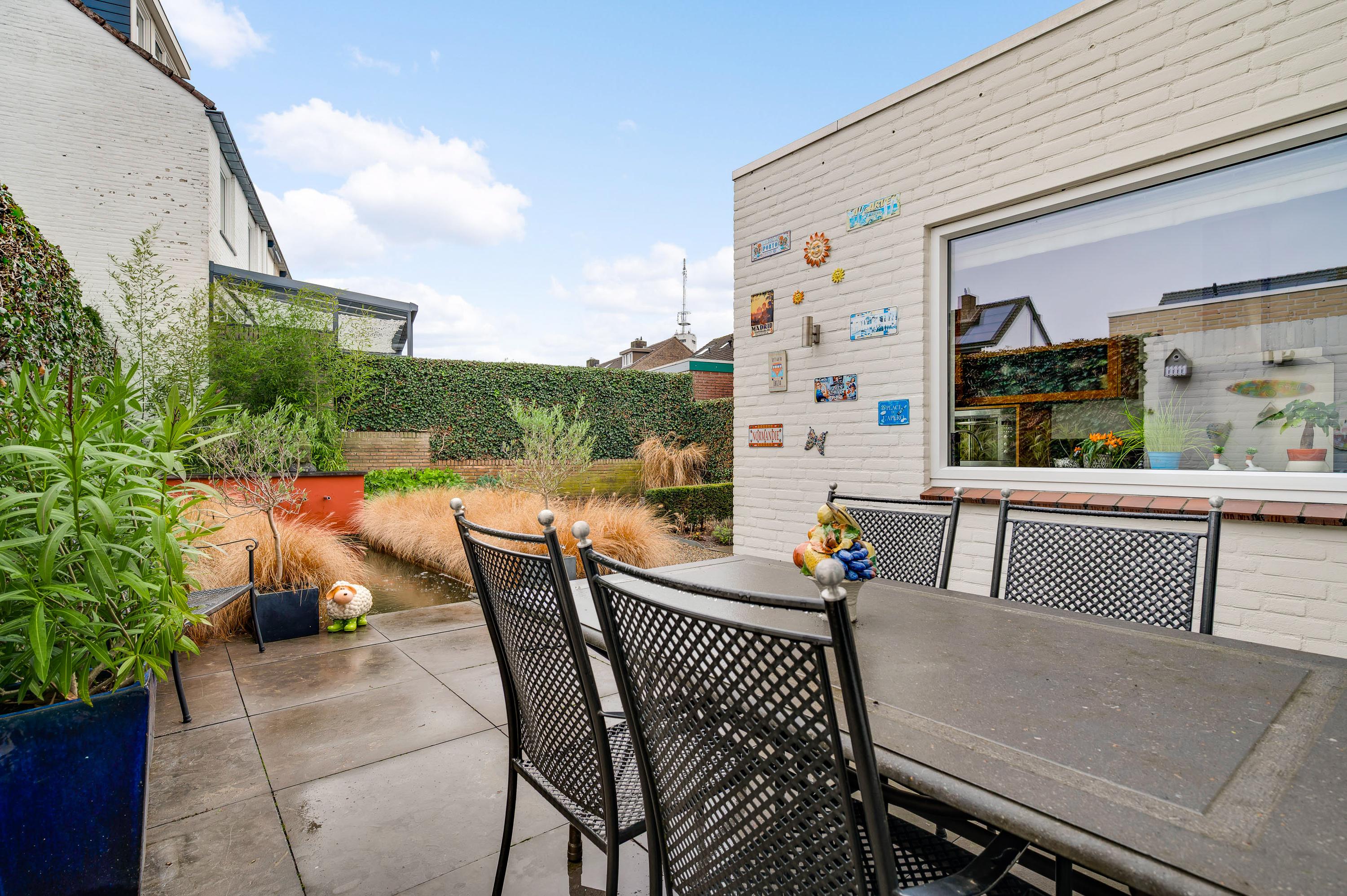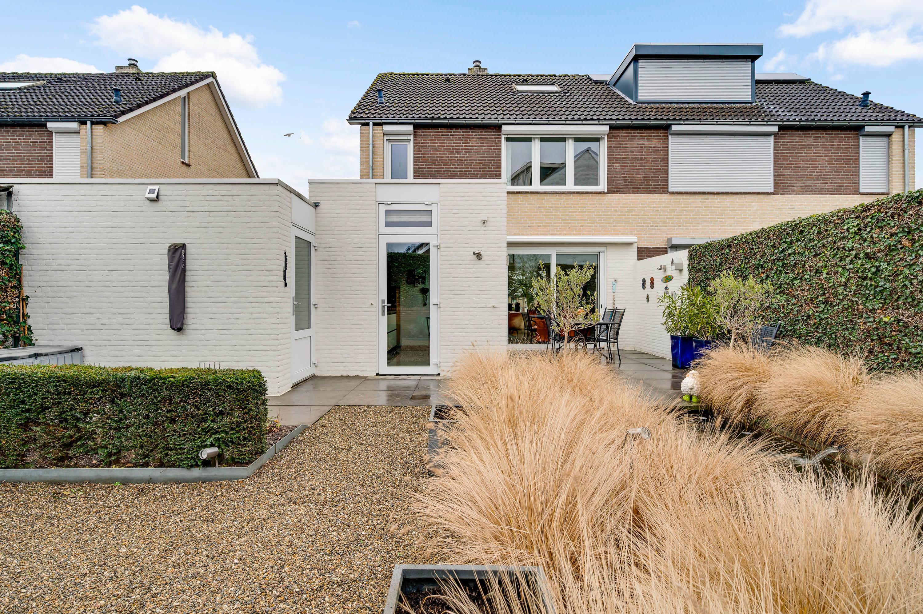Strakke lijnen en mooie beplanting bepalen de sfeer in de voor- en achtertuin. De voortuin is gesitueerd op het westen en de achtertuin op het oosten. Een deel van de beplanting is groenblijvend en boven het grote terras hangt een zonnescherm.