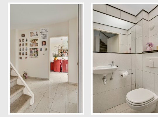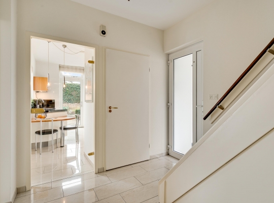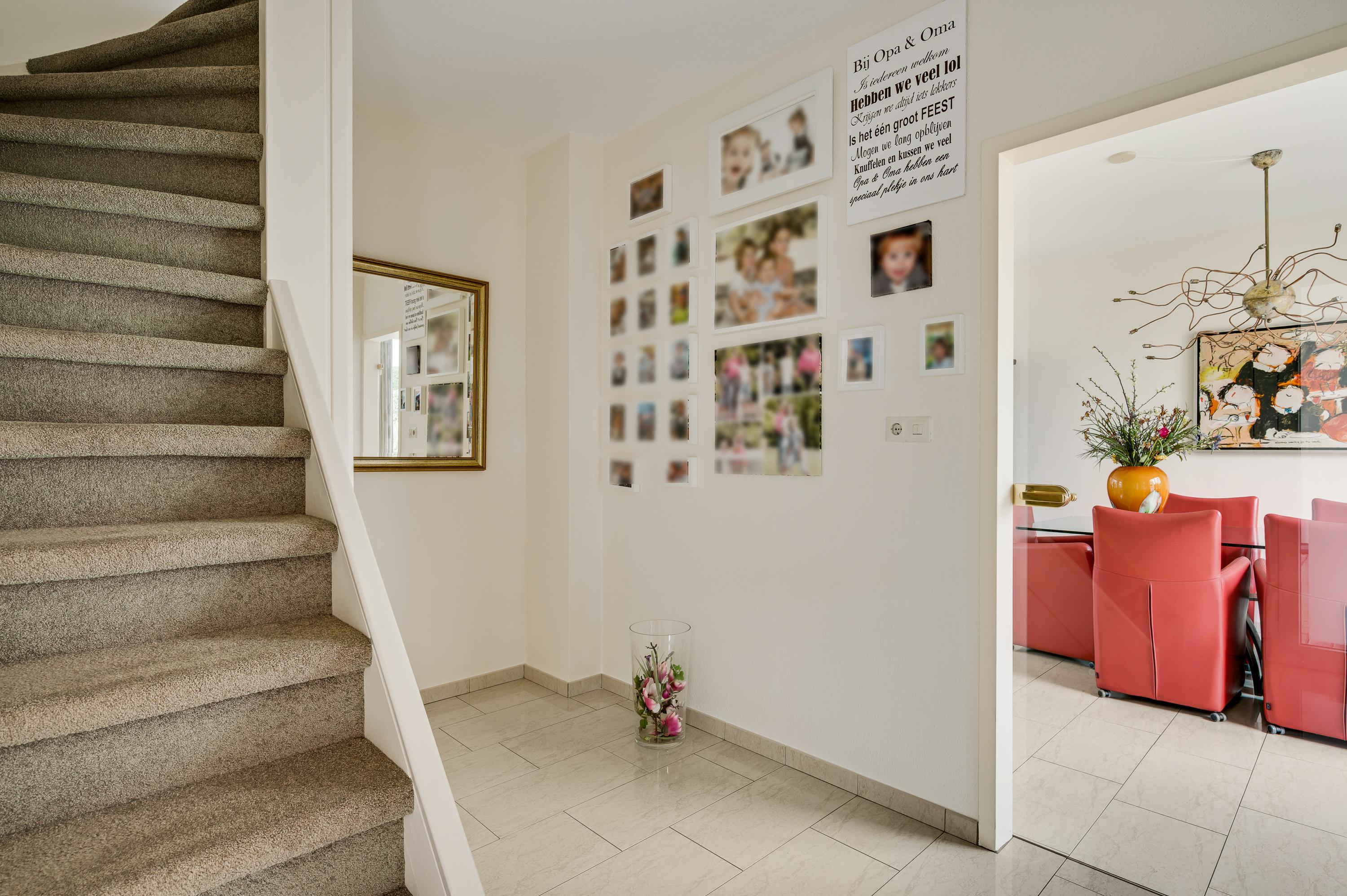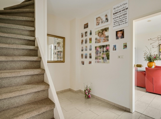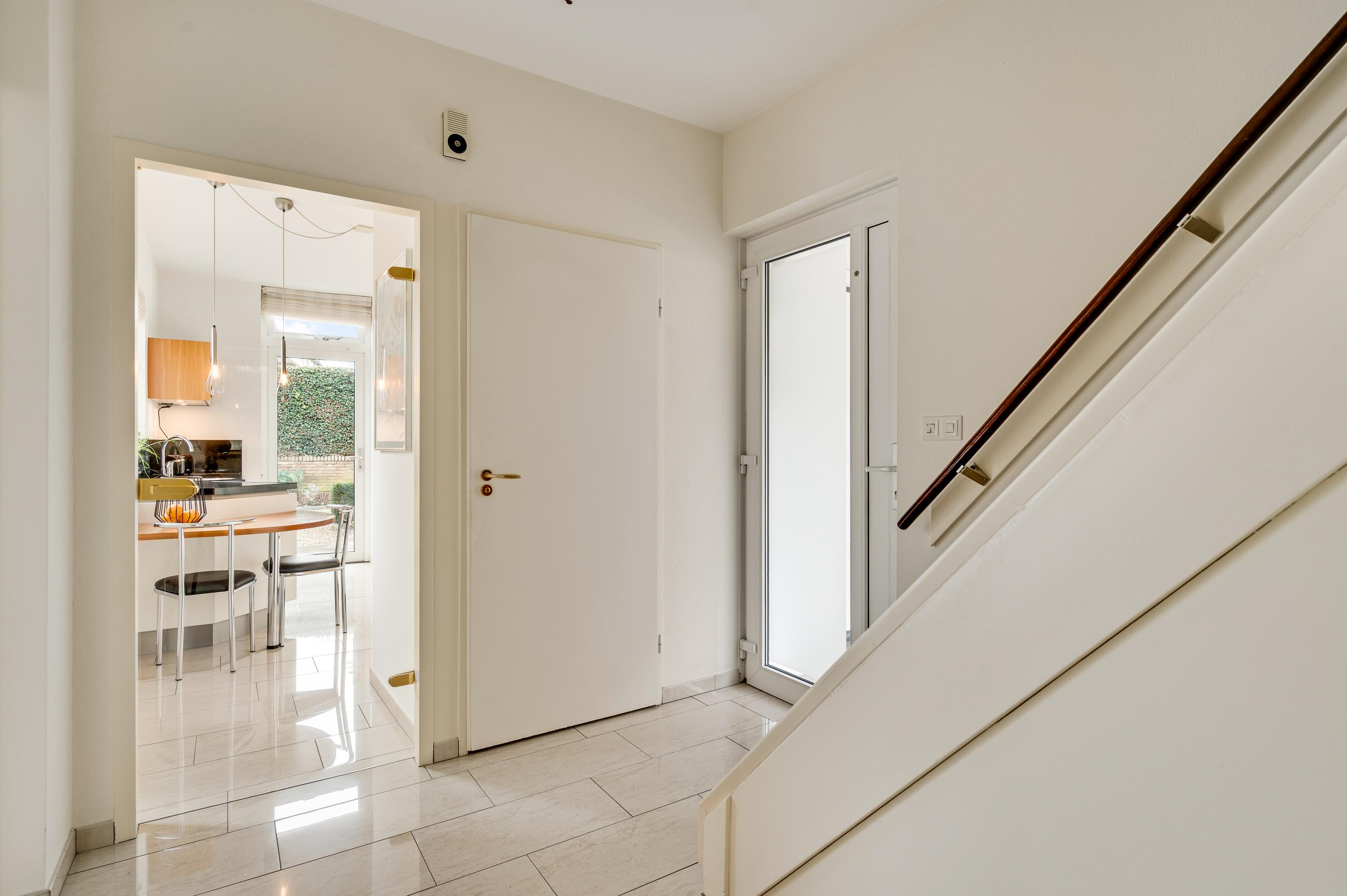 Bij de overkapping is de voordeur die, net als de kozijnen van het huis, is uitgevoerd in kunststof. In de hal (circa 3,35 x 2,42) zijn de trapopgang, een bergkast en de toiletruimte met fonteintje. Via de glazen binnendeuren valt veel licht naar binnen en onder de lichte tegelvloer ligt vloerverwarming.