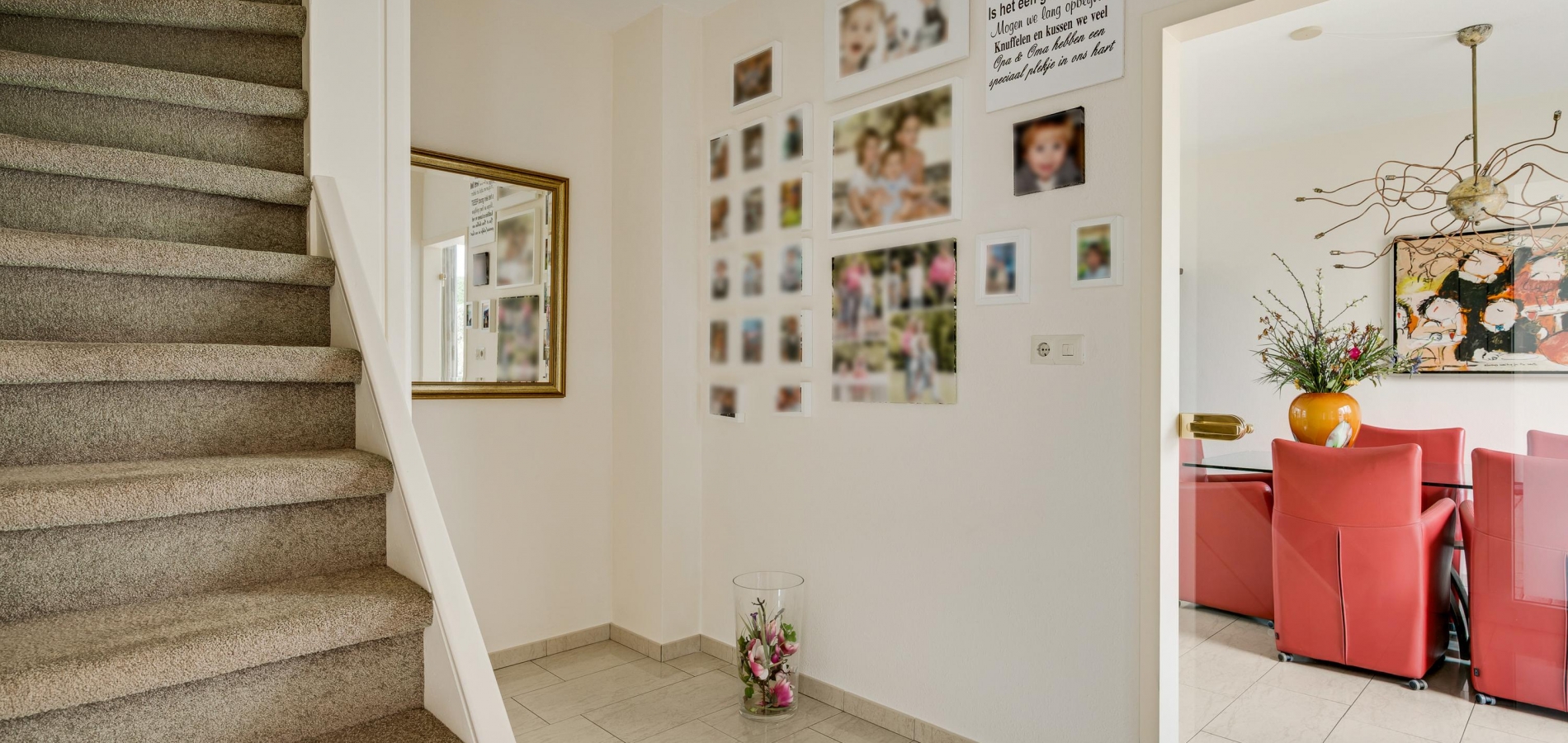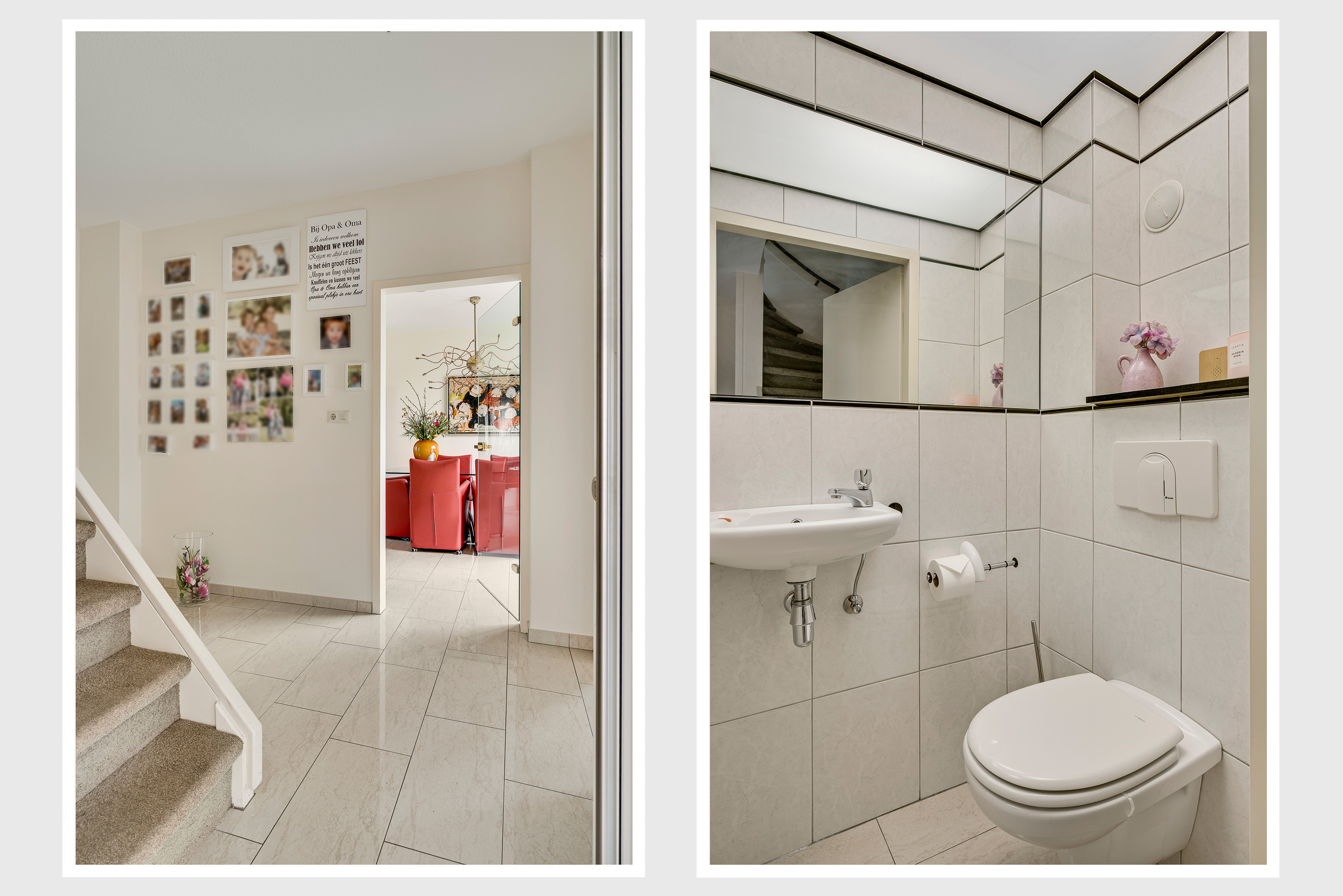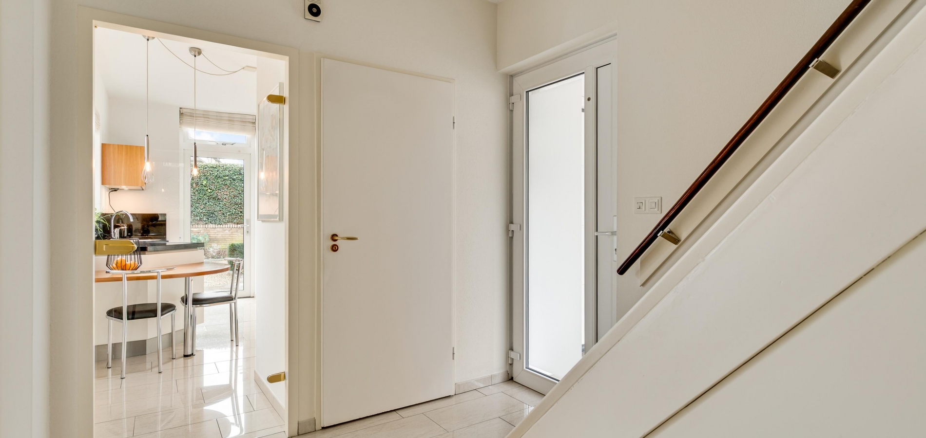 Bij de overkapping is de voordeur die, net als de kozijnen van het huis, is uitgevoerd in kunststof. In de hal (circa 3,35 x 2,42) zijn de trapopgang, een bergkast en de toiletruimte met fonteintje. Via de glazen binnendeuren valt veel licht naar binnen en onder de lichte tegelvloer ligt vloerverwarming.