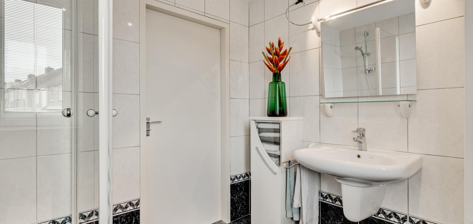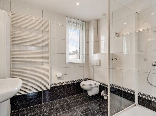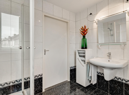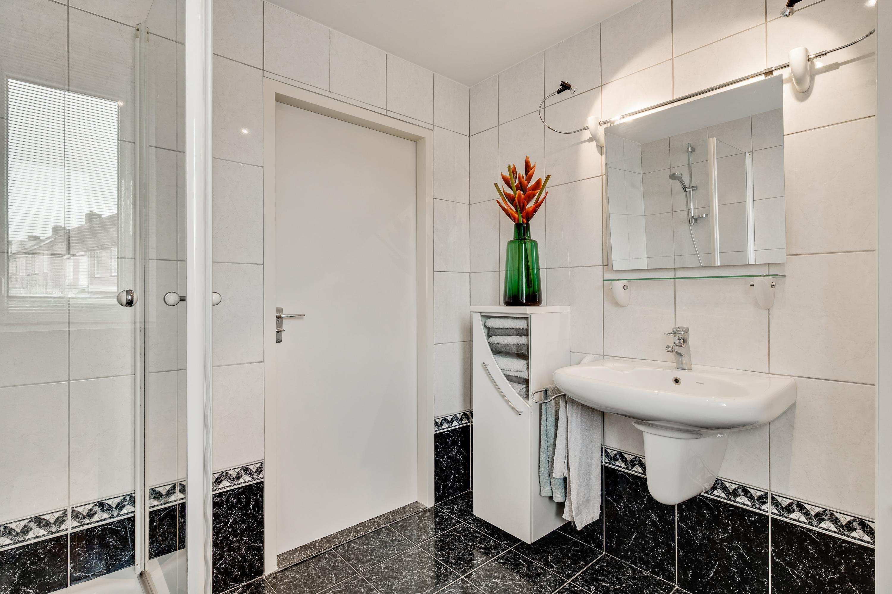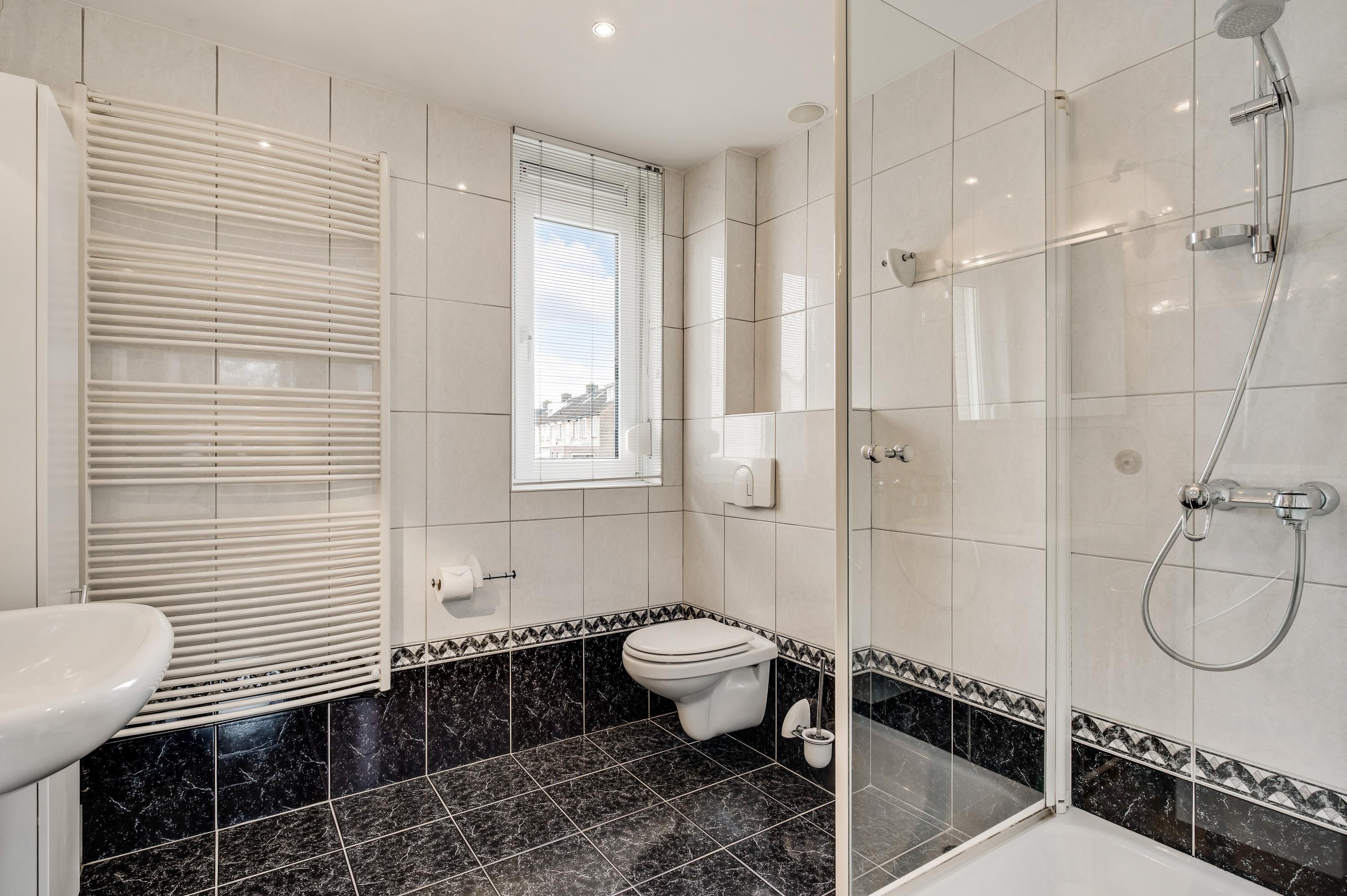 De badkamer (circa 2,46 x 2,31) is ingedeeld met een douche, een wandcloset, designradiator, een wastafel en twee badkamerkasten. Zowel de wanden als de vloer zijn geheel betegeld en het plafond is voorzien van inbouwverlichting.