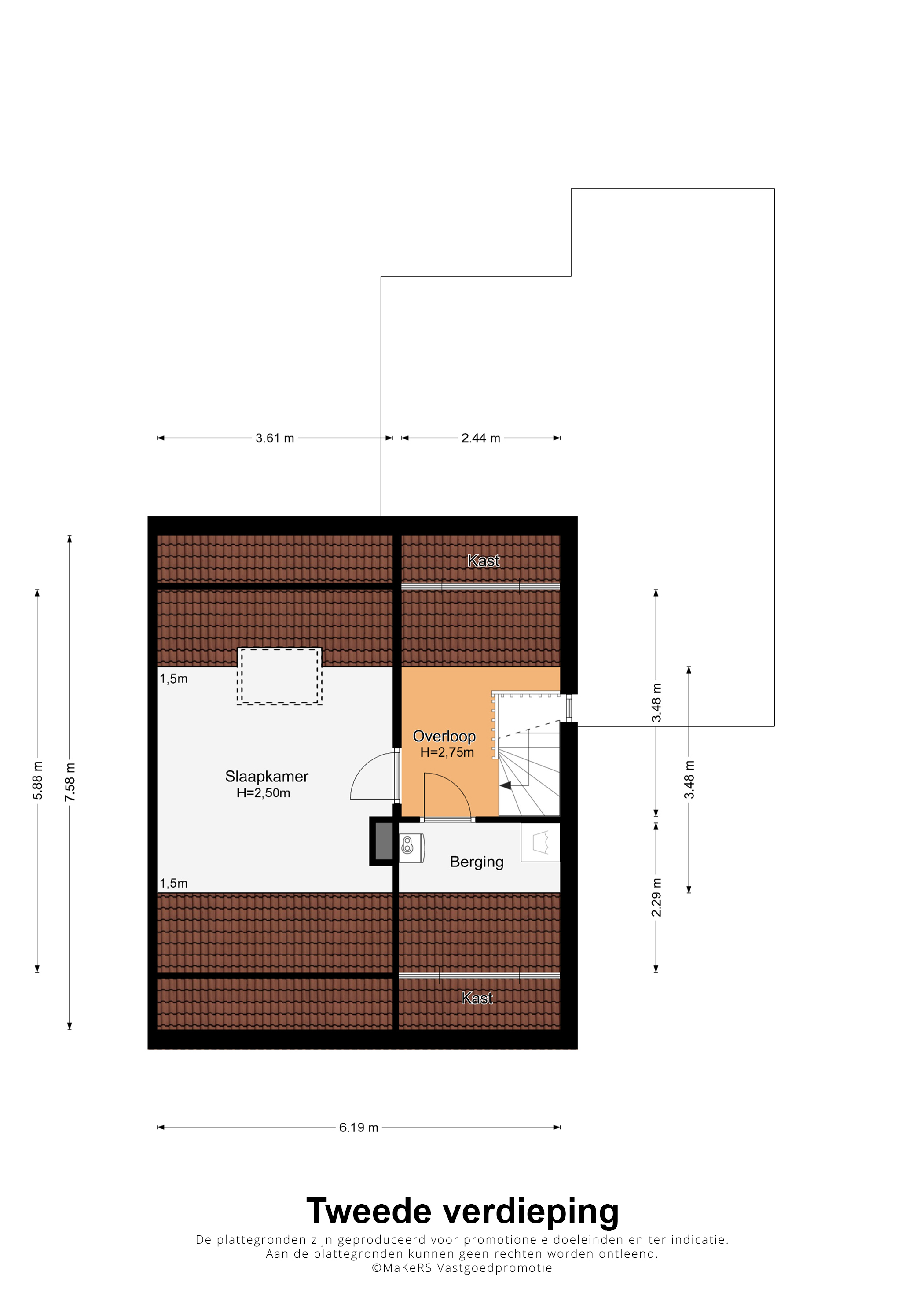 Er is een vaste trap naar de tweede verdieping, met een nokhoogte van circa 2,75 meter. De overloop heeft een raam in de zijgevel en aan de voorzijde is een berging, met plek voor de wasapparatuur. In deze ruimte hangt de HR-ketel (Remeha, 2019, eigendom).