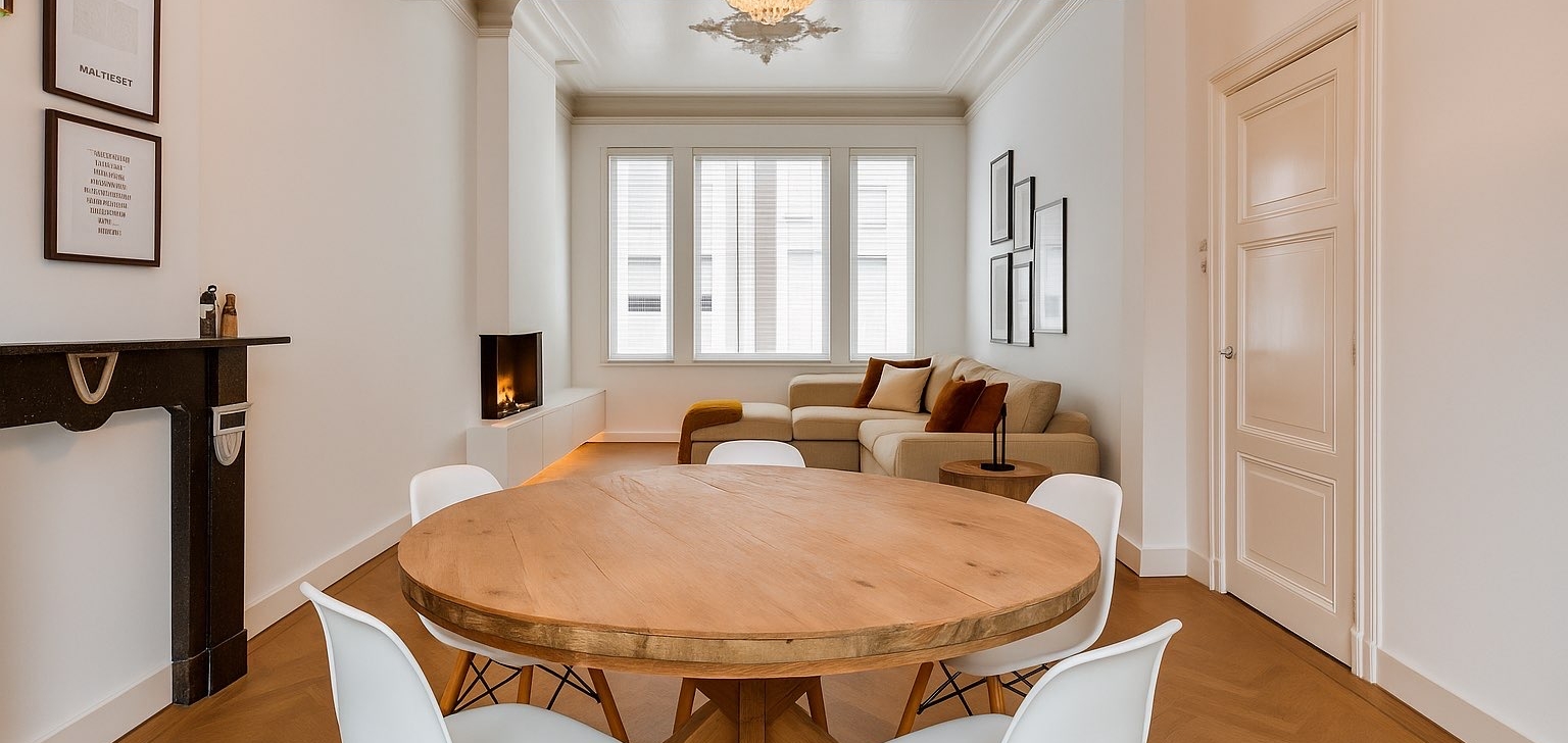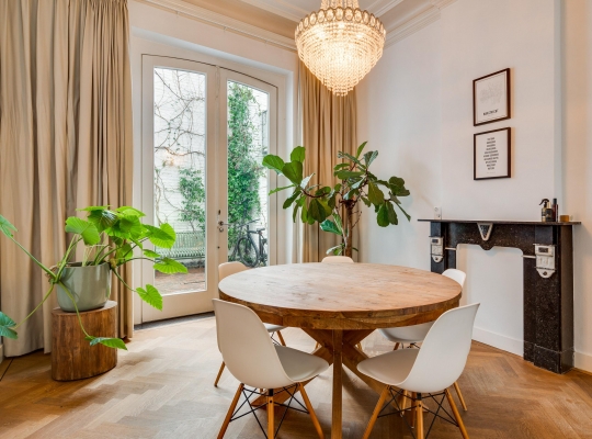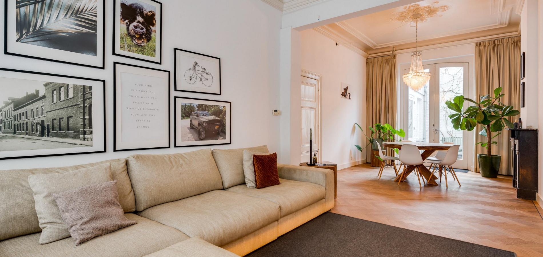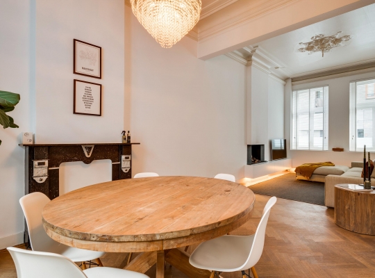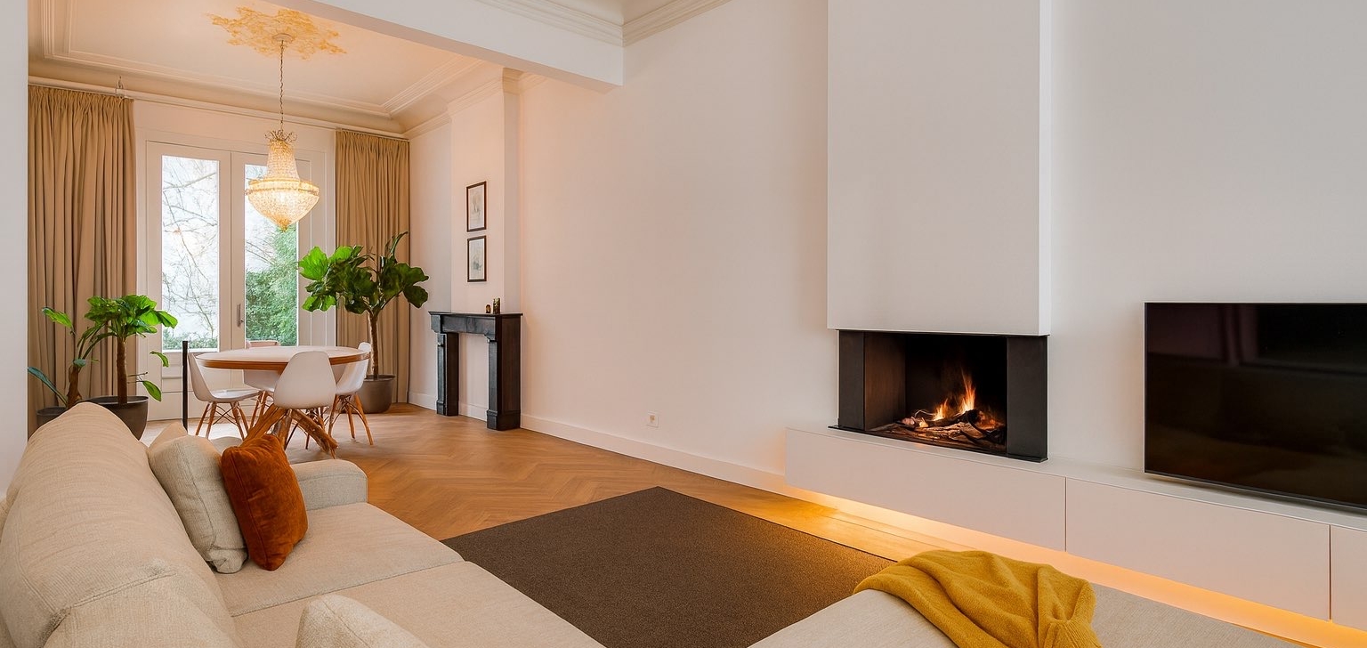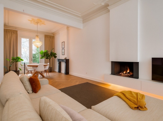Rechts in de hal is een deur naar de woonkamer (circa 9,31 x 3,66) boordevol charme, karakter en sfeer. Het zitgedeelte is aan de voorzijde, met uitzicht naar de rustige straat, en het eetgedeelte nodigt uit voor een diner met vrienden of familie. Hoge, openslaande deuren geven toegang tot de tuin en de prachtige plafonds, visgraat parketvloer, klassieke schouw en moderne gashaard met maatwerk tv-meubel mogen niet onvermeld blijven.