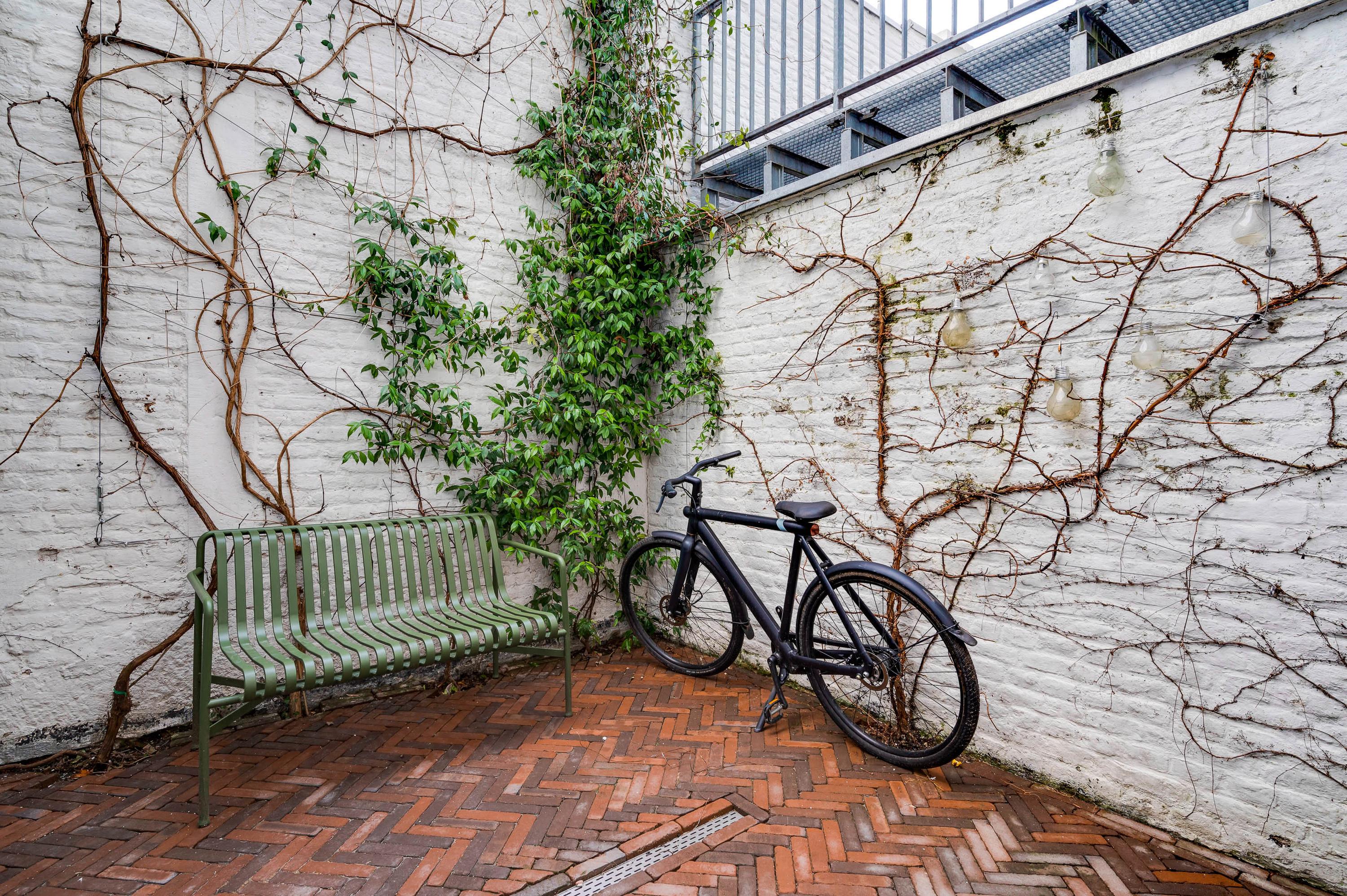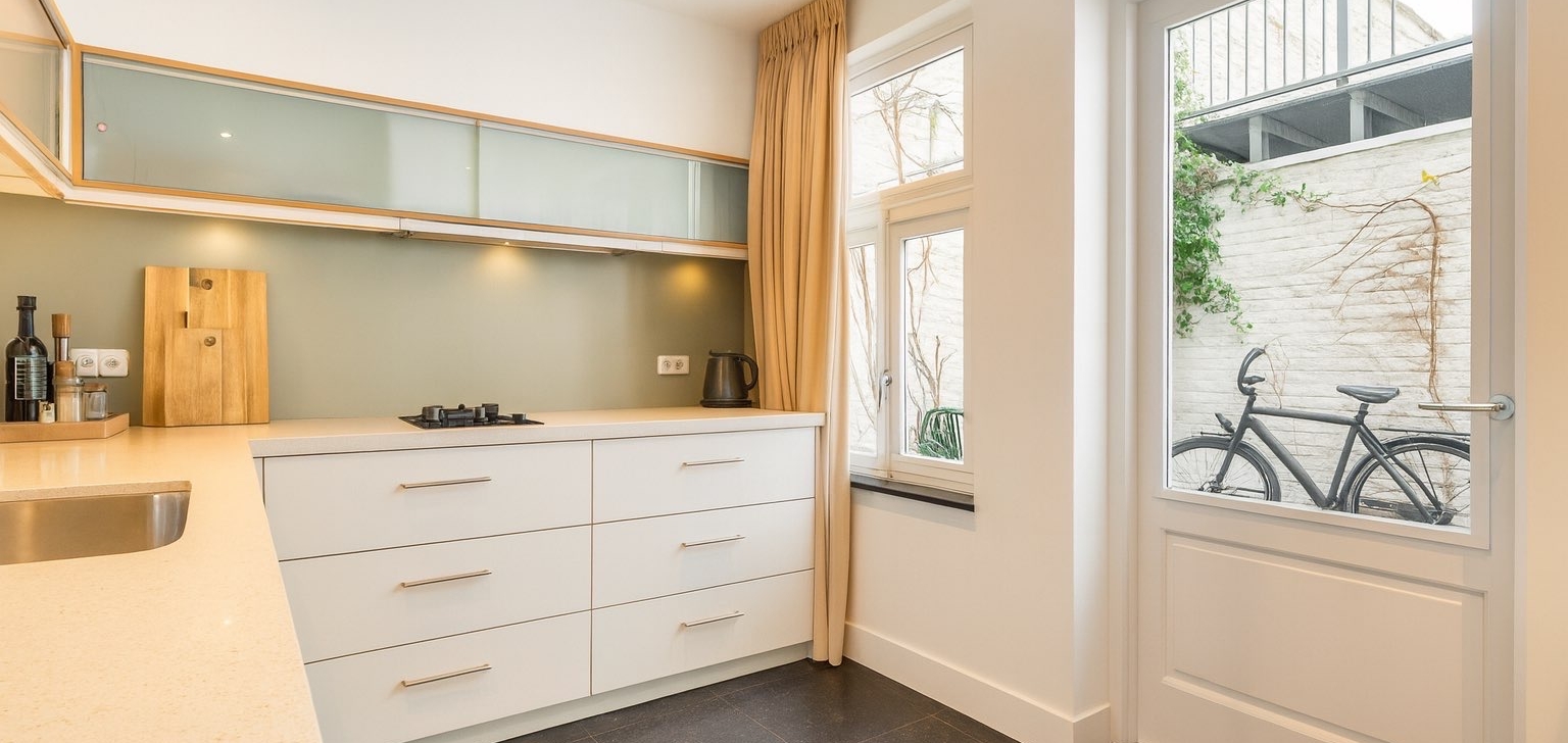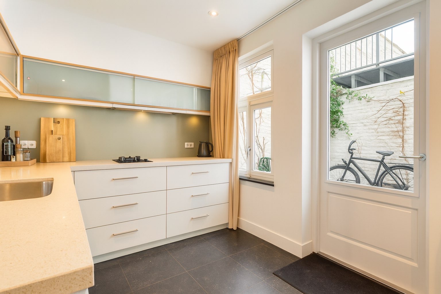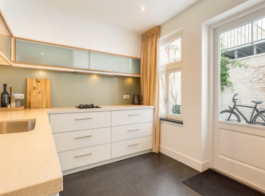 Aan de achterzijde, met toegang tot de tuin, is de keuken (circa 3,64 x 2,49) met een donkere tegelvloer. De hoekopstelling met stijlvol aanrechtblad en de halfhoge kastenwand zijn voorzien van alle benodigde inbouwapparatuur van topkwaliteit: een inductie-/gaskookplaat, afzuigkap, vaatwasser, stoomoven, combimagnetron en een dubbele koelkast met vriesvak. De stadstuin is geheel bestraat en zal, als het blad weer gaat groeien, een groene oase zijn waar u heerlijk kunt zitten.