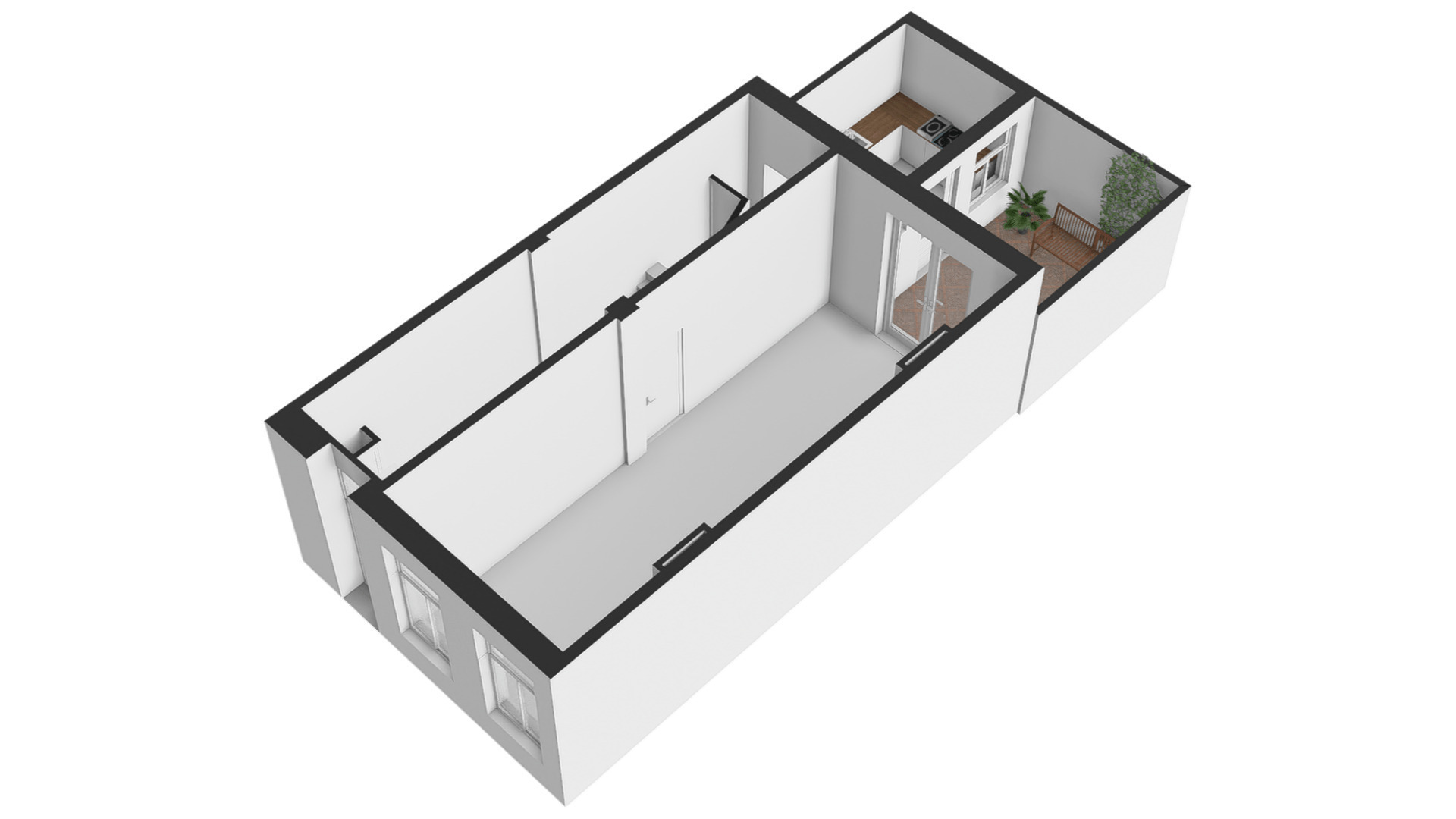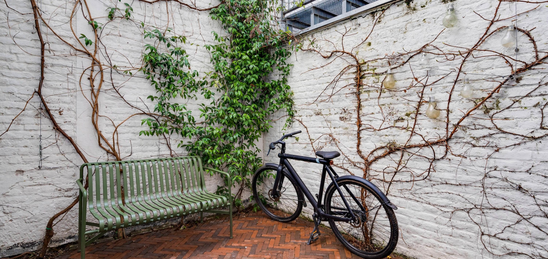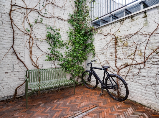 Aan de achterzijde, met toegang tot de tuin, is de keuken (circa 3,64 x 2,49) met een donkere tegelvloer. De hoekopstelling met stijlvol aanrechtblad en de halfhoge kastenwand zijn voorzien van alle benodigde inbouwapparatuur van topkwaliteit: een inductie-/gaskookplaat, afzuigkap, vaatwasser, stoomoven, combimagnetron en een dubbele koelkast met vriesvak. De stadstuin is geheel bestraat en zal, als het blad weer gaat groeien, een groene oase zijn waar u heerlijk kunt zitten.