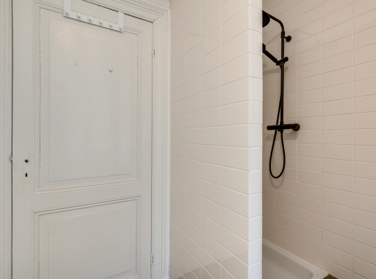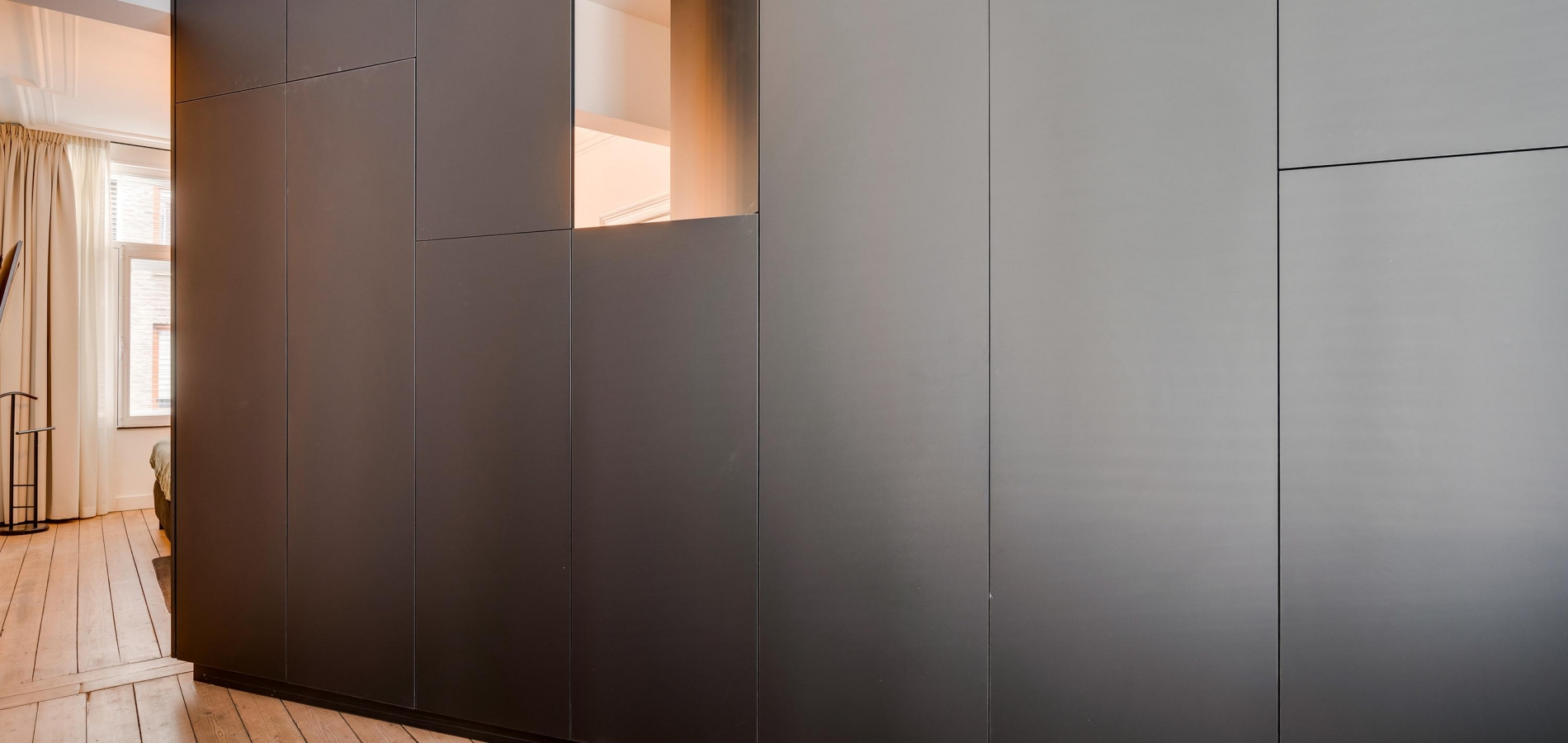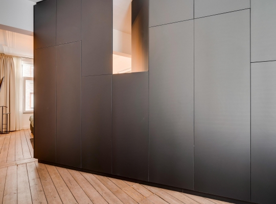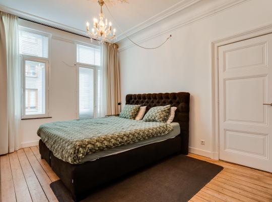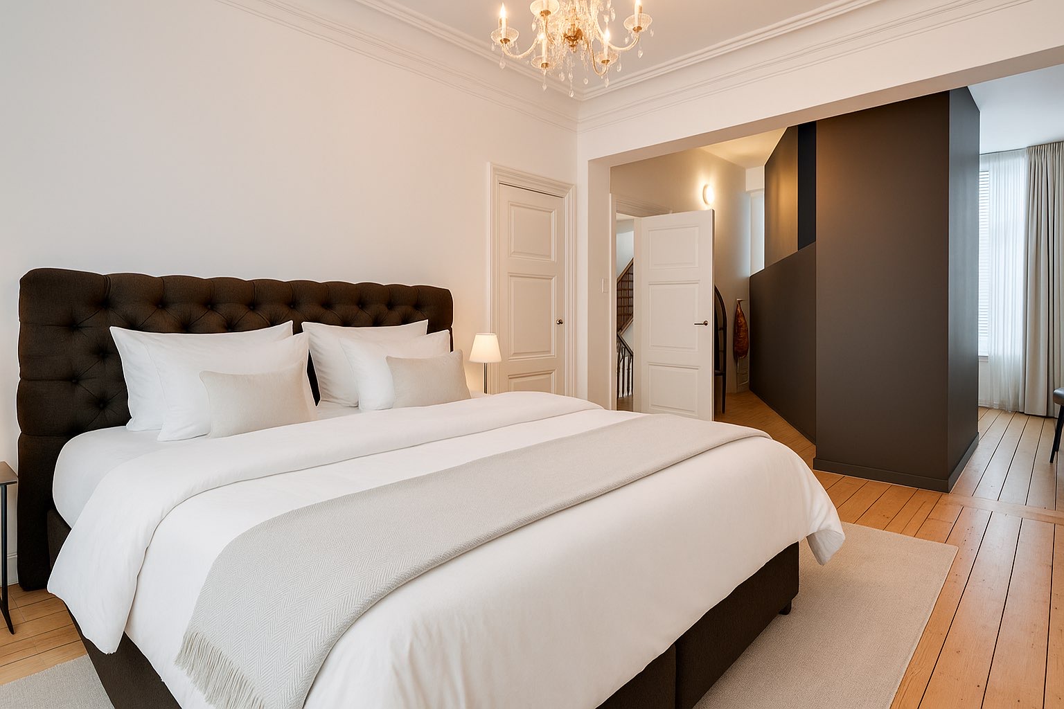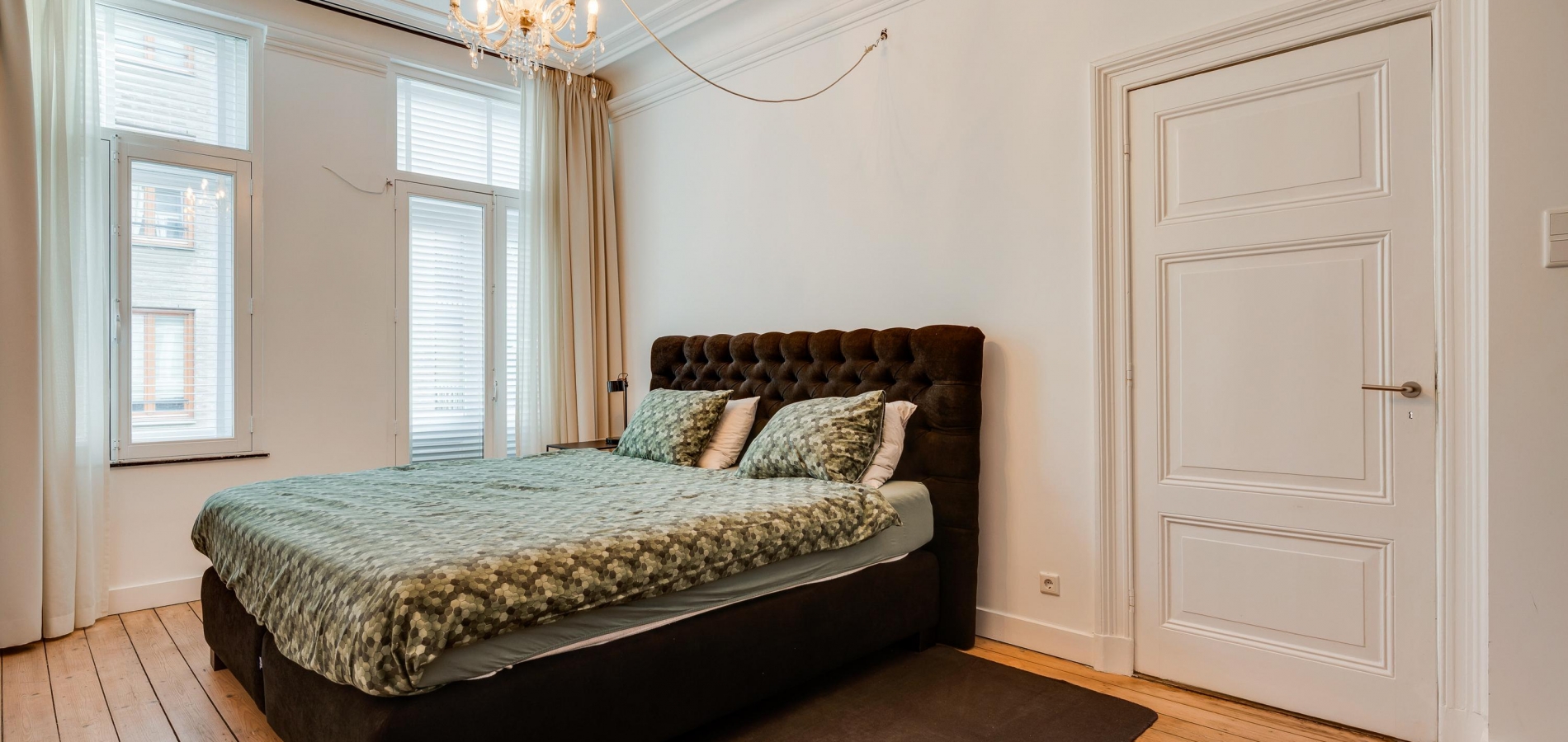 Twee slaapkamers zijn samengevoegd tot een zeer ruime master bedroom met kleedruimte, die in totaal circa 9,30 x 3,47 meter groot is. Ook hier ziet u hoge ornamentenplafonds met sierlijsten, die goed passen bij de paneeldeuren en de houten vloer. Opvallend element is het maatwerk interieur in de kleedruimte, die diagonaal in de ruimte is geplaatst.
