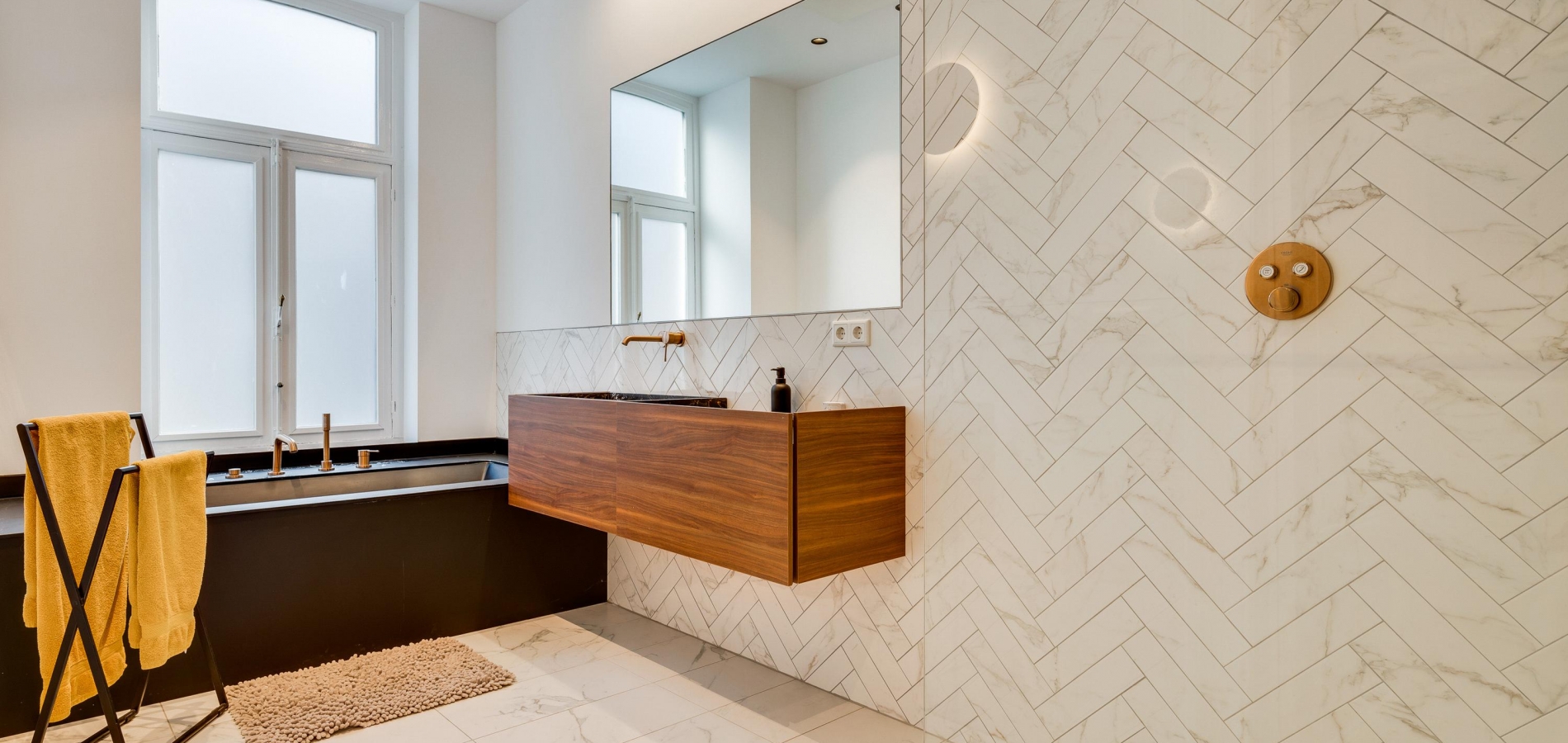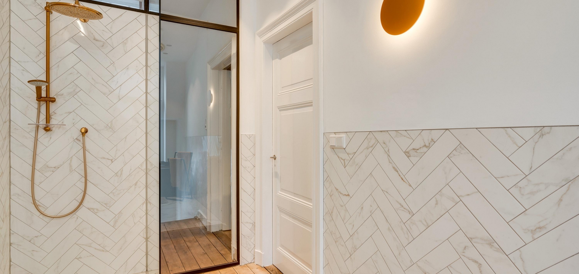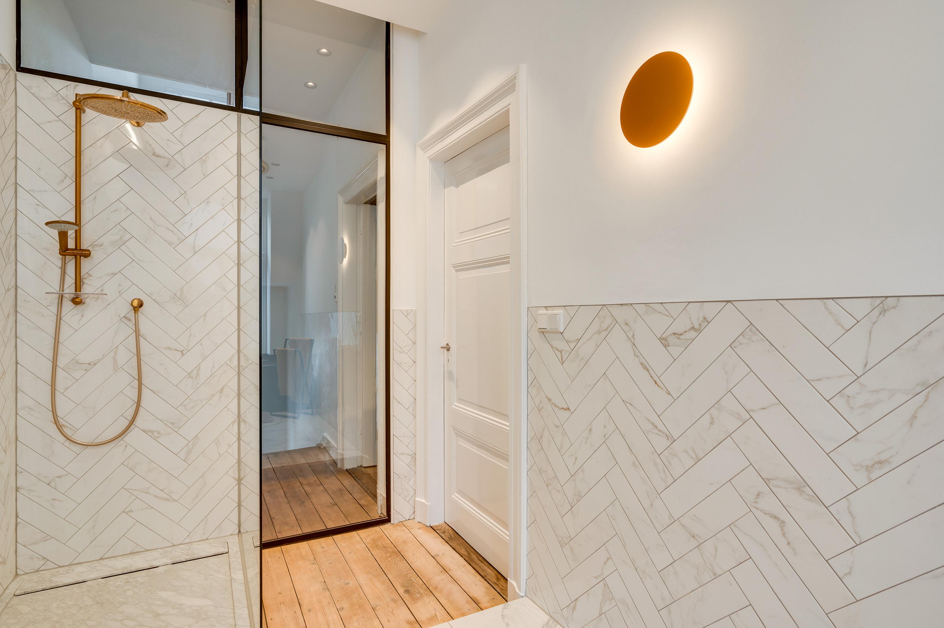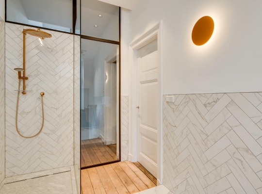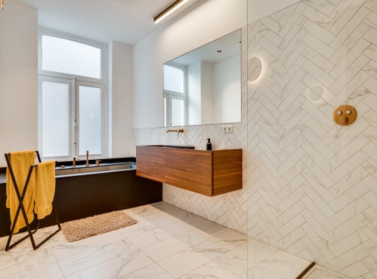Vanuit de master bedroom loopt u de badkamer (circa 4,70 x 1,92) in, die het toppunt van design en stijl is. Stucwerk is gecombineerd met visgraat wandtegels die, net als de vloertegels, zijn uitgevoerd in een marmerlook. De ruimte is ingedeeld met een zwart ligbad, een dubbel wastafelmeubel, grote spiegel, stijlvolle messing kranen en een inloopdouche.