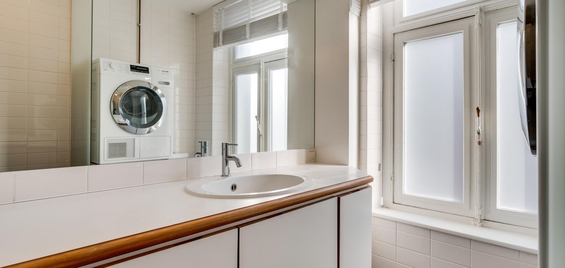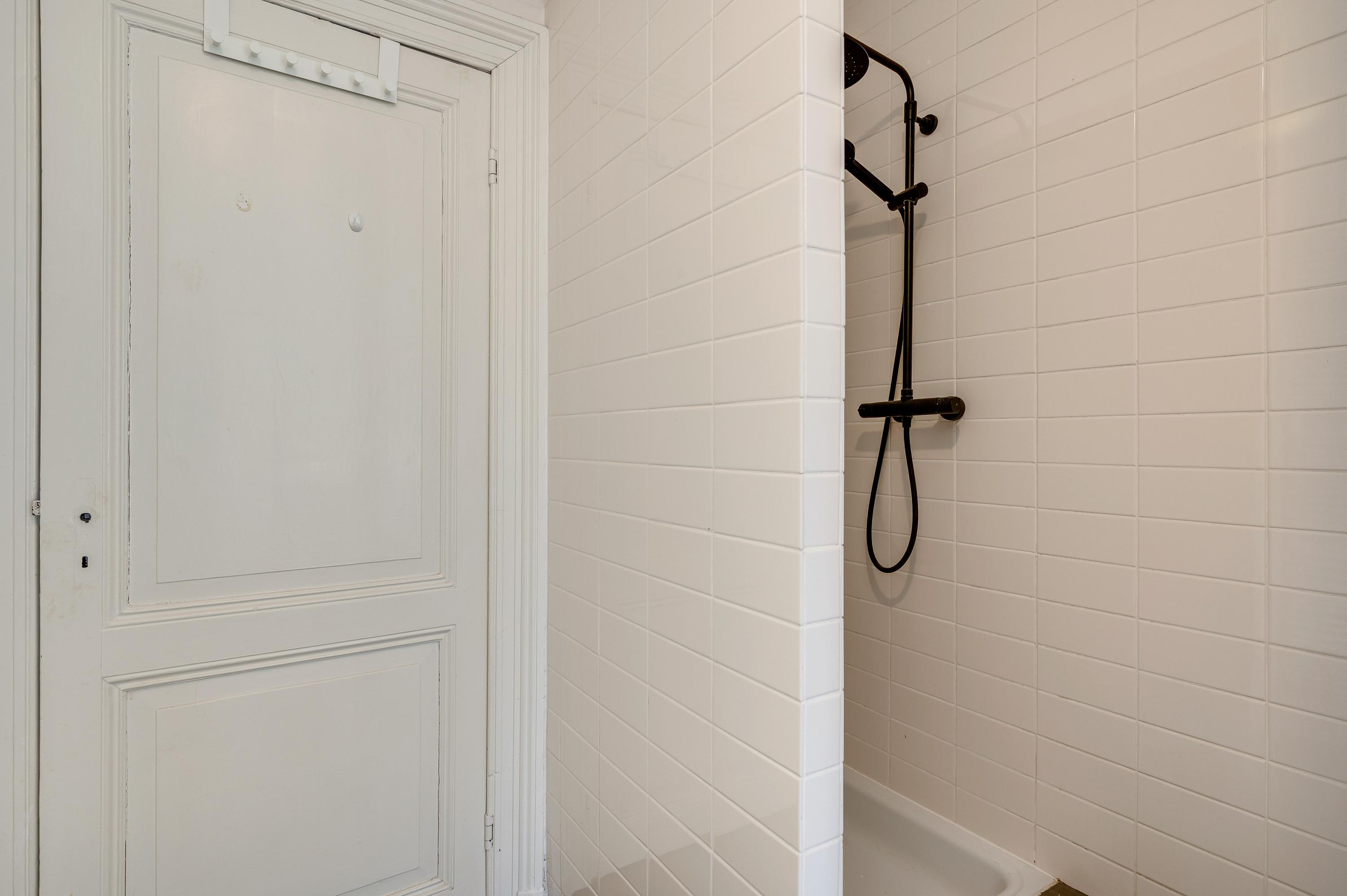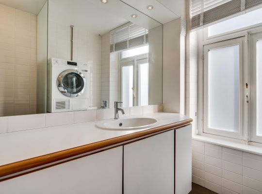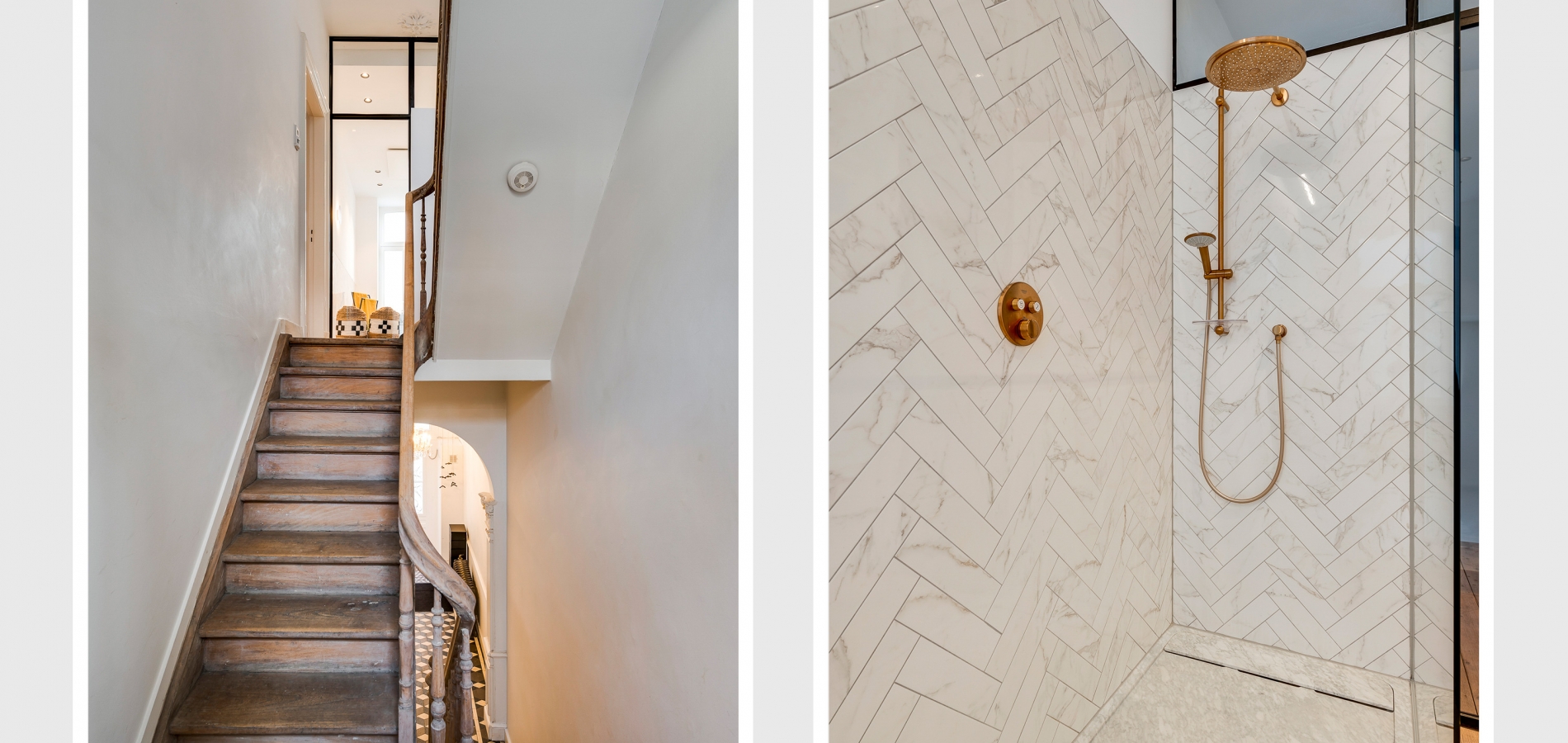 Vanuit de master bedroom loopt u de badkamer (circa 4,70 x 1,92) in, die het toppunt van design en stijl is. Stucwerk is gecombineerd met visgraat wandtegels die, net als de vloertegels, zijn uitgevoerd in een marmerlook. De ruimte is ingedeeld met een zwart ligbad, een dubbel wastafelmeubel, grote spiegel, stijlvolle messing kranen en een inloopdouche.