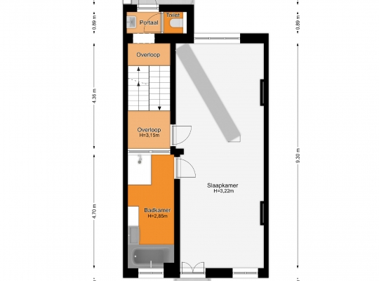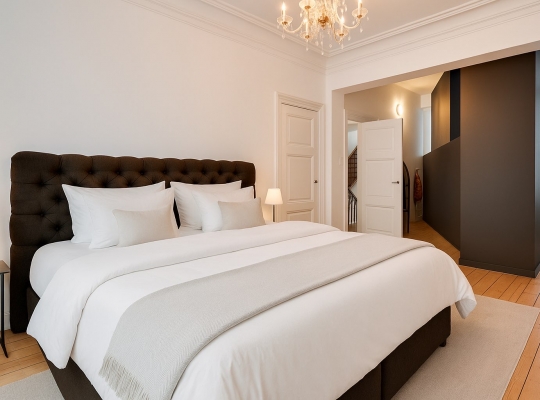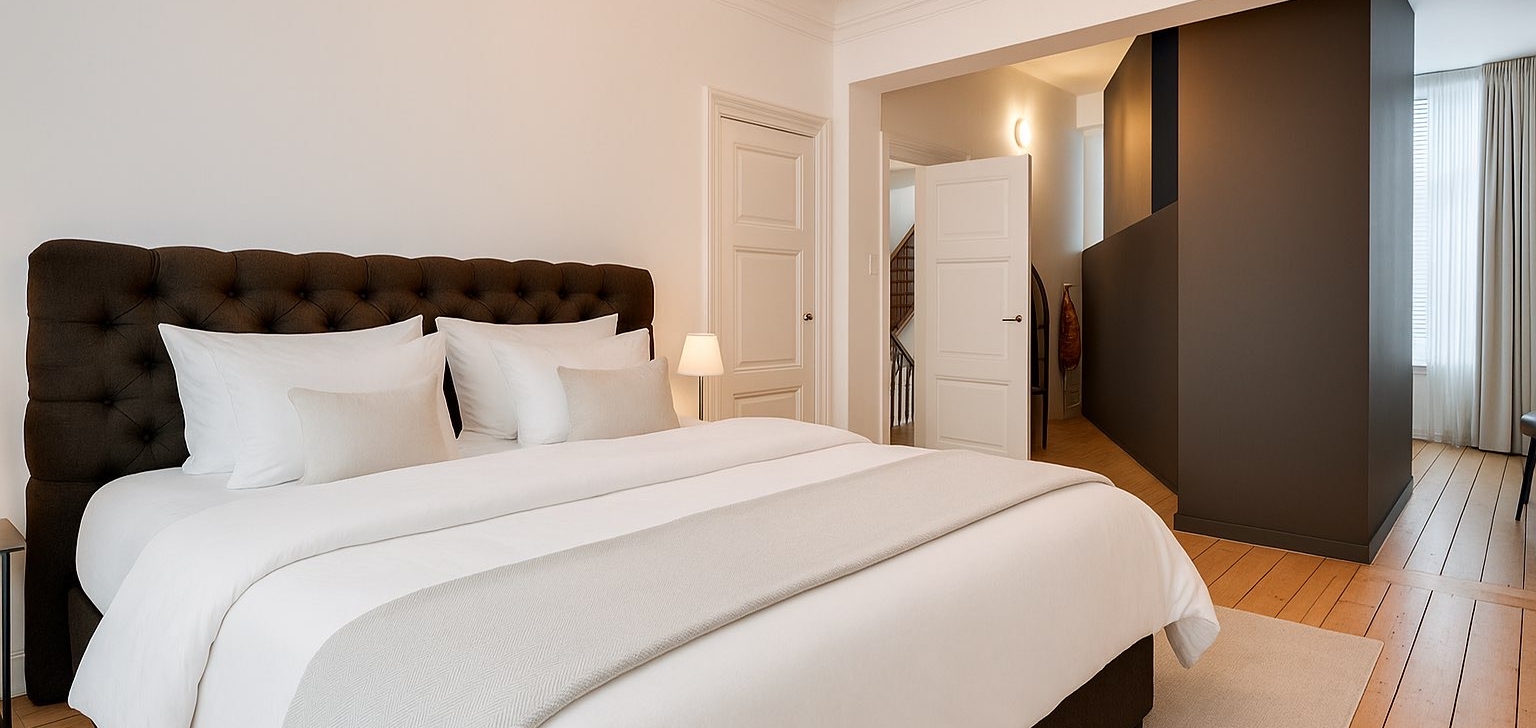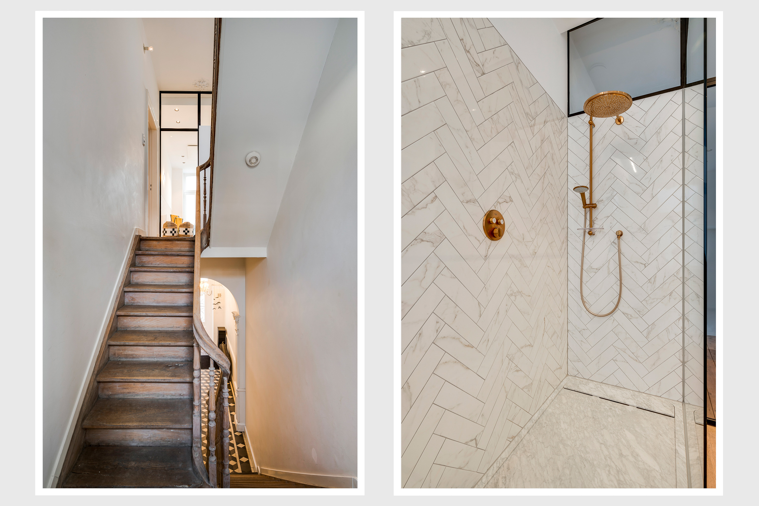 Via het tweede stuk van de bordestrap bereikt u de overloop, waaraan de master bedroom met kleedruimte en de badkamer grenzen. Door het raam tot vloerhoogte kunt u al een glimp van de badkamer opvangen en het zorgt voor fijne lichtinval. Met een plafondhoogte van 3,40 meter wordt de ruimtelijkheid van deze verdieping geaccentueerd.