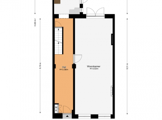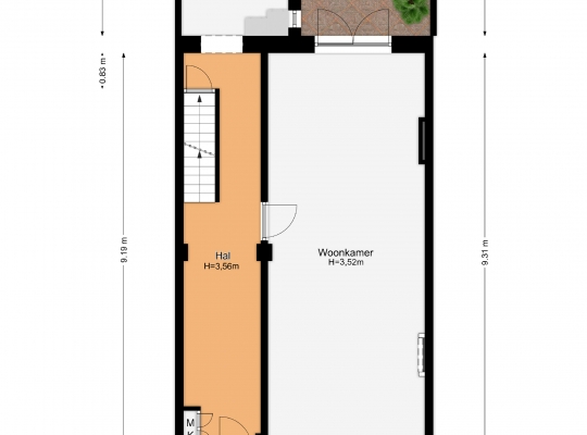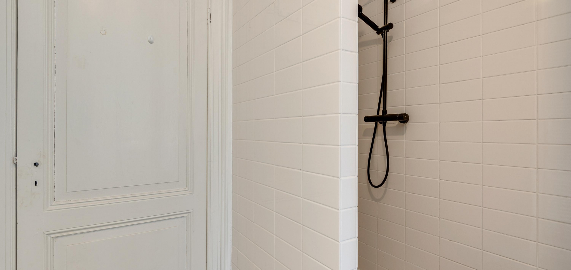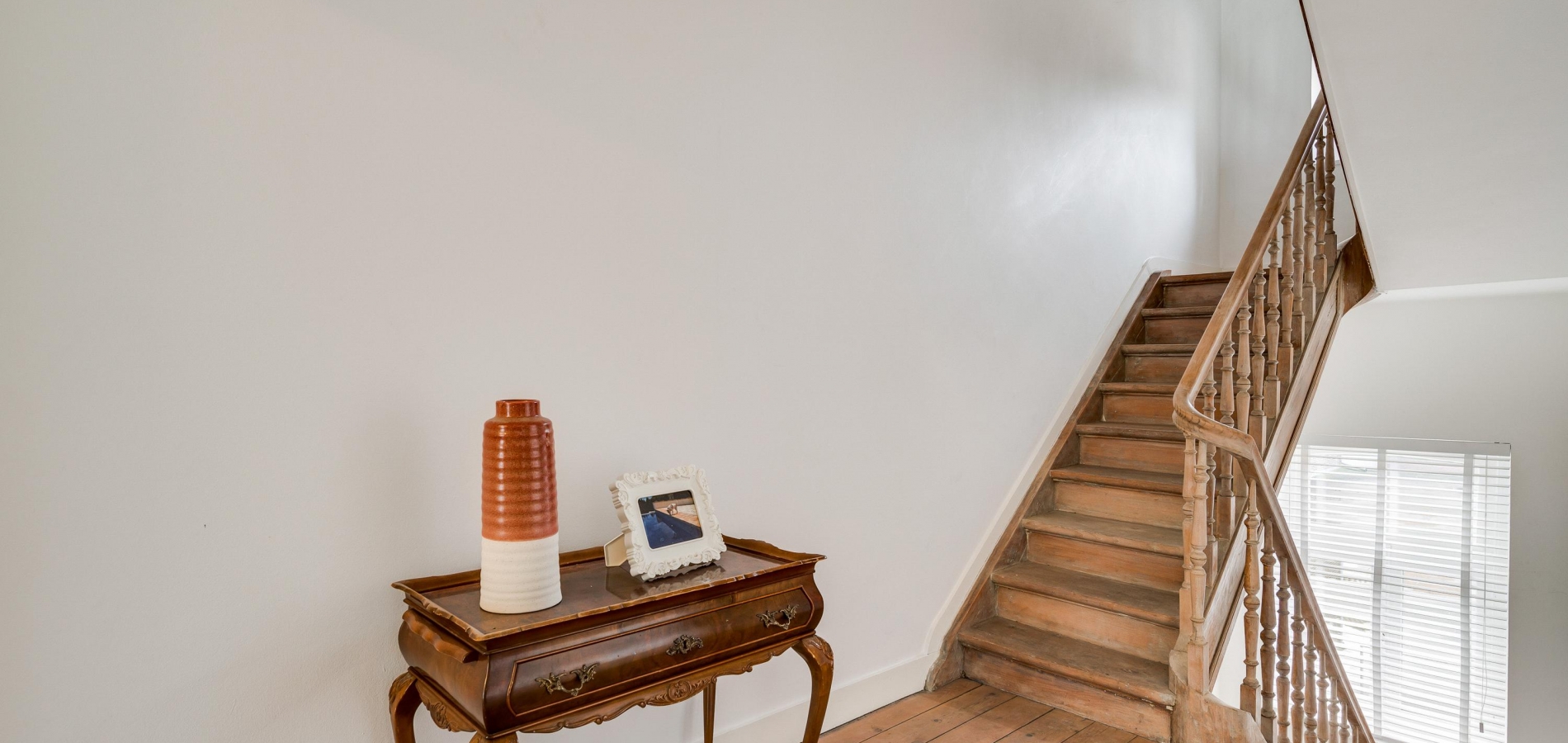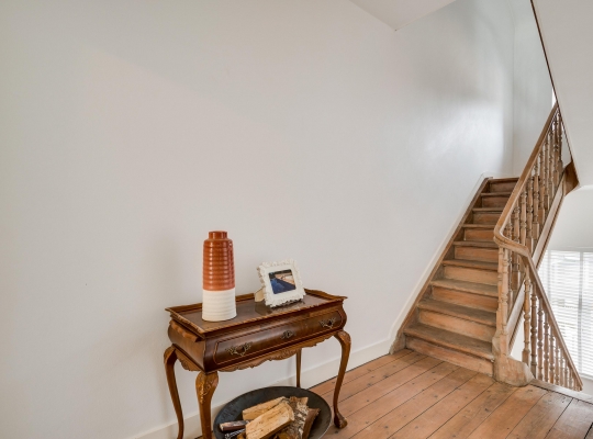 De entree is fraai, met een donkerblauwe voordeur voorzien van een rijkelijk gedecoreerde omlijsting. Via deze deur is de royale ontvangsthal (circa 9,19 x 1,80) te bereiken, met een 3,85 meter hoog ornamentenplafond en een prachtige tegelvloer. Alles klopt, van de radiator op pootjes tot de paneeldeuren, trappartij en de boog met pilasters.