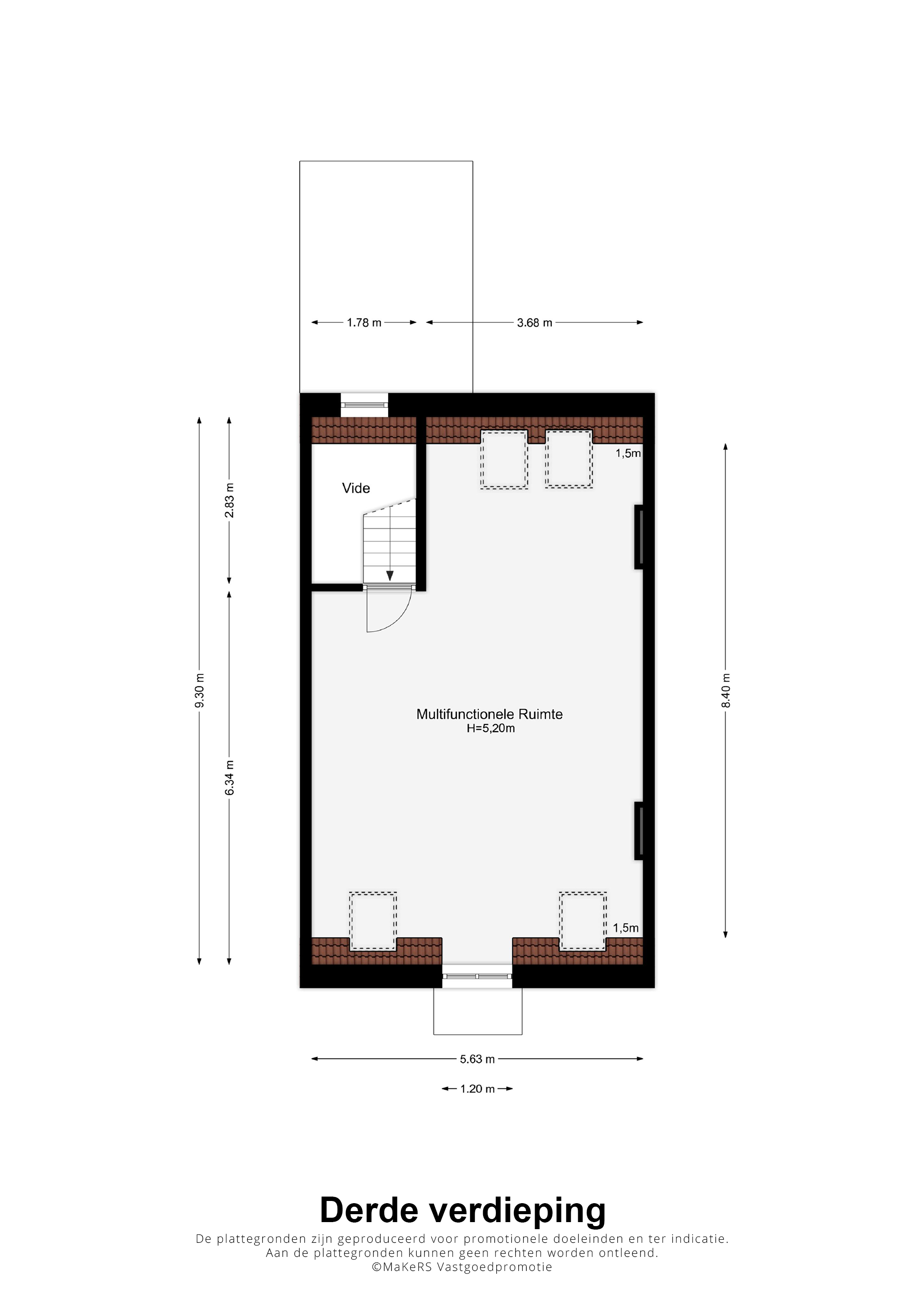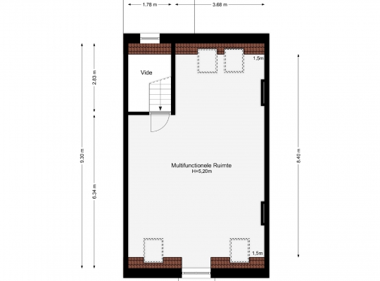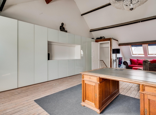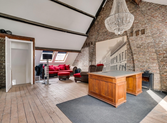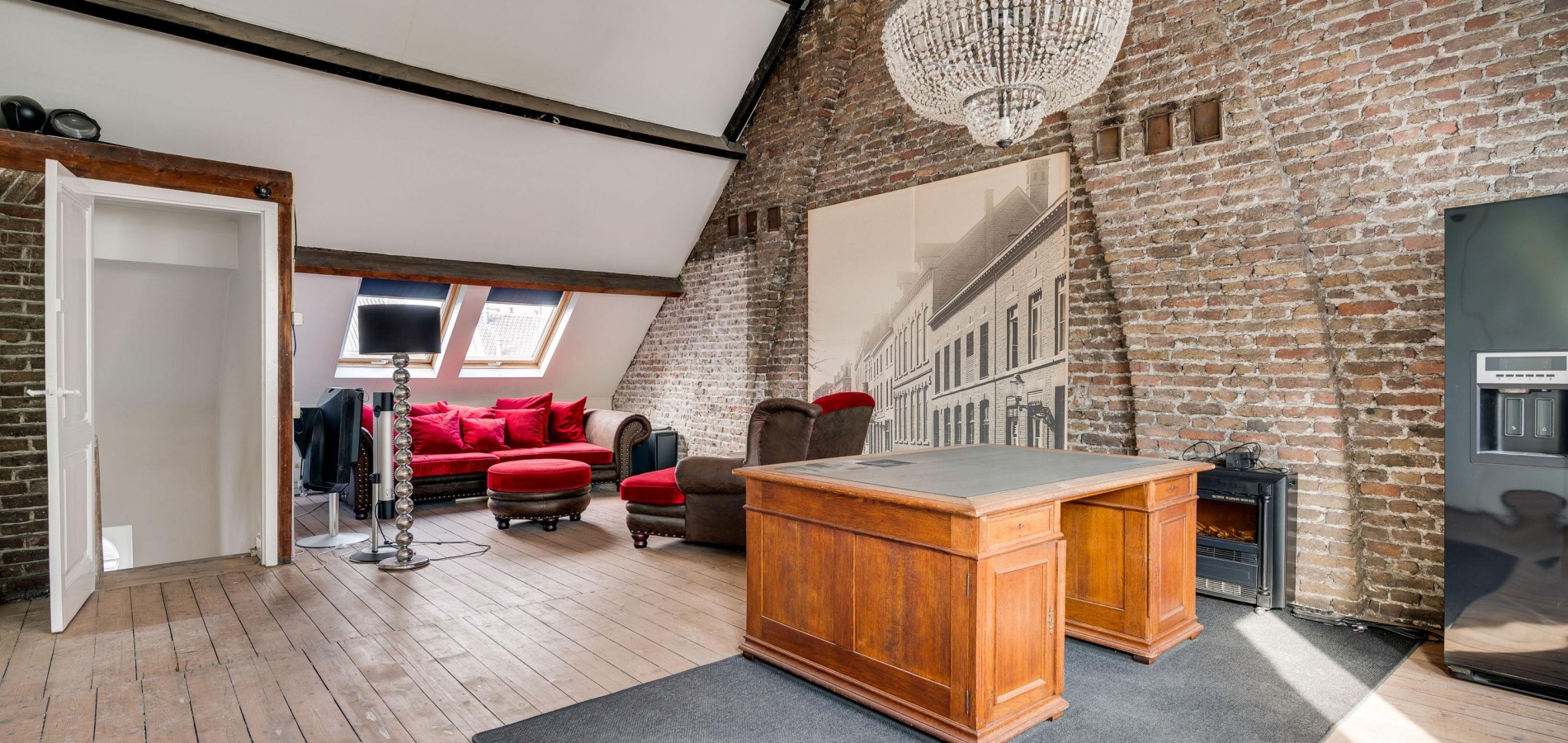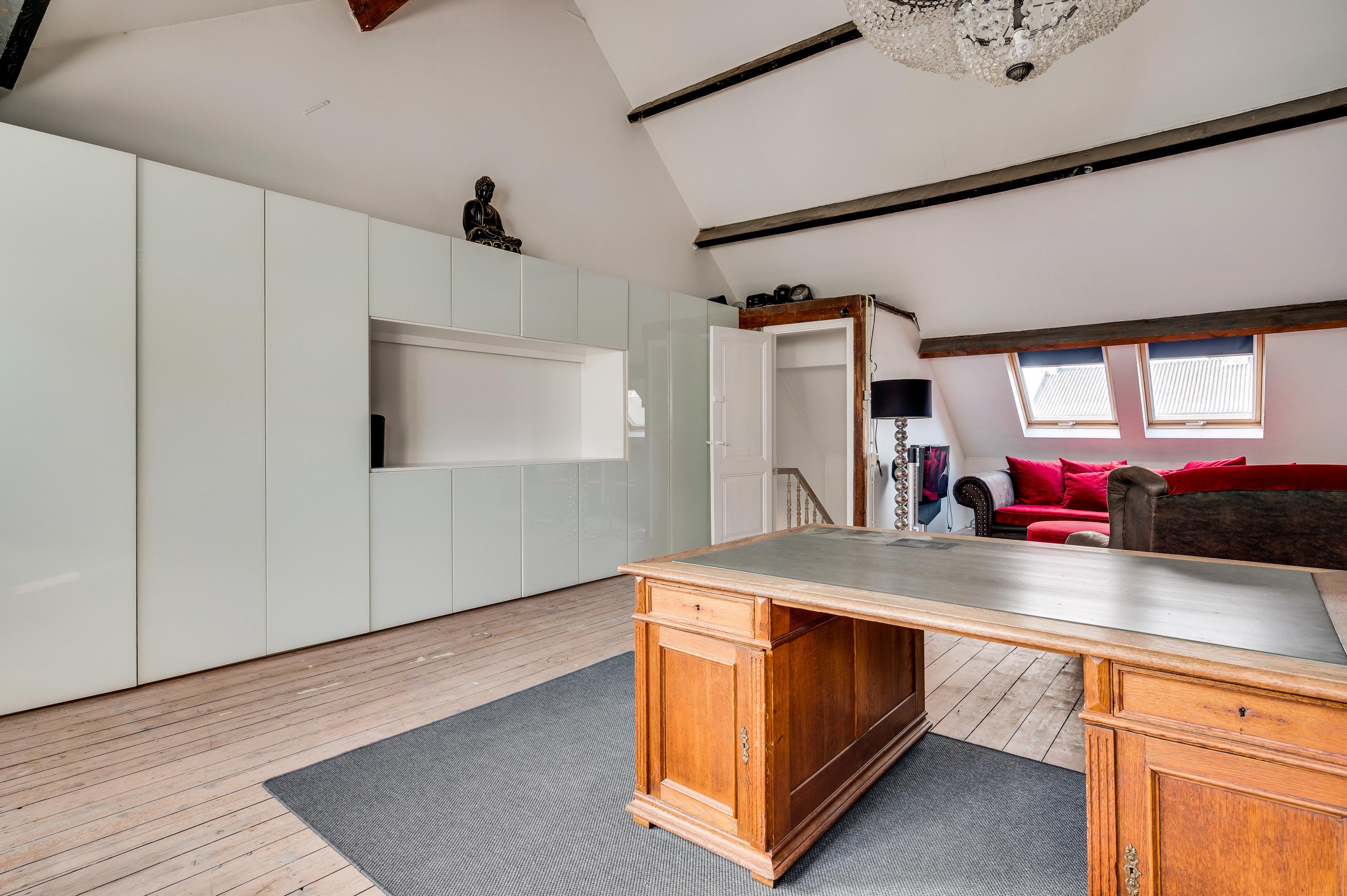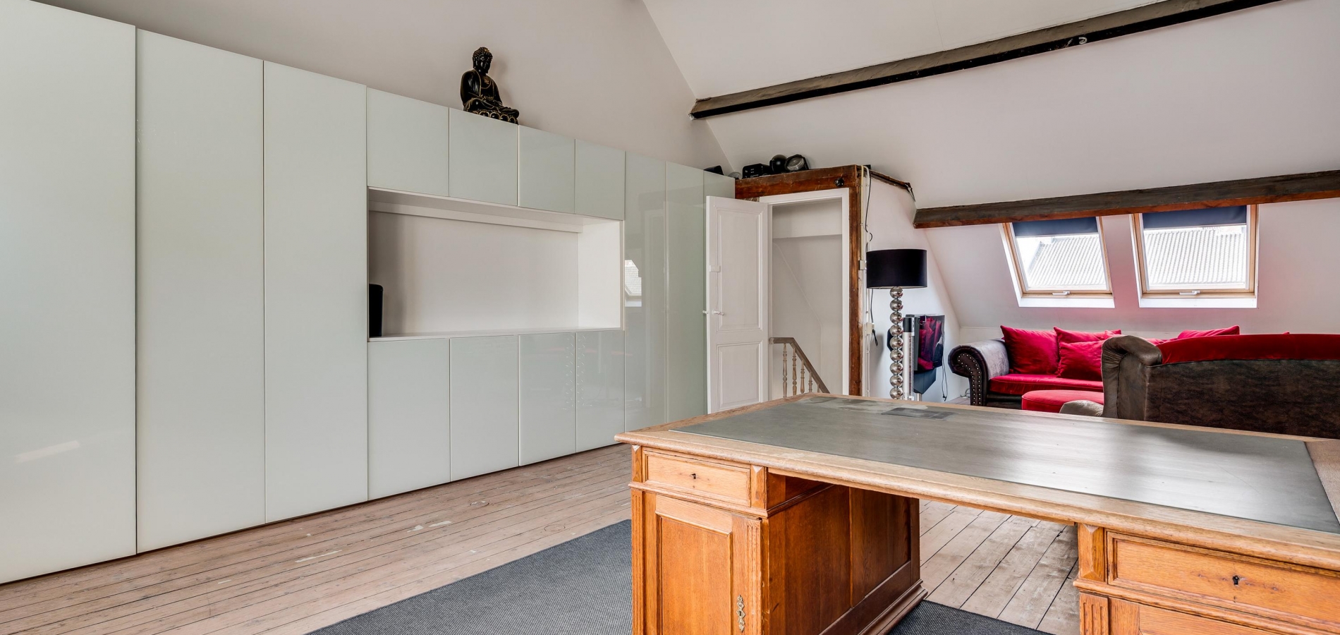 De meest indrukwekkende ruimte bevindt zich op de bovenste verdieping. Met een nokhoogte van maar liefst 5,20 meter, een dakkapel en vier dakramen is deze kamer (circa 8,40/6,34 x 5,63) klaar voor een nieuwe invulling. Oude spanten zijn zichtbaar, net als de houten vloer en prachtig metselwerk uit het einde van de 19e eeuw. Wordt dit uw werkkamer, atelier, loungeruimte of kiest u voor een indeling met twee royale slaapkamers?