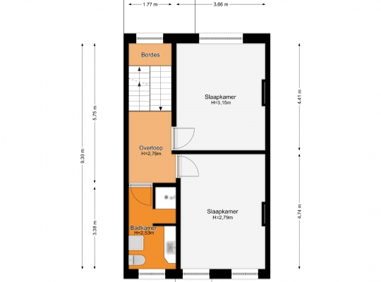 De bordestrap gaat verder naar de tweede verdieping, waar twee royale slaapkamers en een badkamer zijn. Slaapkamer II (circa 4,74 x 3,49) bevindt zich aan de voorzijde en slaapkamer III (circa 4,41 x 3,66) aan de achterzijde. In beide kamers en op de overloop ligt een houten vloer met karakter en ook hier zijn de paneeldeuren behouden.