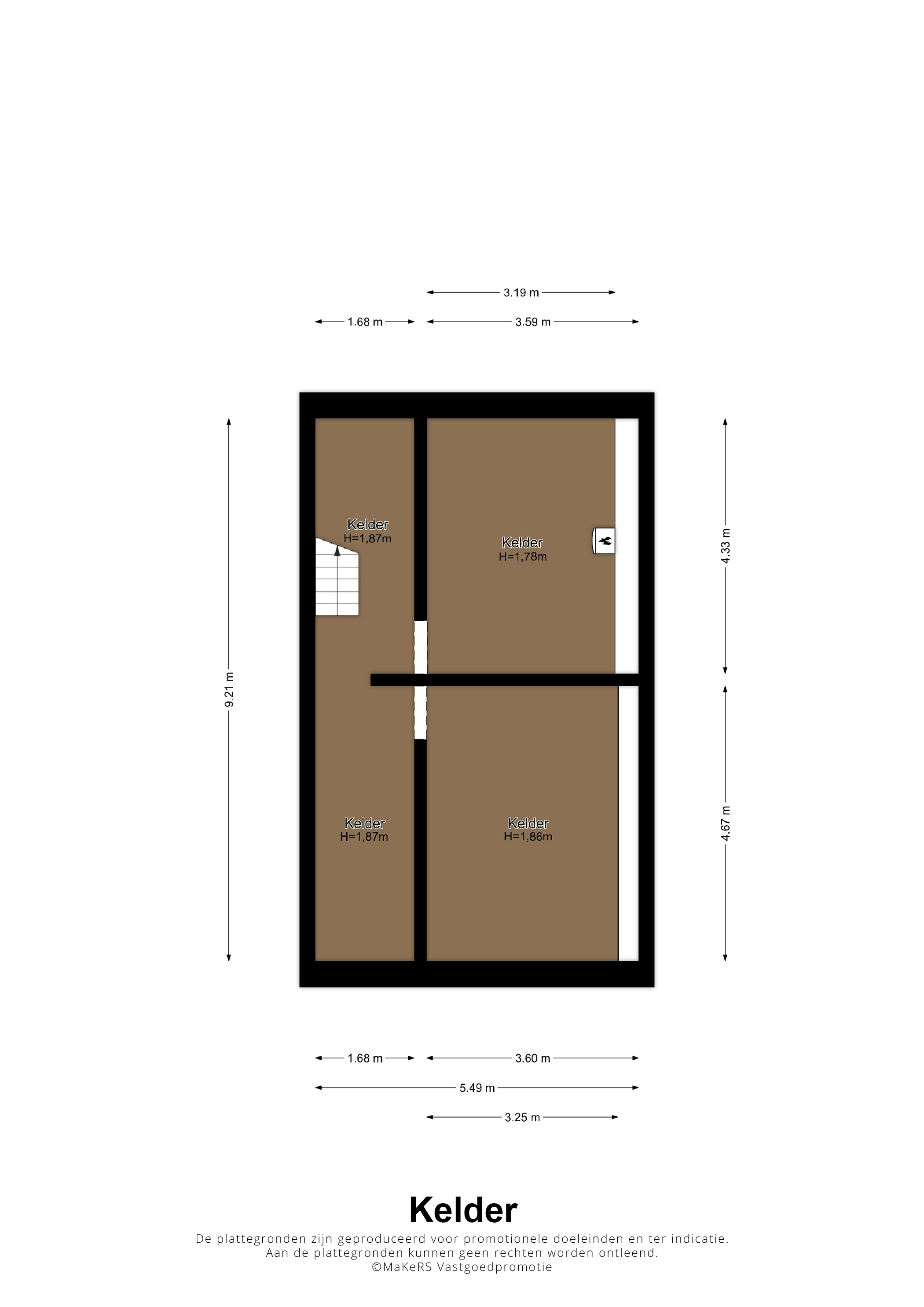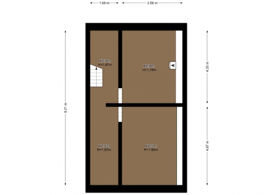 Achter een van de deuren in de hal is een trap naar het souterrain, waar de plafondhoogte varieert van 1,78 tot 1,87 meter. Aan de achterzijde zijn kelder I (circa 4,33 x 1,68) en kelder II (circa 4,33 x 3,59) met de opstelling van de HR-ketel (Nefit, eigendom). Kelder III (circa 4,67 x 1,87) en kelder IV (circa 4,67 x 3,60) bevinden zich aan de voorzijde.