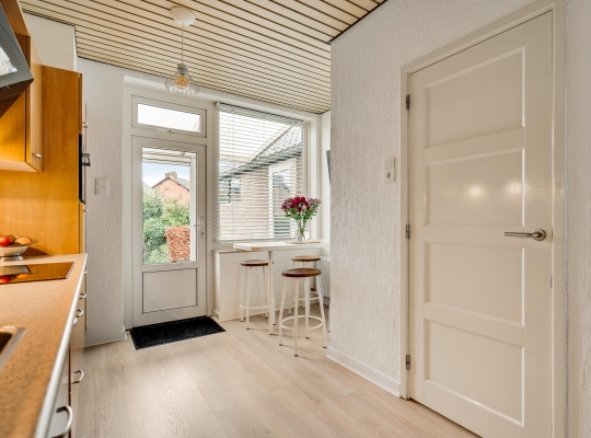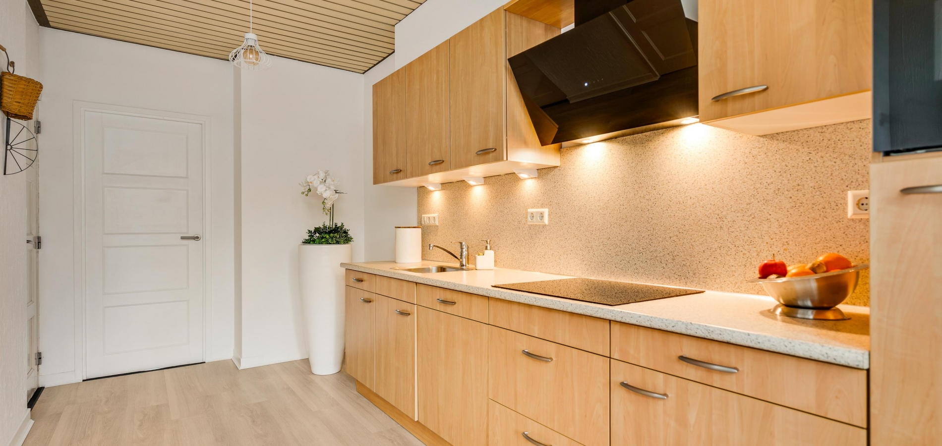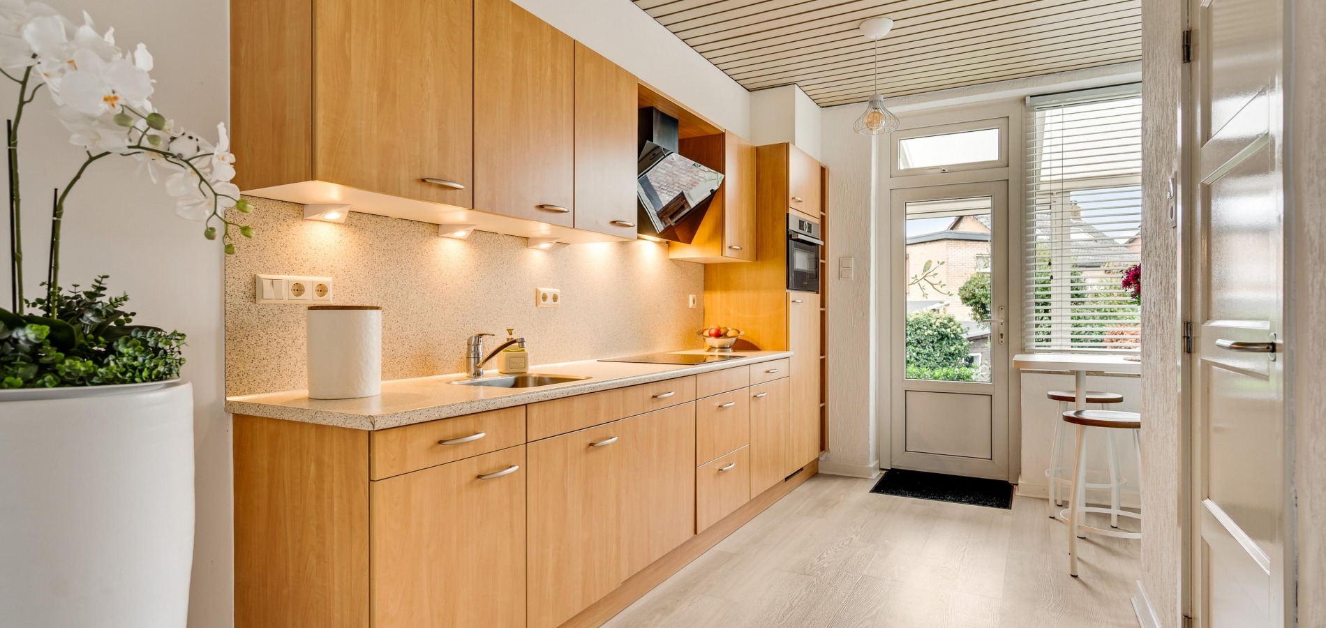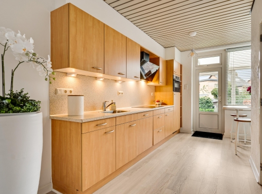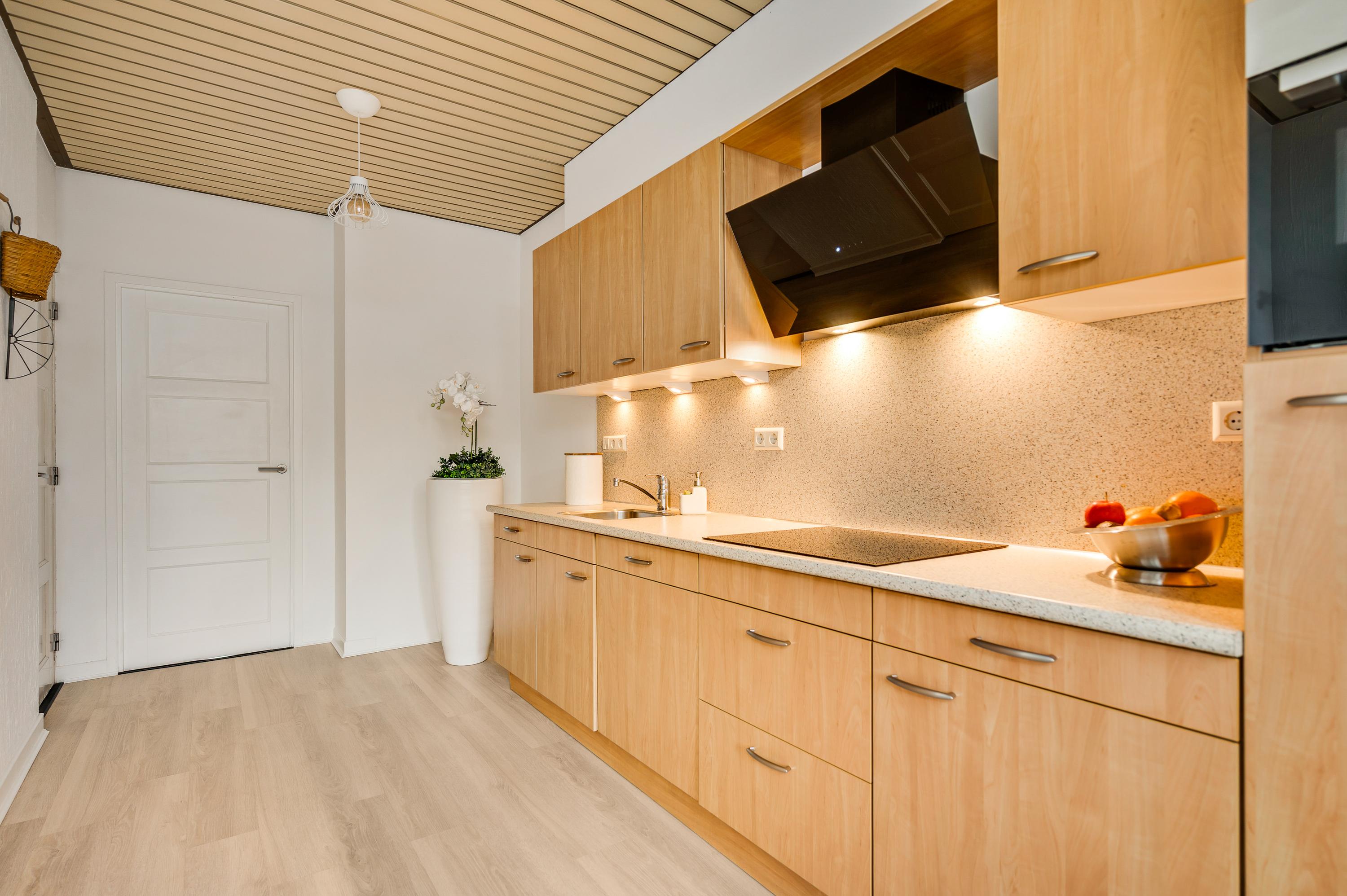 Vanuit de hal is er toegang tot de verrassend ruime keuken (circa 14 m2 inclusief wasruimte), met een hoge (eet)tafel aan de achterzijde. De lange wandopstelling heeft een ingebouwde inductie kookplaat, afzuigkap, combi-oven, koelkast en een vaatwasser. Extra bergruimte is op de planken in de wasruimte, die dankzij het raam in de zijgevel heel licht is.
