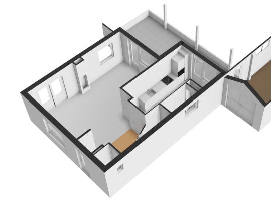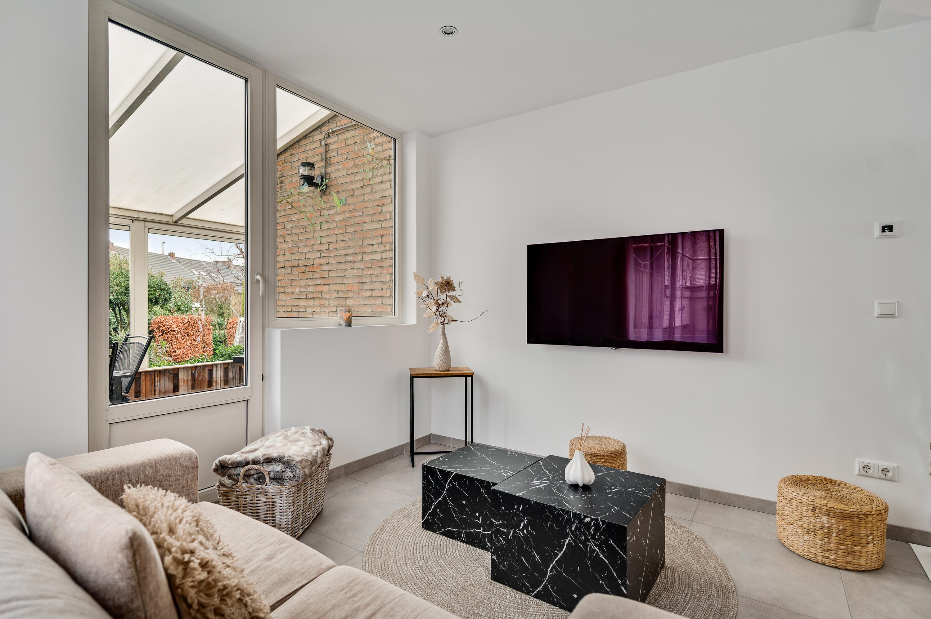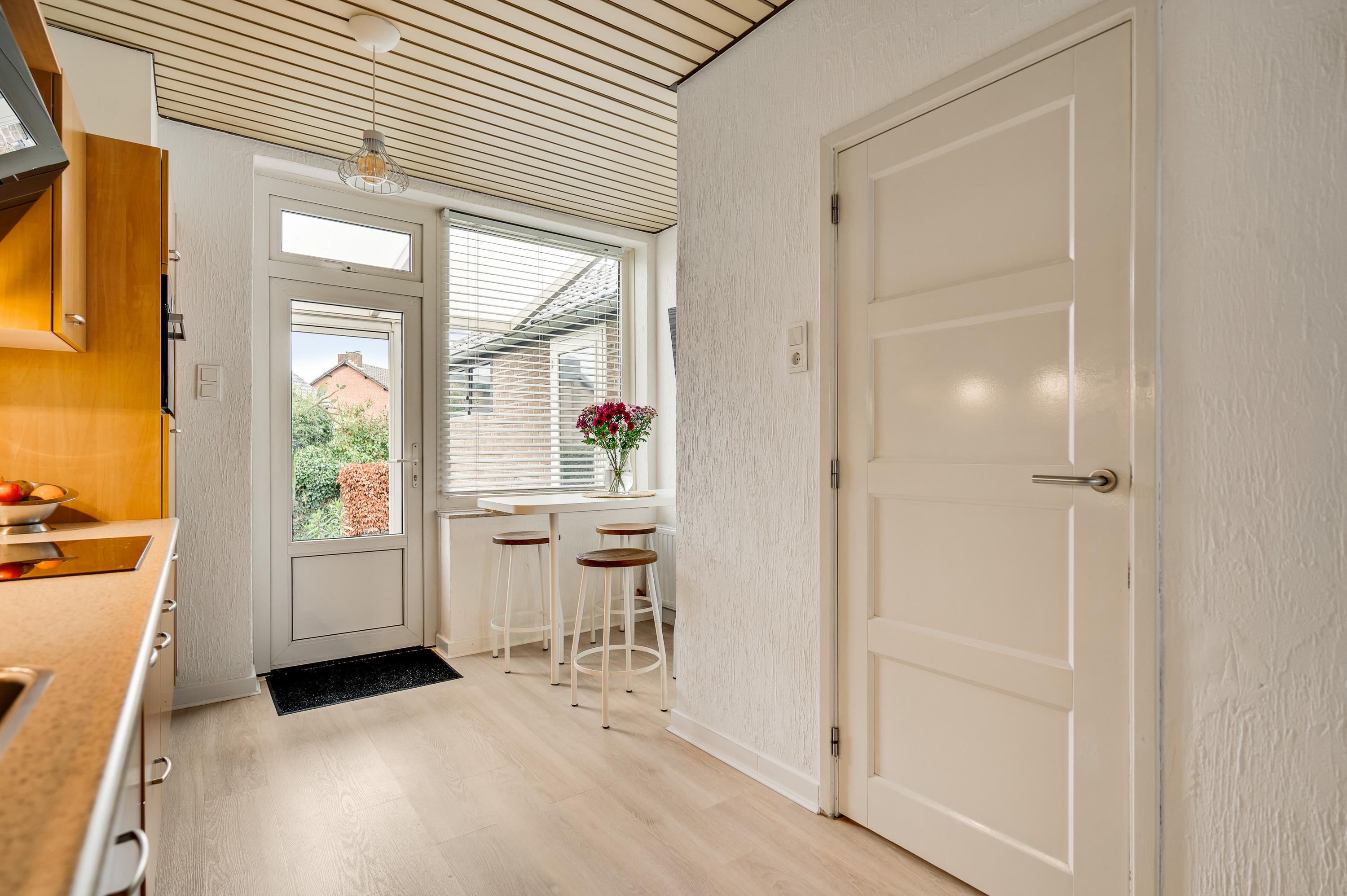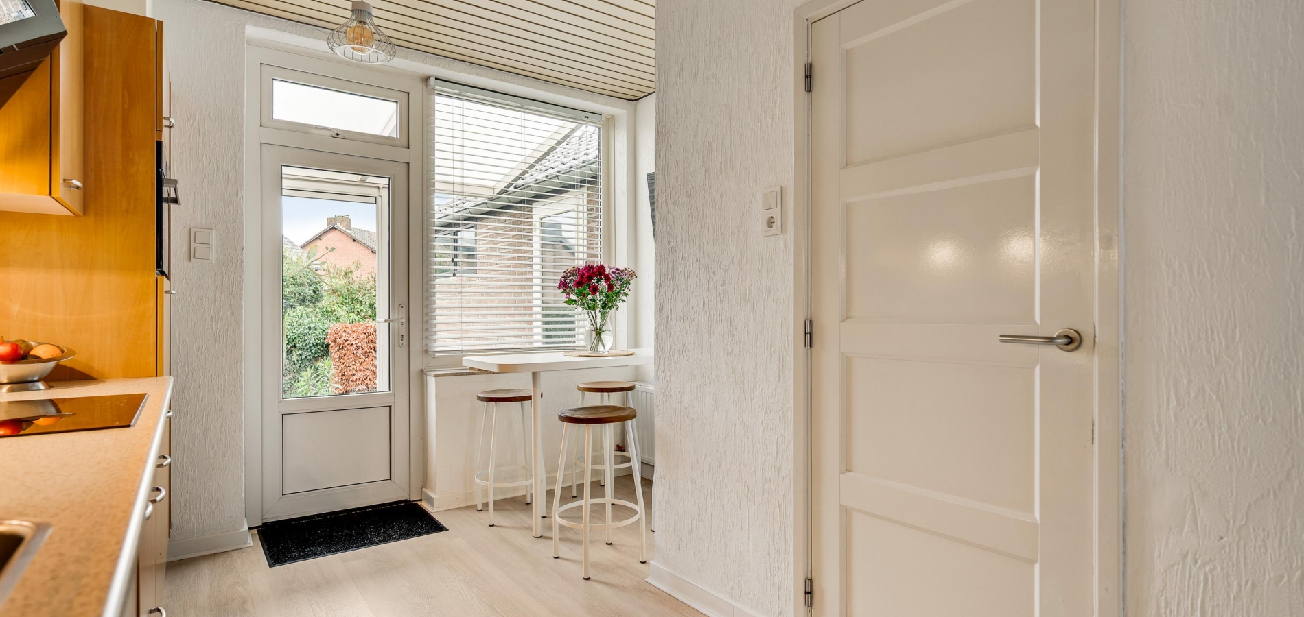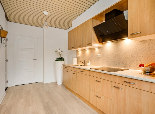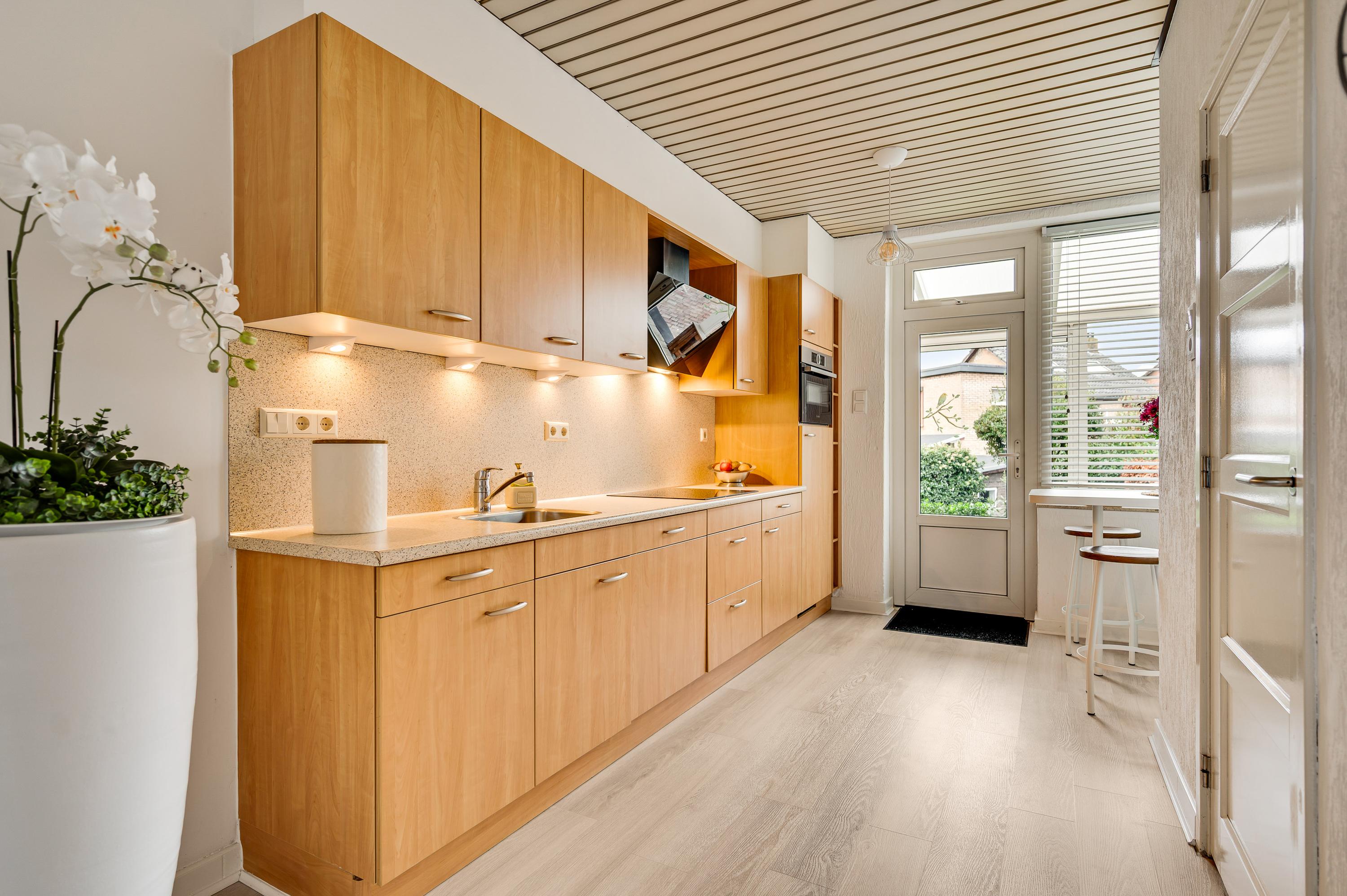 Vanuit de hal is er toegang tot de verrassend ruime keuken (circa 14 m2 inclusief wasruimte), met een hoge (eet)tafel aan de achterzijde. De lange wandopstelling heeft een ingebouwde inductie kookplaat, afzuigkap, combi-oven, koelkast en een vaatwasser. Extra bergruimte is op de planken in de wasruimte, die dankzij het raam in de zijgevel heel licht is.