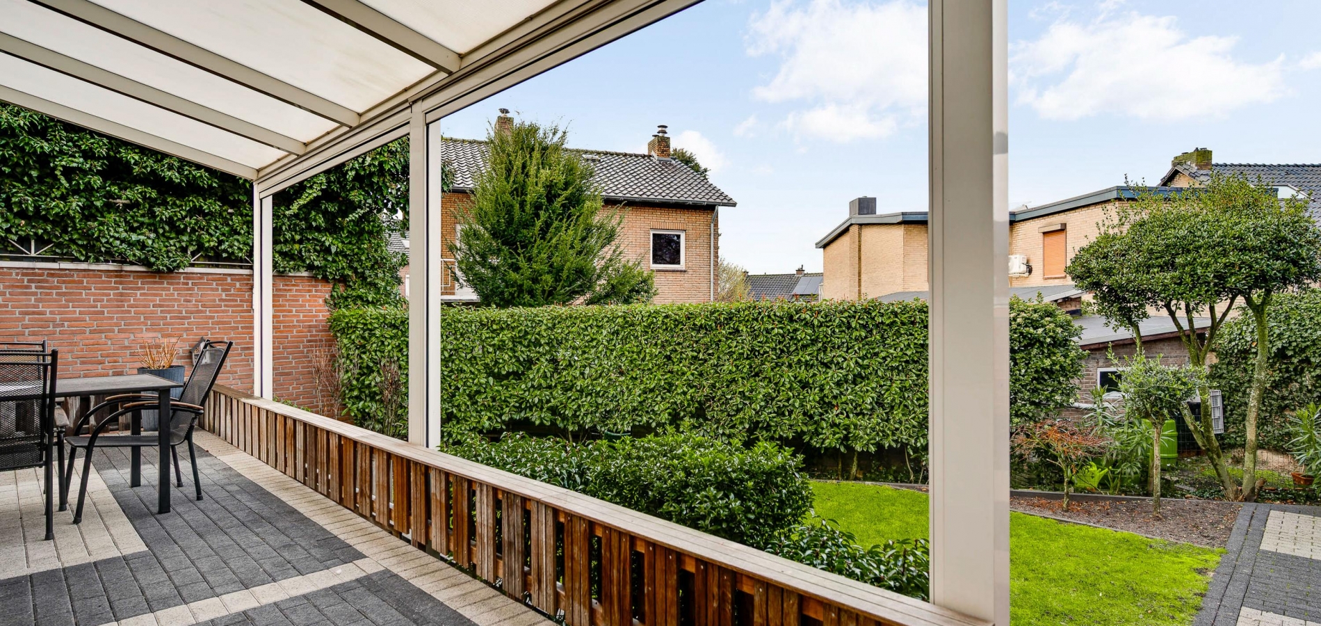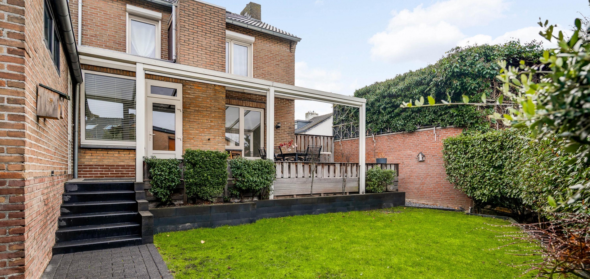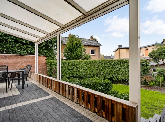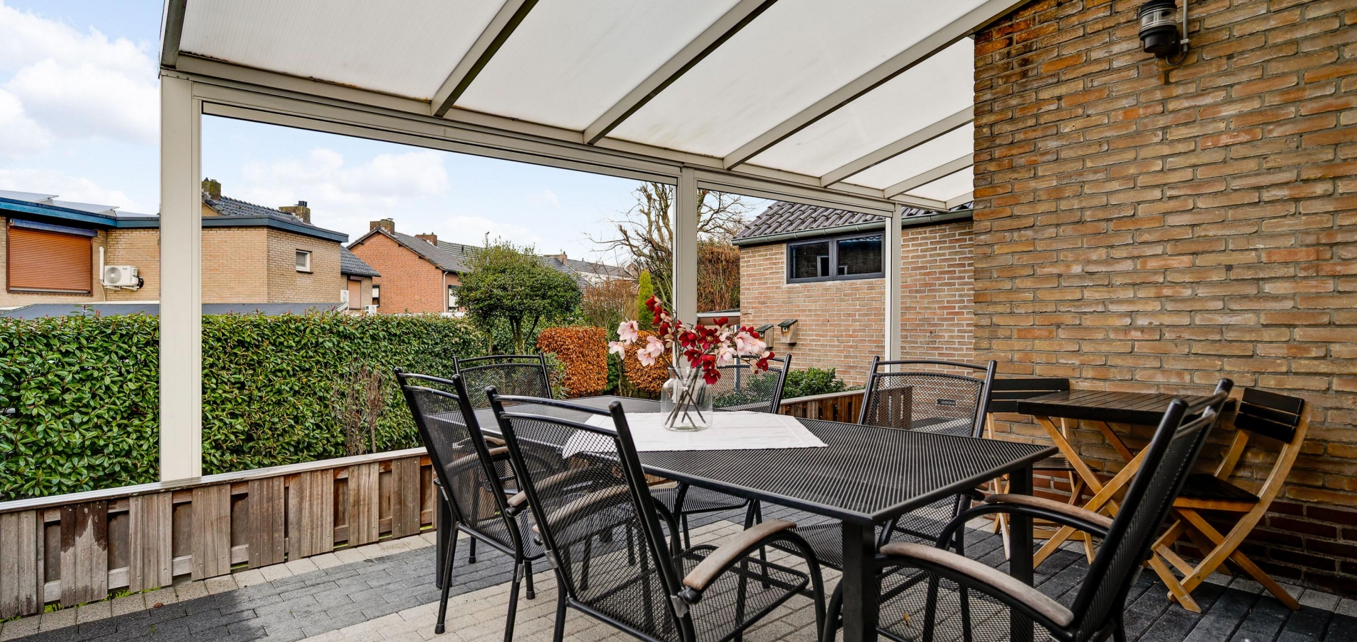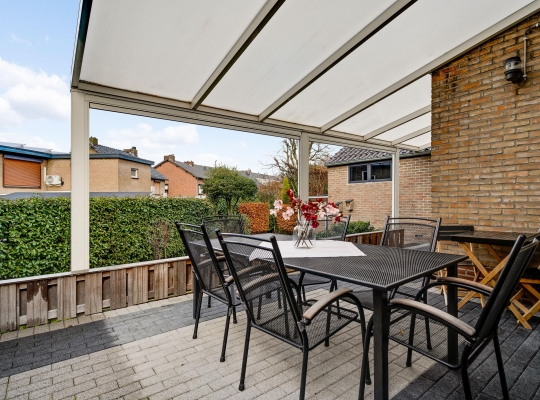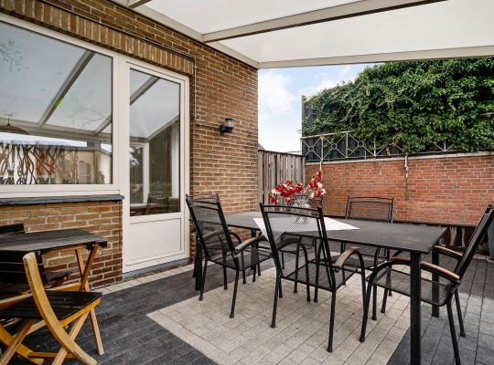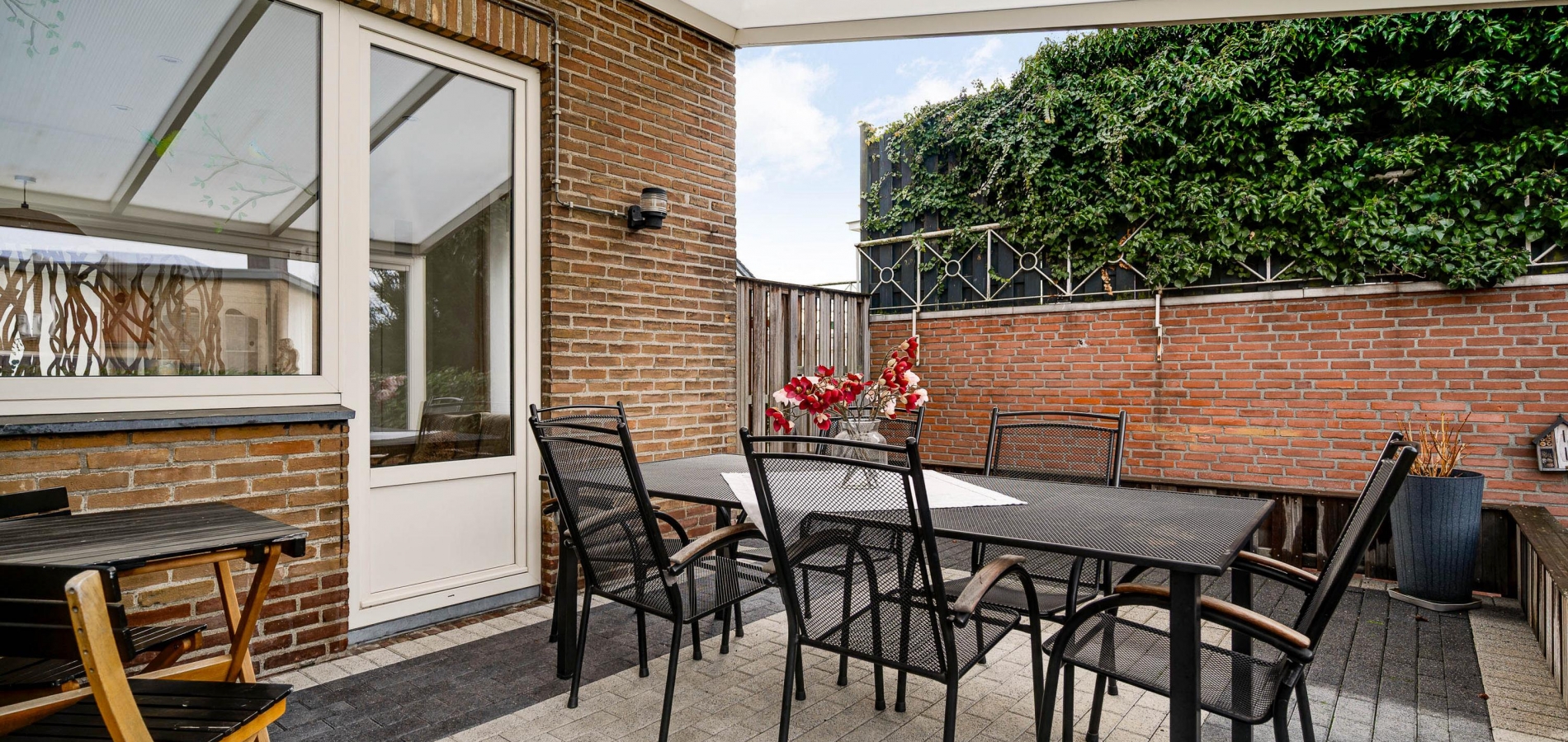 Vanuit de woonkamer en keuken is er toegang tot het overdekte terras van circa 22,0 m2. Dit is een heerlijke plek om buiten te zitten, met genoeg ruimte om te borrelen met vrienden en familie. Een trap geeft toegang tot de lagergelegen tuin (west) en via het terras is er ook toegang tot de garage (circa 5,01 x 3,00). Aan de achterzijde van de garage is een berging (circa 2,36 x 2,05), te bereiken vanuit de tuin. De zijtuin, op het zuiden, is vanuit de woonkamer te bereiken.