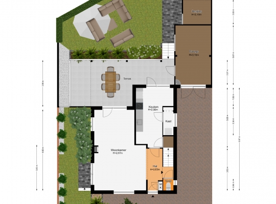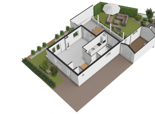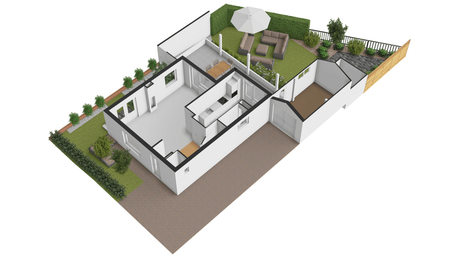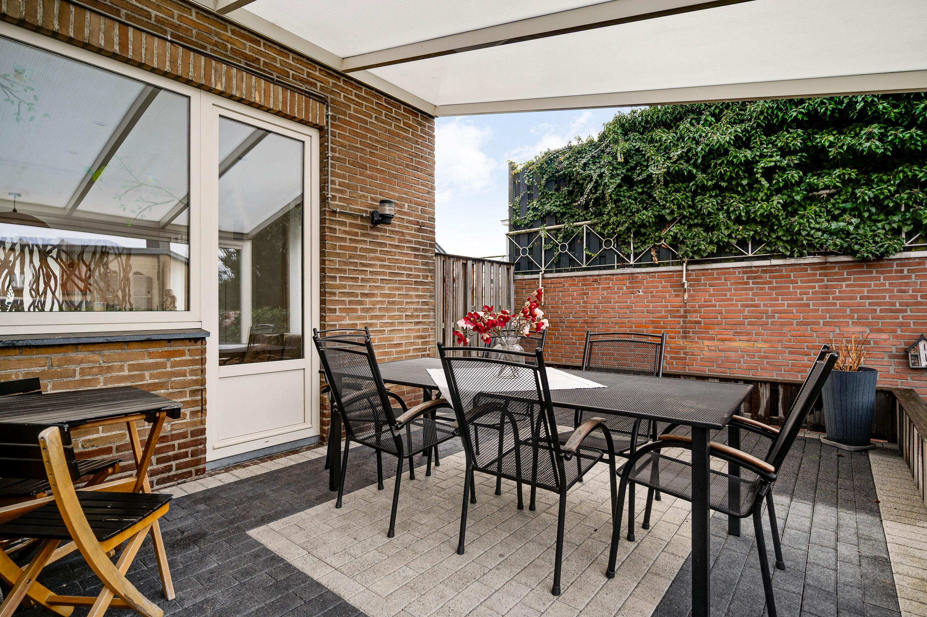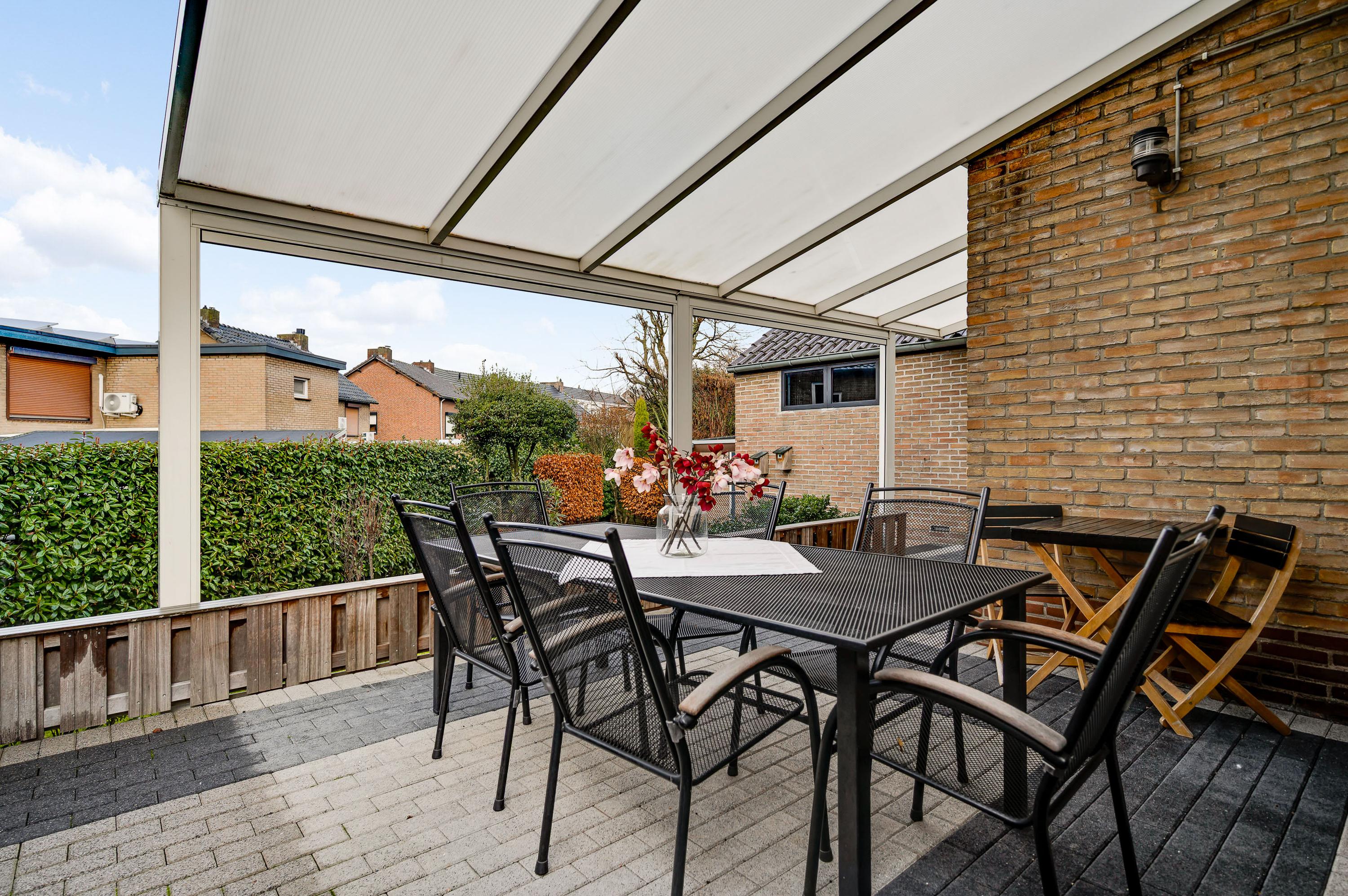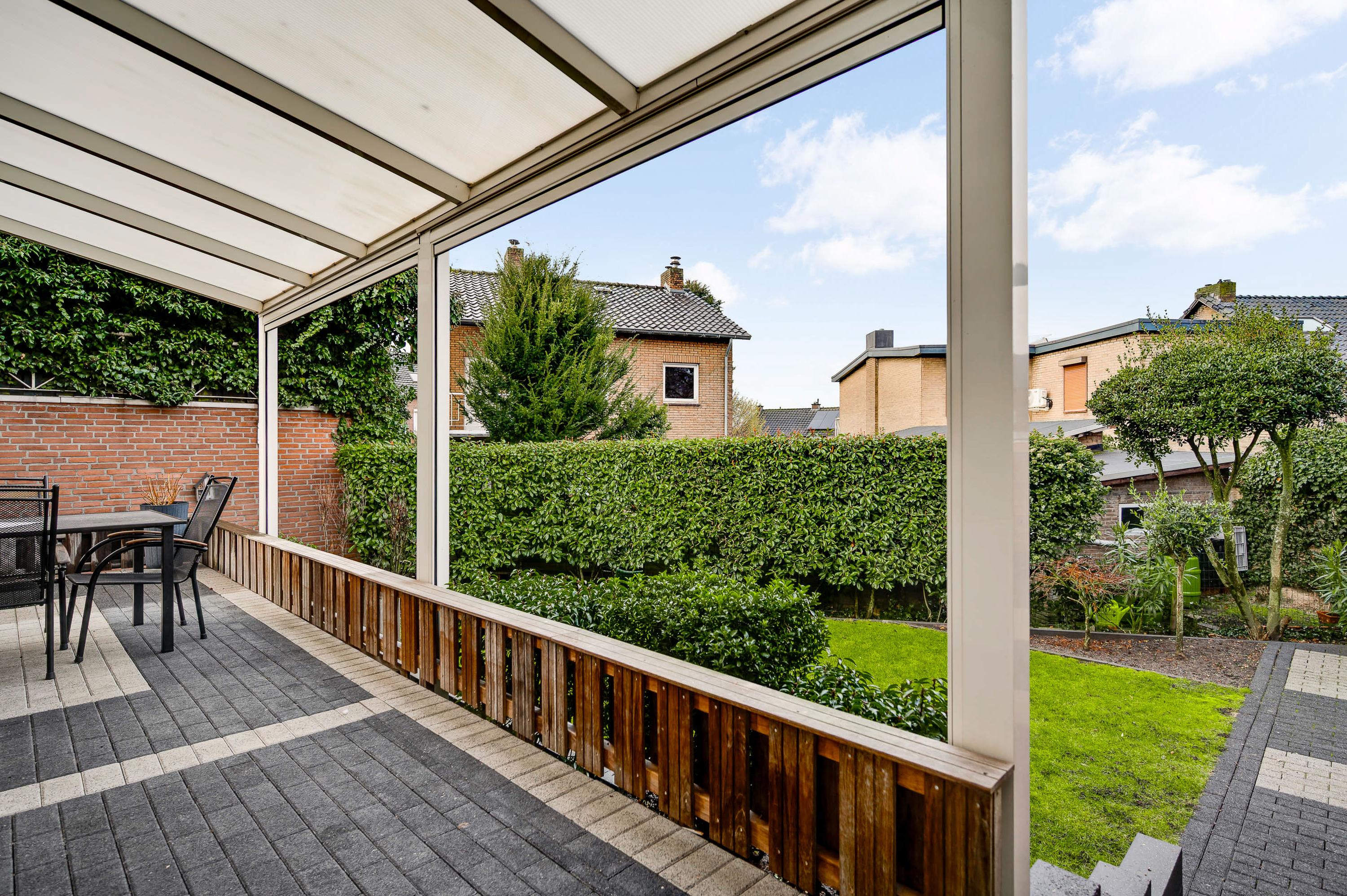 Vanuit de woonkamer en keuken is er toegang tot het overdekte terras van circa 22,0 m2. Dit is een heerlijke plek om buiten te zitten, met genoeg ruimte om te borrelen met vrienden en familie. Een trap geeft toegang tot de lagergelegen tuin (west) en via het terras is er ook toegang tot de garage (circa 5,01 x 3,00). Aan de achterzijde van de garage is een berging (circa 2,36 x 2,05), te bereiken vanuit de tuin. De zijtuin, op het zuiden, is vanuit de woonkamer te bereiken.