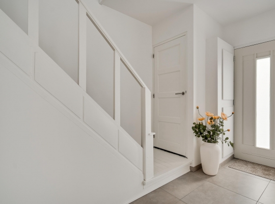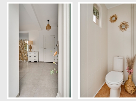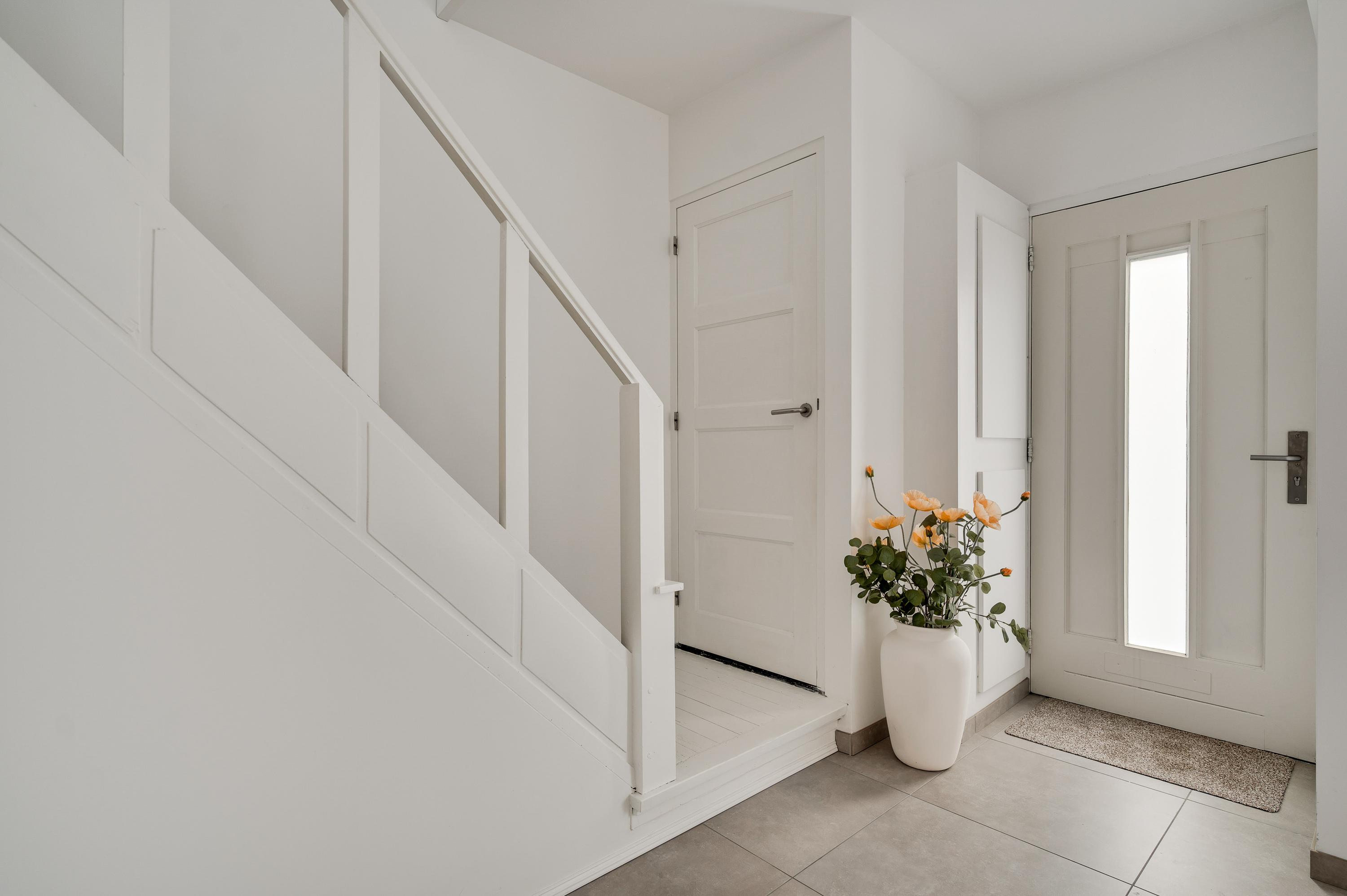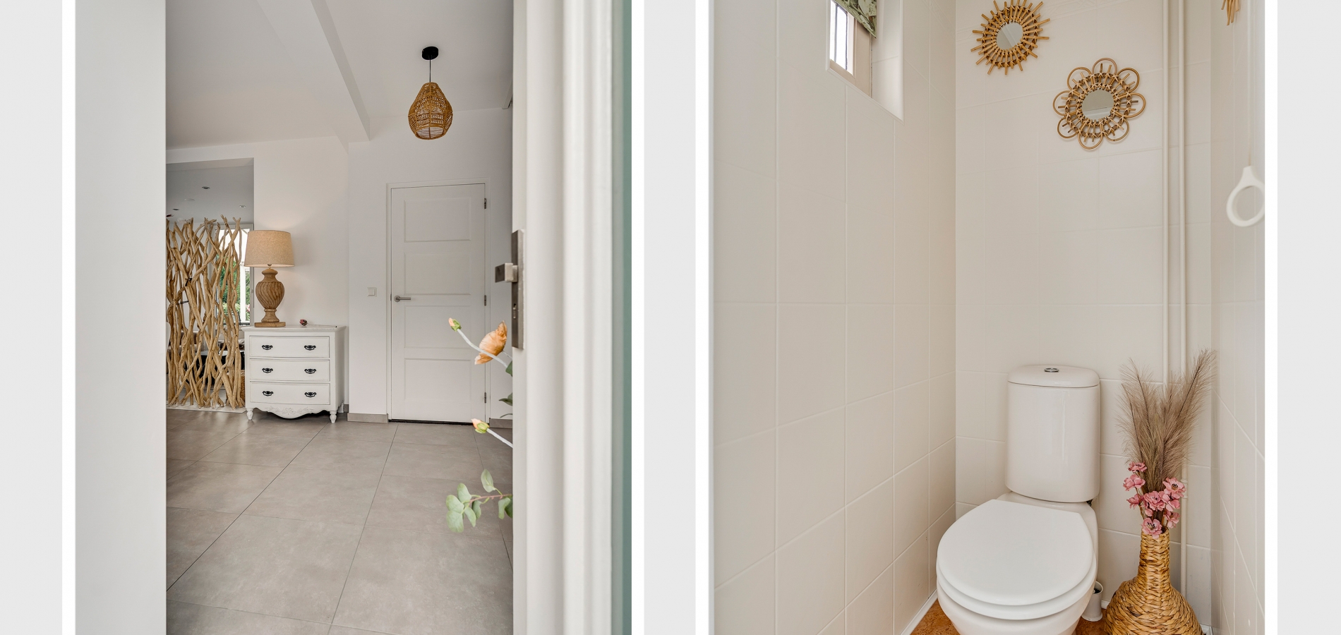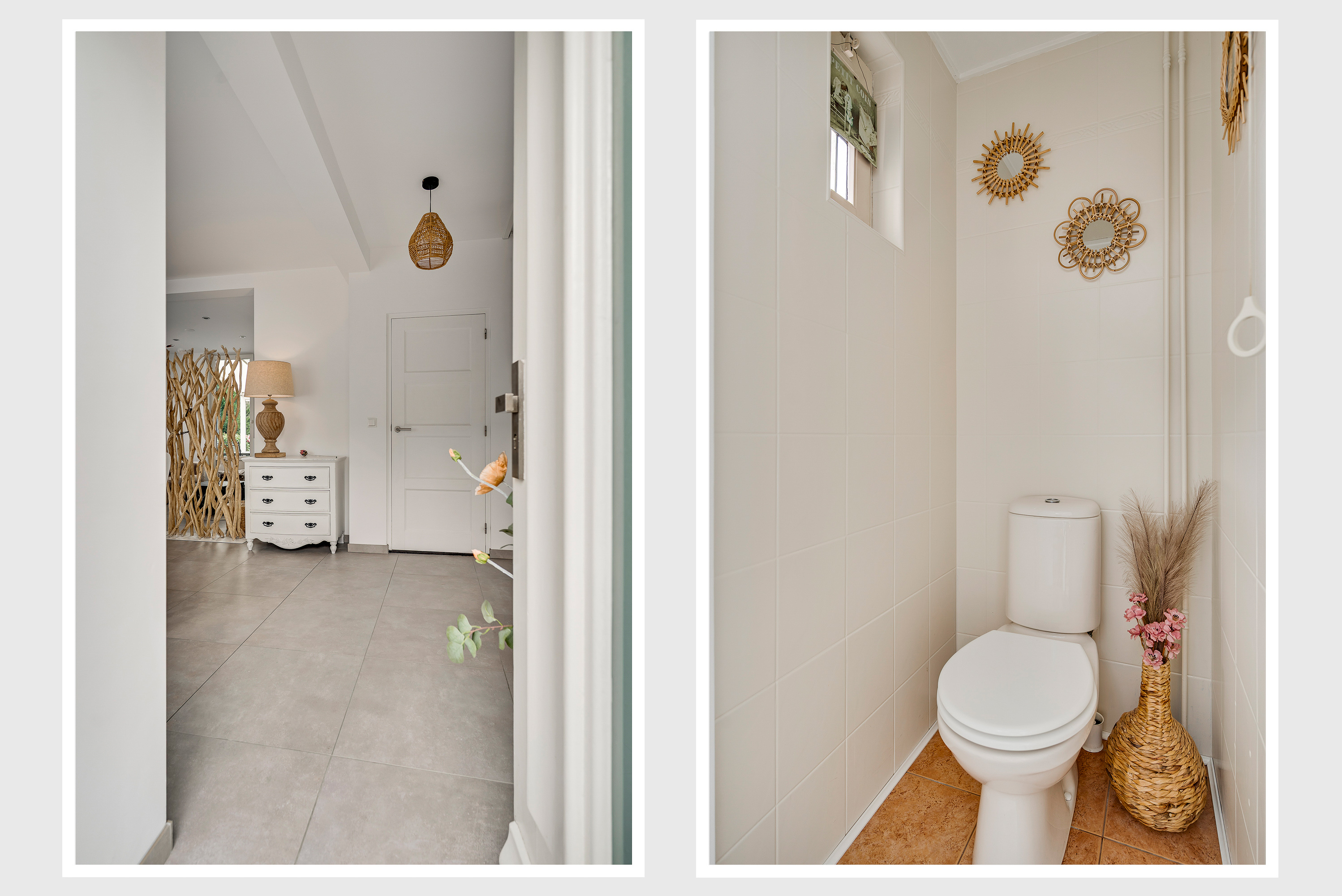 Aan de voorzijde, naast de oprit, is de entree van deze vrijstaande woning. De fraaie hal staat in open verbinding met de woonkamer (circa 27 m2). Fraaie elementen zijn de binnendeuren, de lichte tegelvloer met vloerverwarming en de ingebouwde pelletkachel. Openslaande deuren bij het eetgedeelte geven toegang tot de zijtuin en aan de achterzijde, bij het zitgedeelte, is een deur naar het overdekte terras en de achtertuin. Rechts in de hal zijn de meterkast, de trapopgang en de in lichte kleuren uitgevoerde toiletruimte.