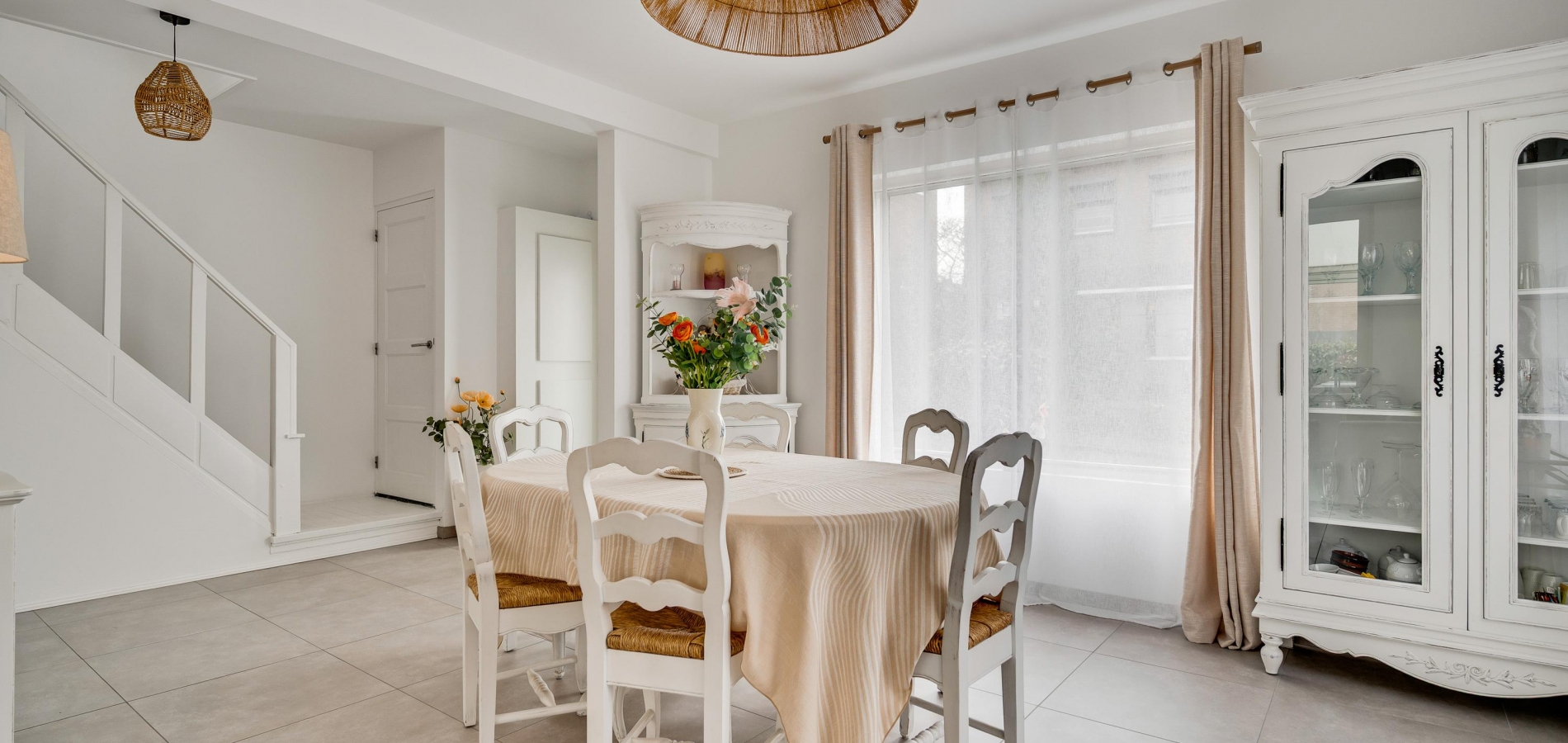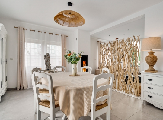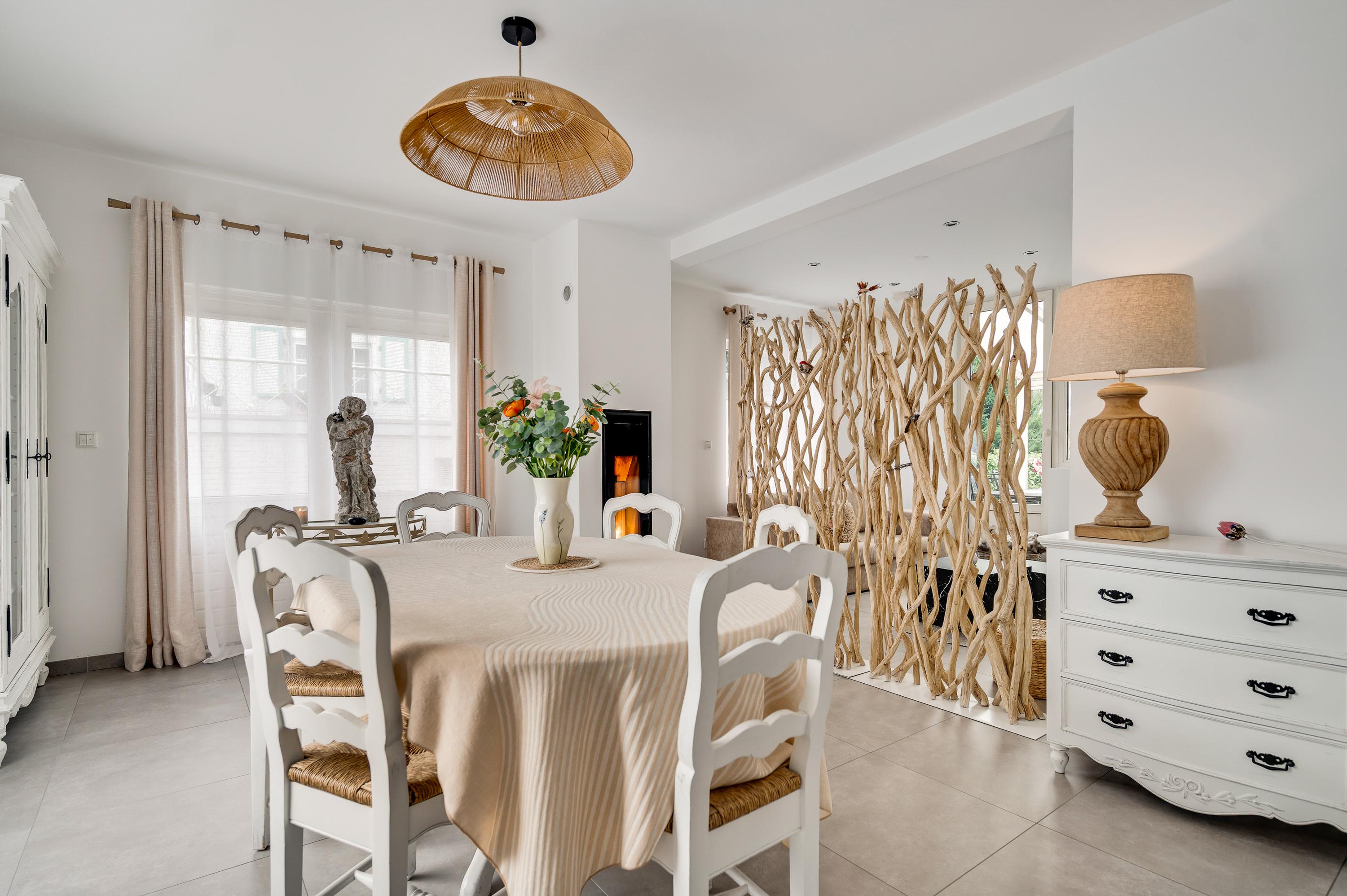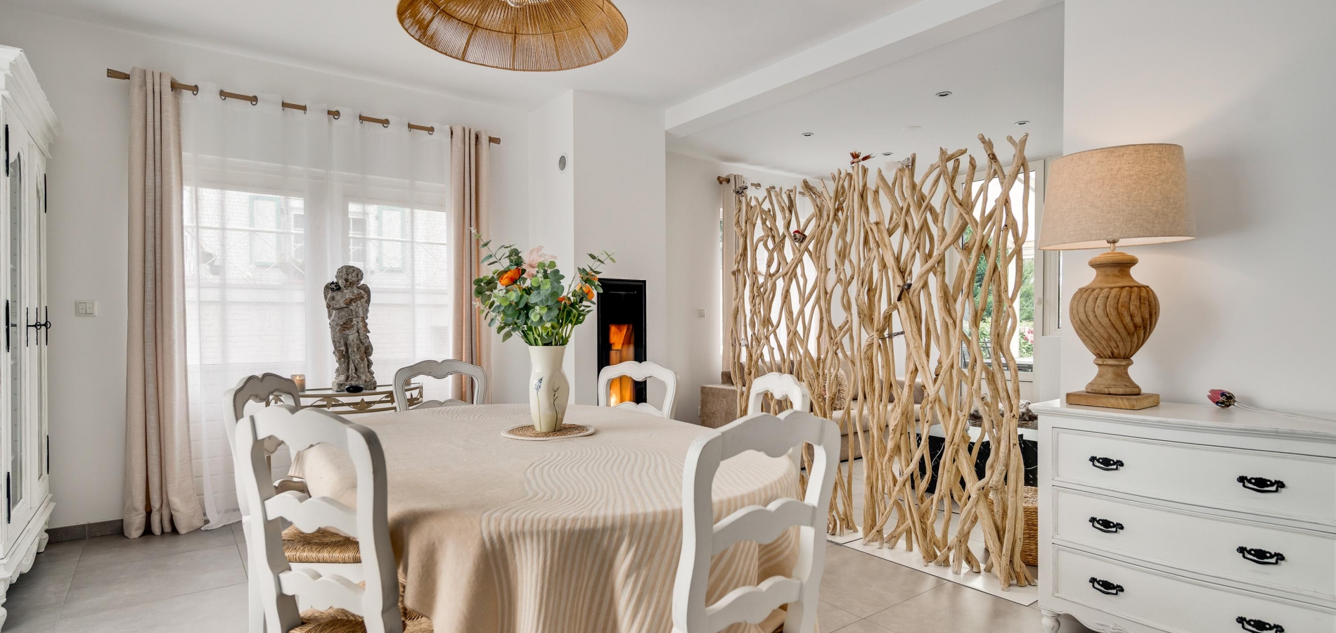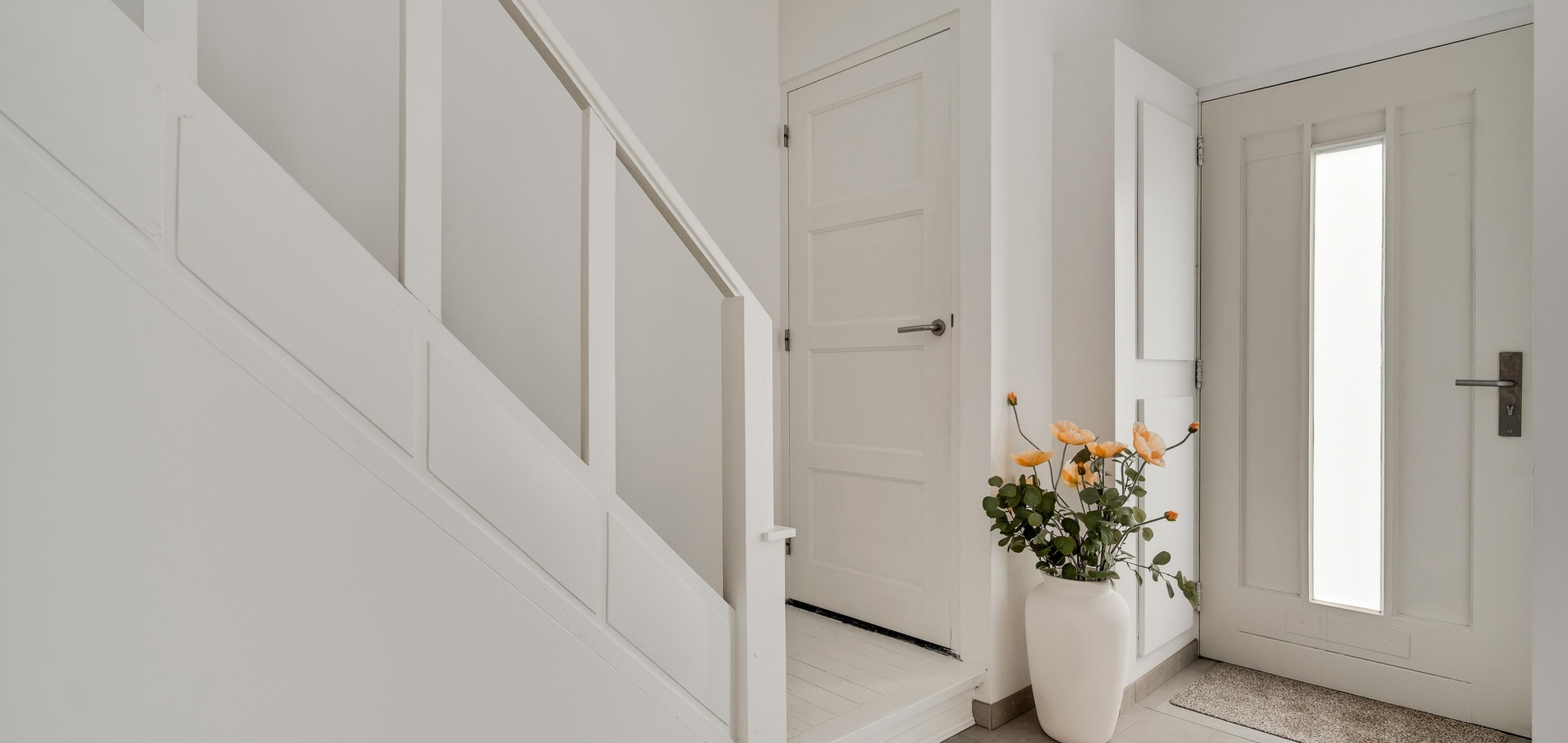 Aan de voorzijde, naast de oprit, is de entree van deze vrijstaande woning. De fraaie hal staat in open verbinding met de woonkamer (circa 27 m2). Fraaie elementen zijn de binnendeuren, de lichte tegelvloer met vloerverwarming en de ingebouwde pelletkachel. Openslaande deuren bij het eetgedeelte geven toegang tot de zijtuin en aan de achterzijde, bij het zitgedeelte, is een deur naar het overdekte terras en de achtertuin. Rechts in de hal zijn de meterkast, de trapopgang en de in lichte kleuren uitgevoerde toiletruimte.