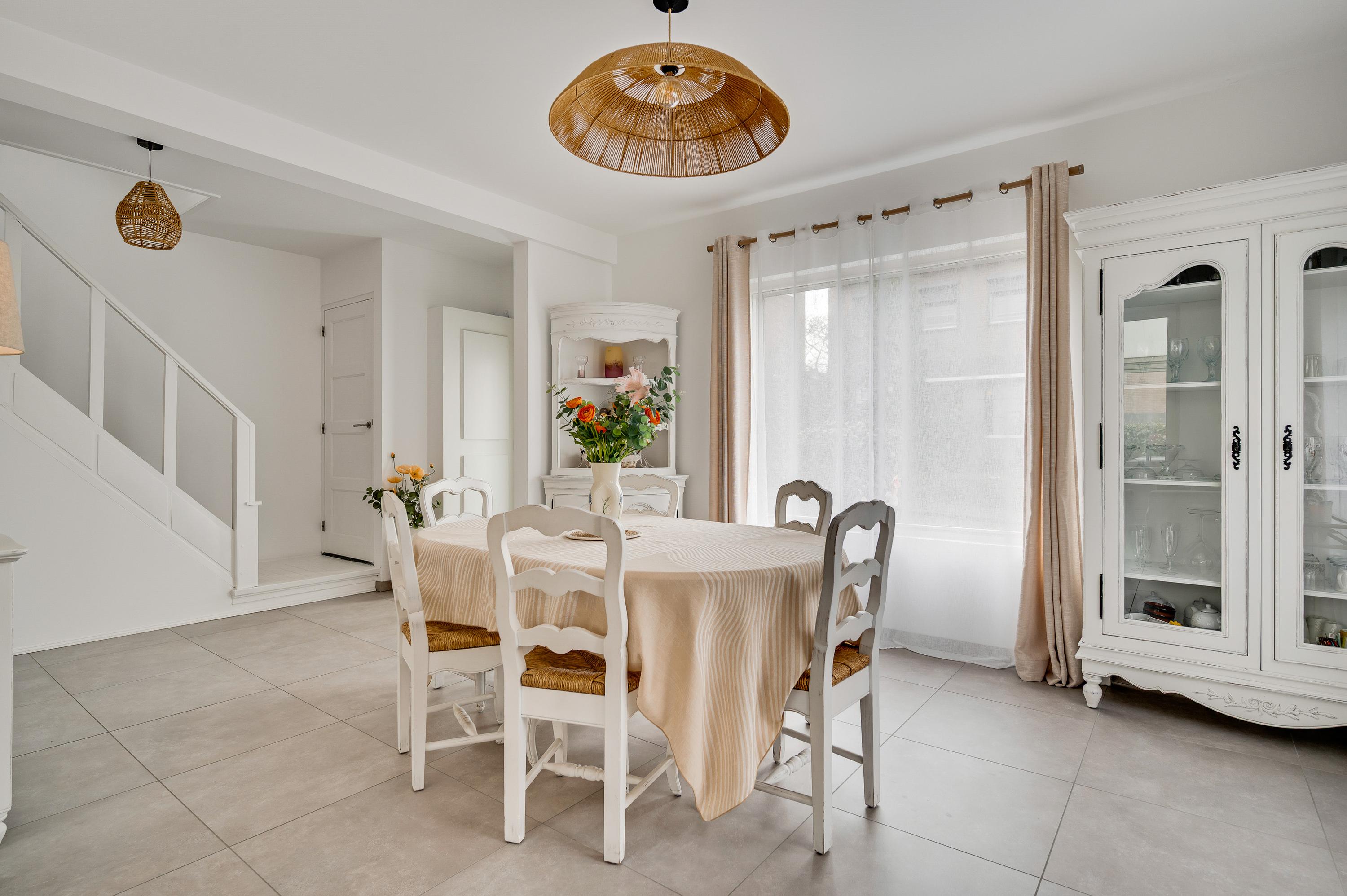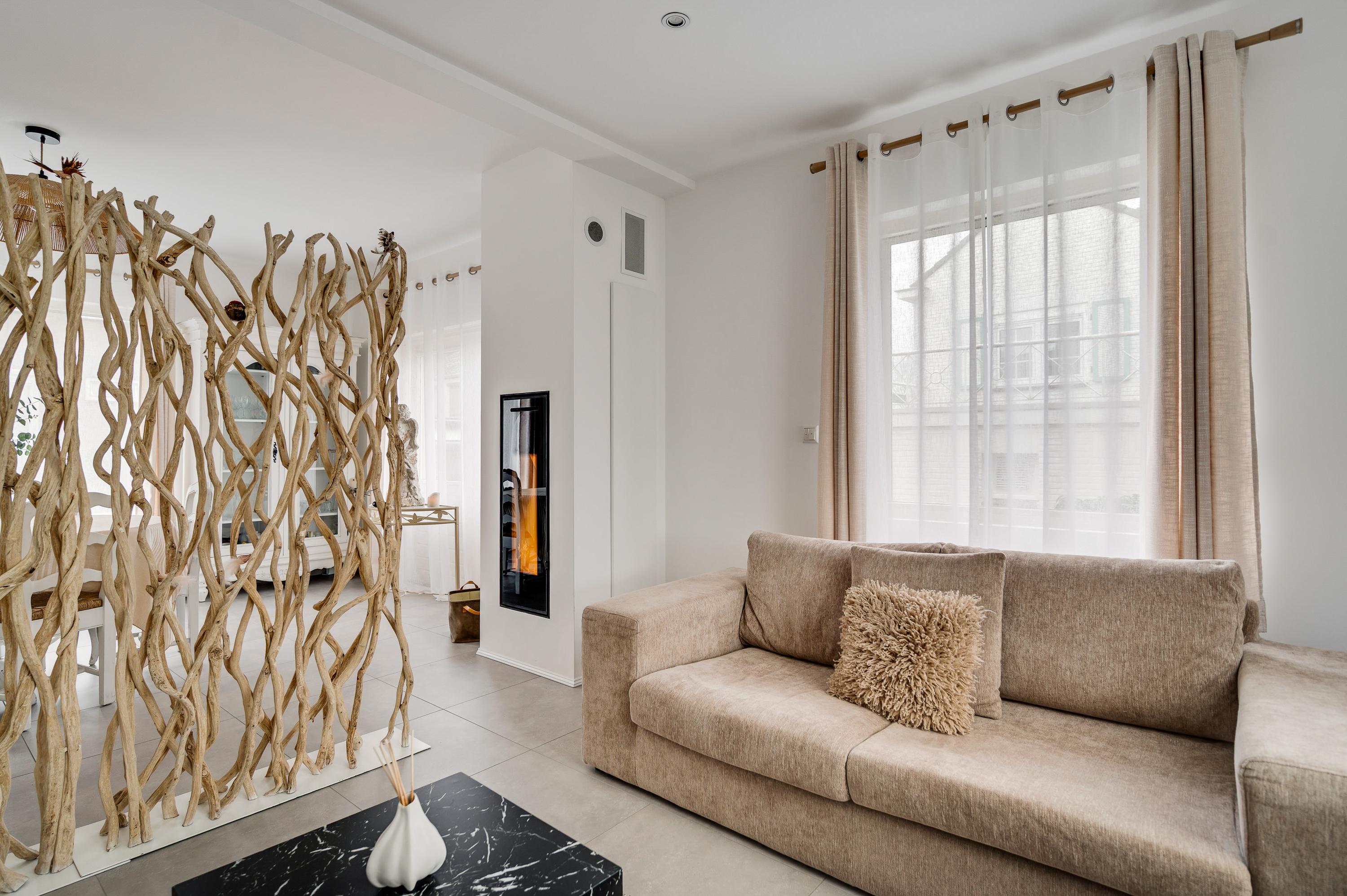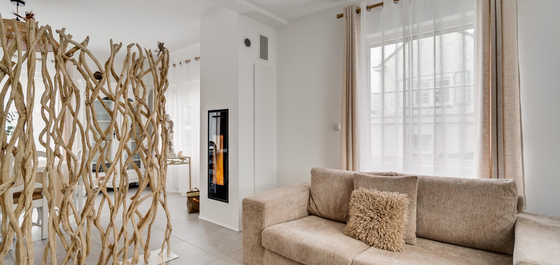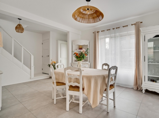 Aan de voorzijde, naast de oprit, is de entree van deze vrijstaande woning. De fraaie hal staat in open verbinding met de woonkamer (circa 27 m2). Fraaie elementen zijn de binnendeuren, de lichte tegelvloer met vloerverwarming en de ingebouwde pelletkachel. Openslaande deuren bij het eetgedeelte geven toegang tot de zijtuin en aan de achterzijde, bij het zitgedeelte, is een deur naar het overdekte terras en de achtertuin. Rechts in de hal zijn de meterkast, de trapopgang en de in lichte kleuren uitgevoerde toiletruimte.