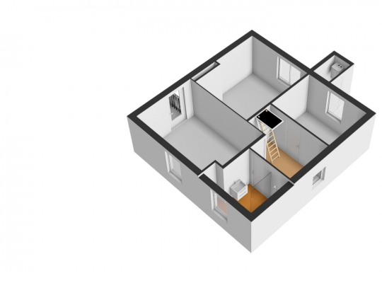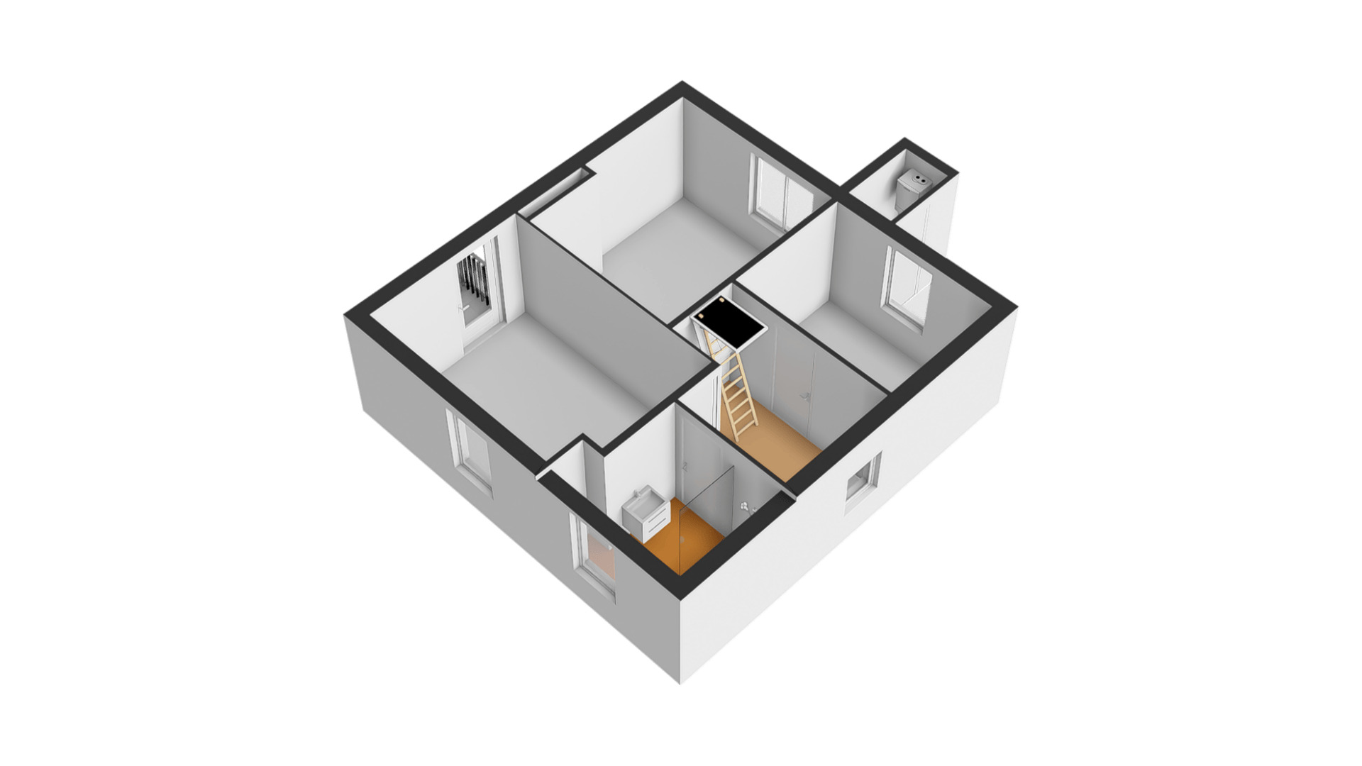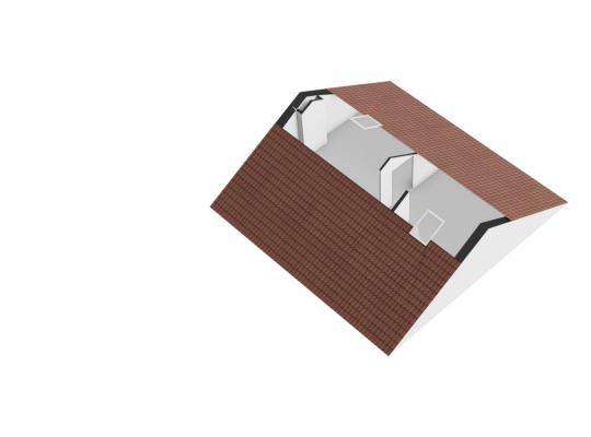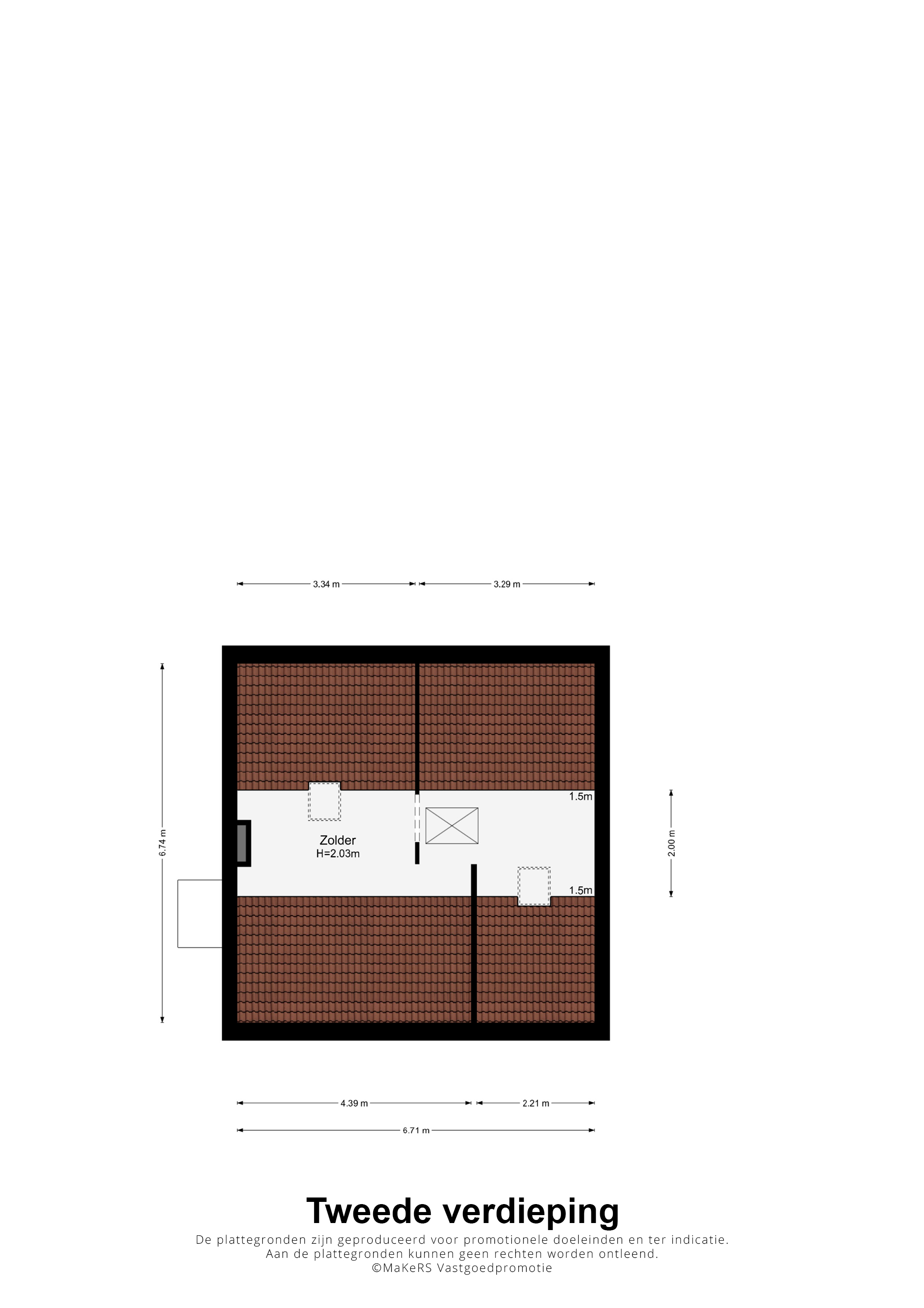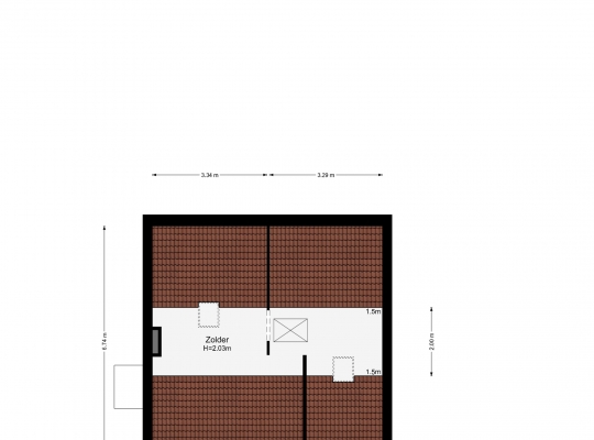 Achter het luik op de overloop is een trap naar de zolder (circa 6,71 x 6,74 vloeroppervlakte), met een hoogte van circa 2,03 meter.