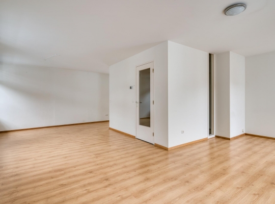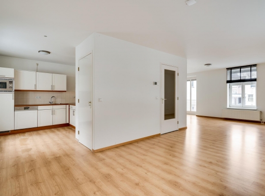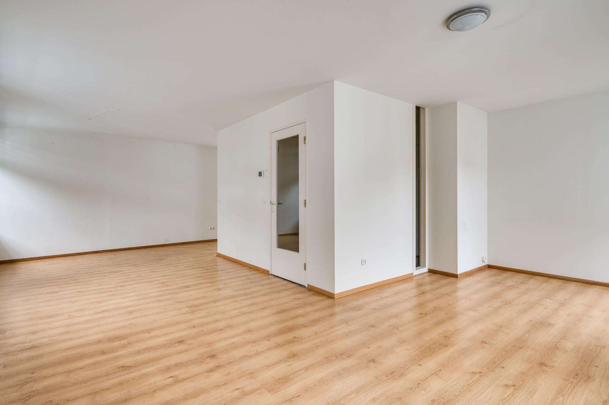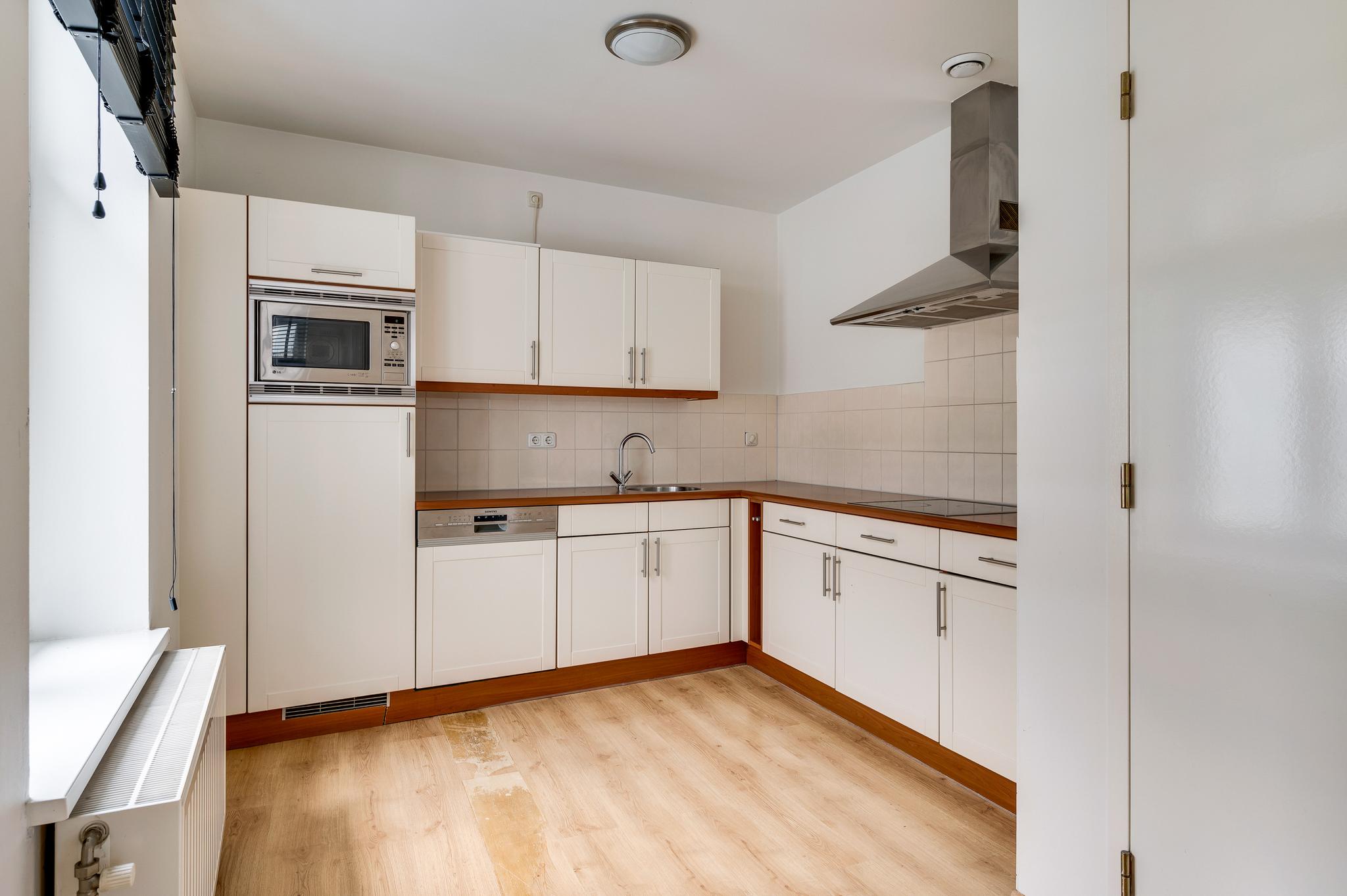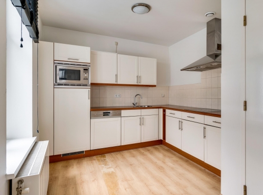 De L-vormige woonkamer (circa 38 m2) is een zeer royale leefruimte met grote ramen aan twee zijden. Aan de voorzijde kijkt u naar het pleintje, richting de Beekstraat en een deur geeft toegang tot het terras (circa 3,20 x 2,55). Aan de achterzijde, naast de plek waar vroeger de eettafel stond, is een brede doorgang naar een half open keuken (circa 2,75 x 2,94). Hier staat een lichte hoekopstelling met een keramische kookplaat, afzuigkap, vaatwasser, koelkast met vriesvak en een combimagnetron. In de woonkamer bevindt zich nog een opbergruimte voor bijvoorbeeld het terrasmeubilair.