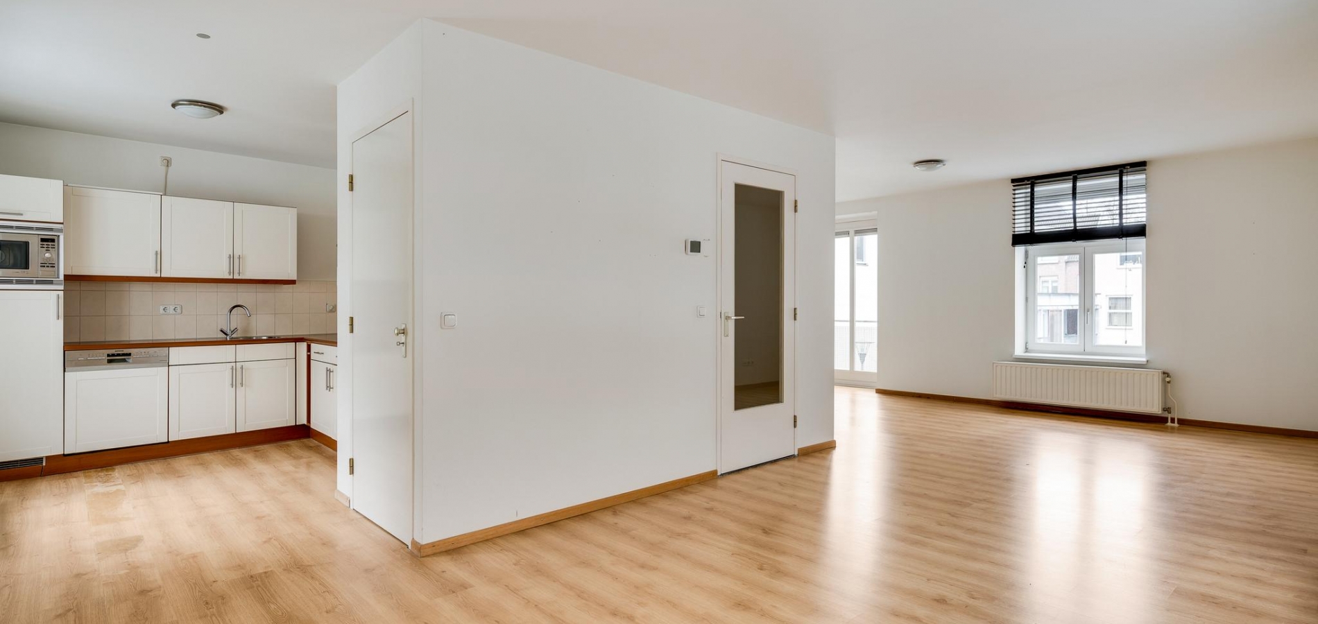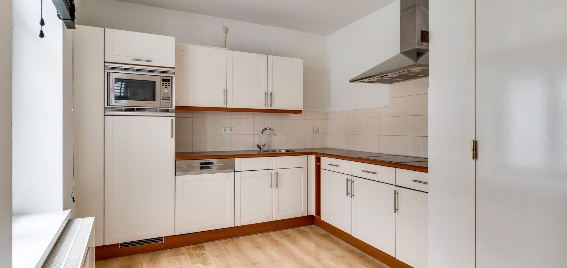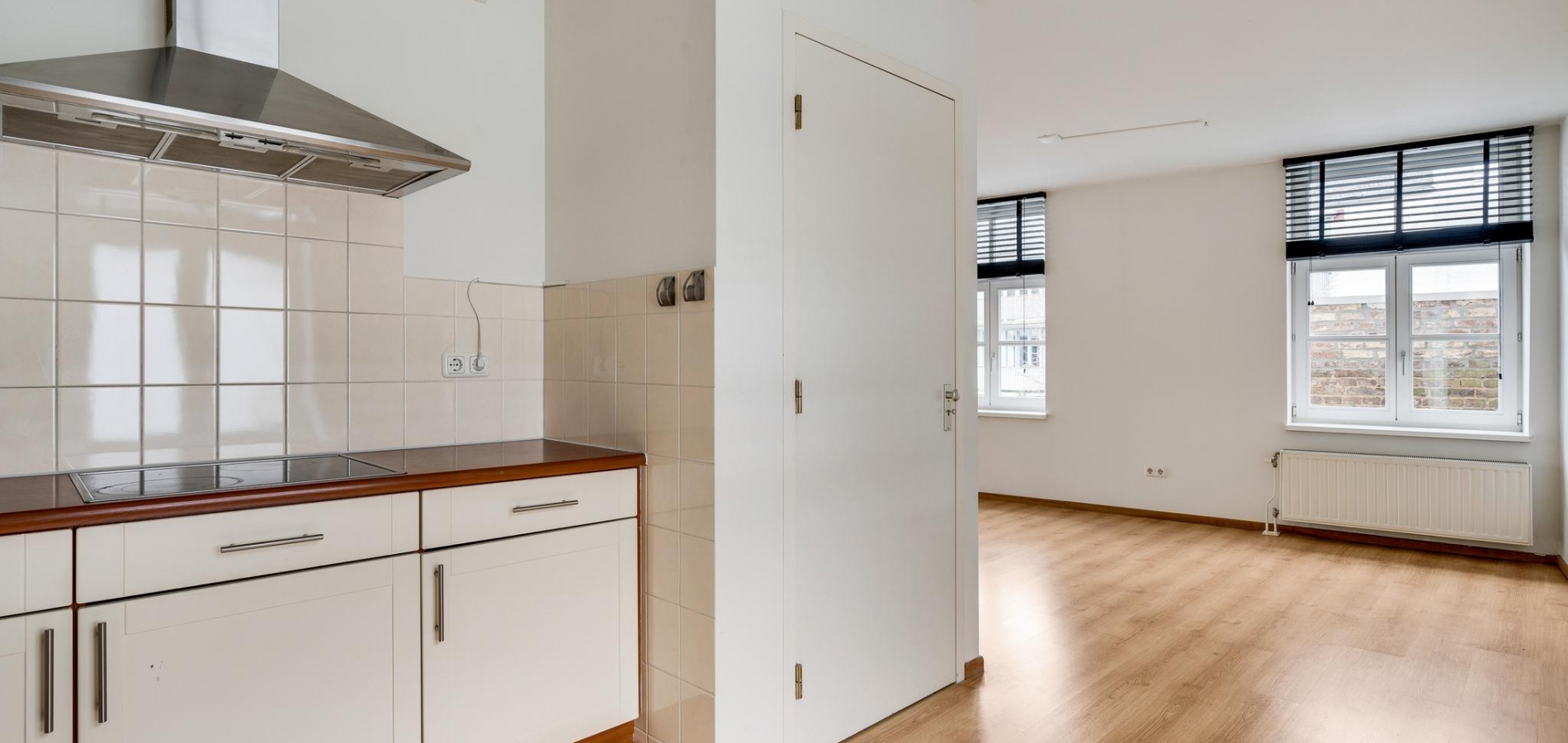 De L-vormige woonkamer (circa 38 m2) is een zeer royale leefruimte met grote ramen aan twee zijden. Aan de voorzijde kijkt u naar het pleintje, richting de Beekstraat en een deur geeft toegang tot het terras (circa 3,20 x 2,55). Aan de achterzijde, naast de plek waar vroeger de eettafel stond, is een brede doorgang naar een half open keuken (circa 2,75 x 2,94). Hier staat een lichte hoekopstelling met een keramische kookplaat, afzuigkap, vaatwasser, koelkast met vriesvak en een combimagnetron. In de woonkamer bevindt zich nog een opbergruimte voor bijvoorbeeld het terrasmeubilair.