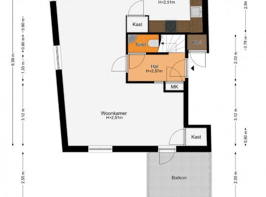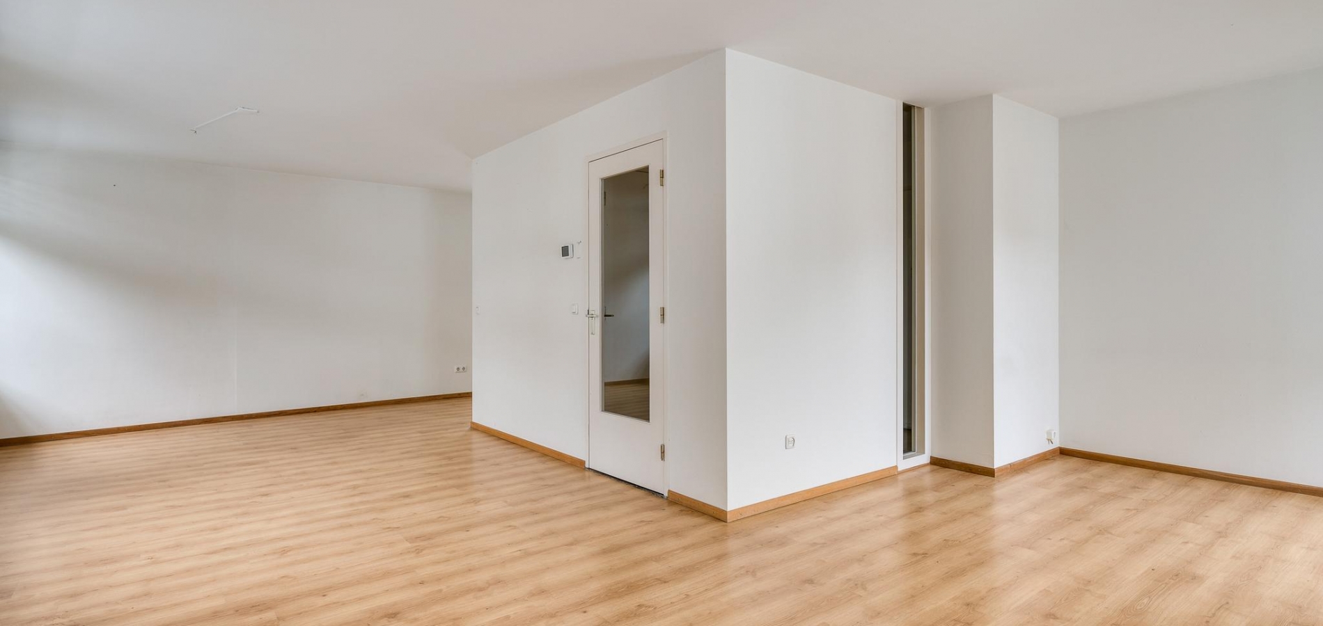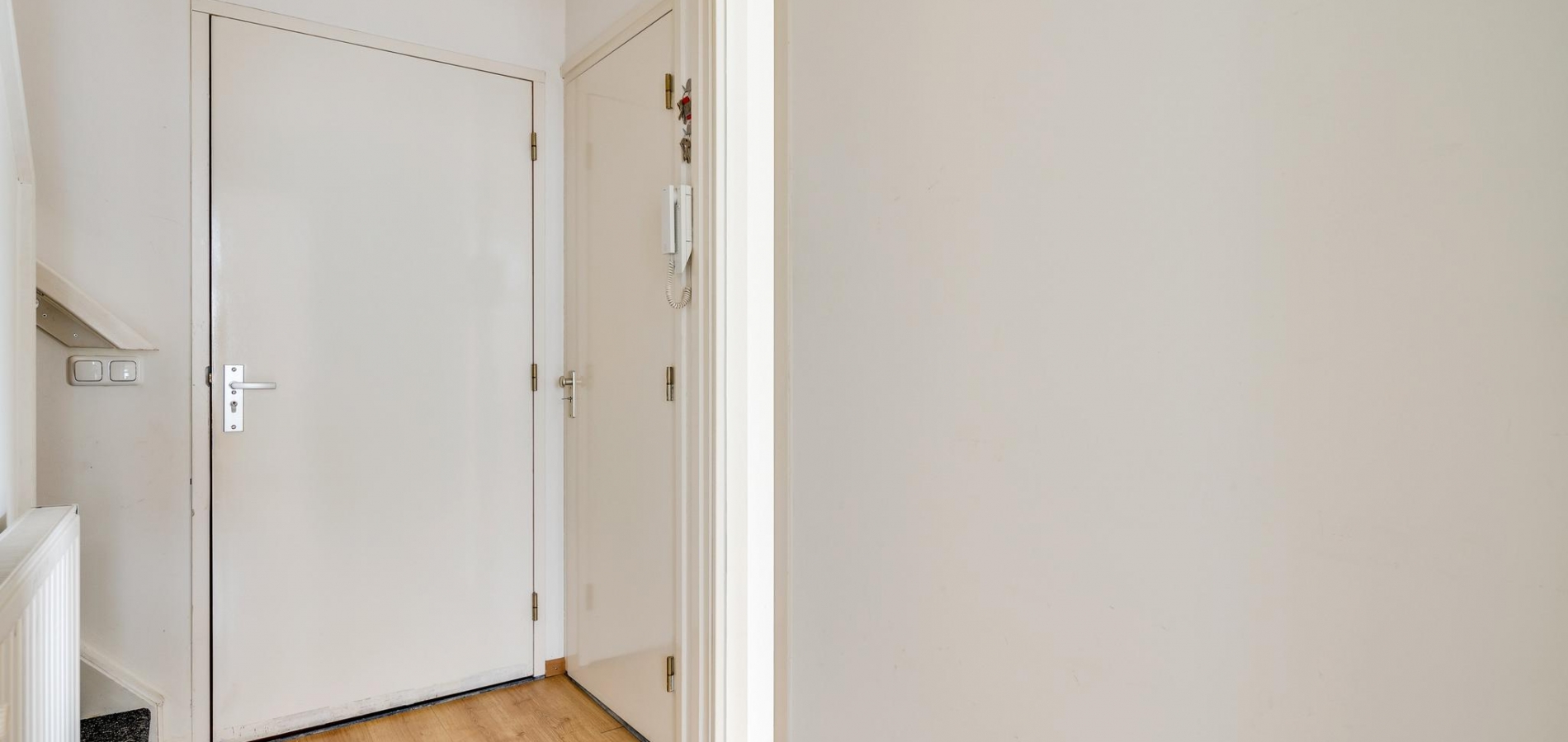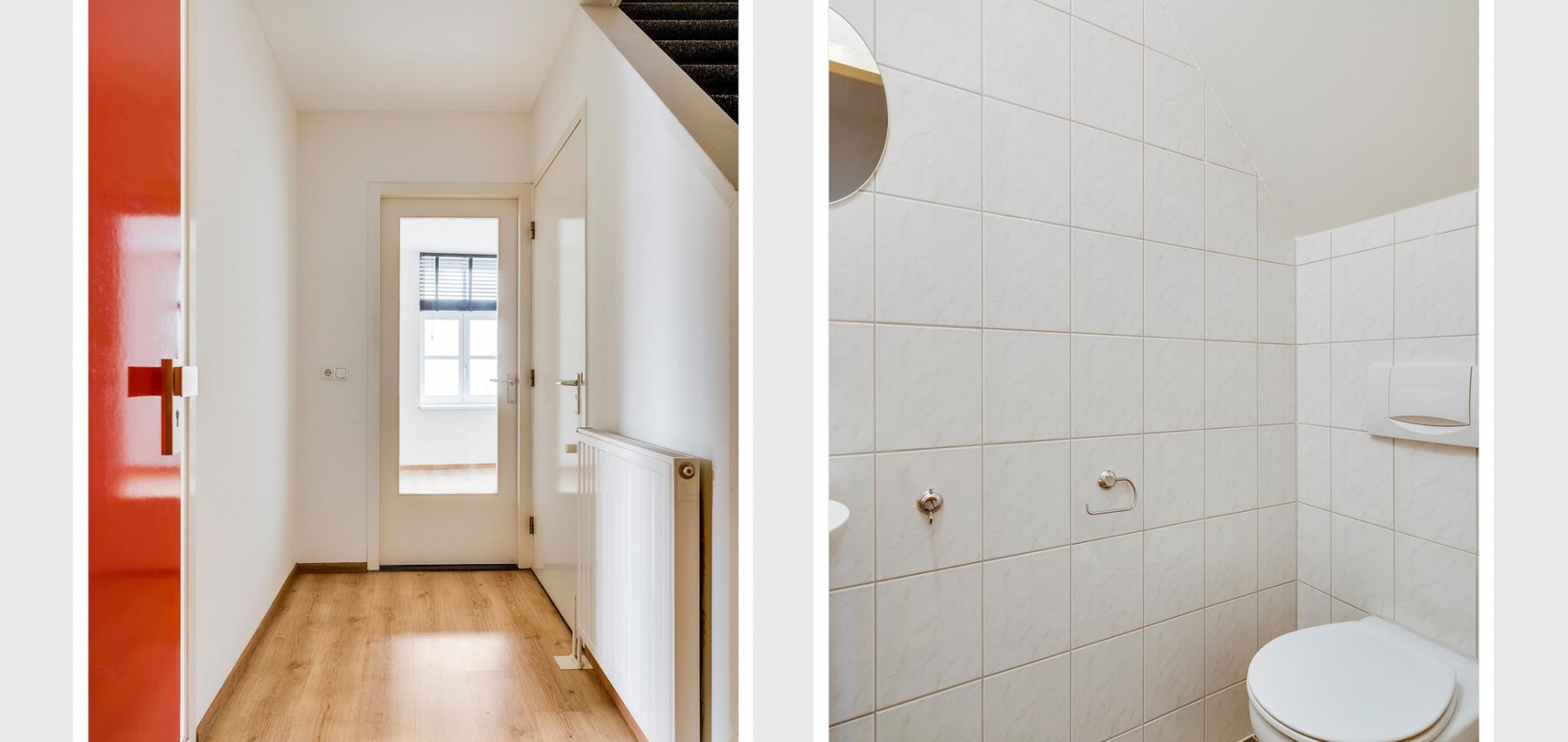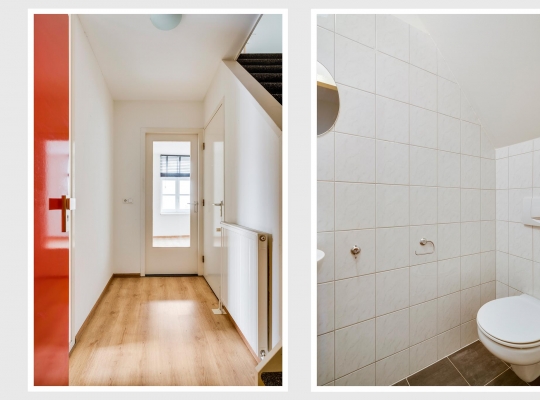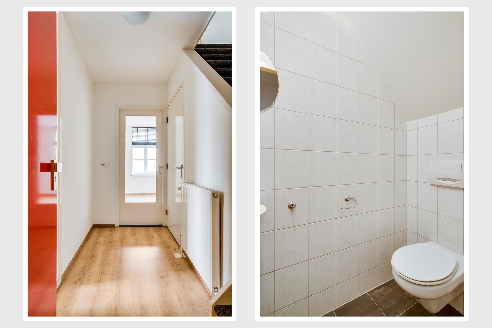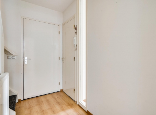 Open de voordeur naar de hal van het appartement (circa 2,85 x 1,33), met de trap naar de tweede verdieping en de toiletruimte aan de rechterzijde. Op de trap ligt tapijt en in de hal ligt, net als op bijna de hele eerste verdieping, laminaat op de vloer. Door het raam in de woonkamerdeur valt veel licht naar binnen, waardoor de hal nog ruimer oogt.
