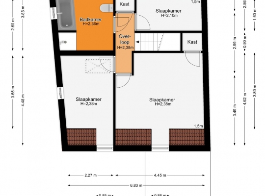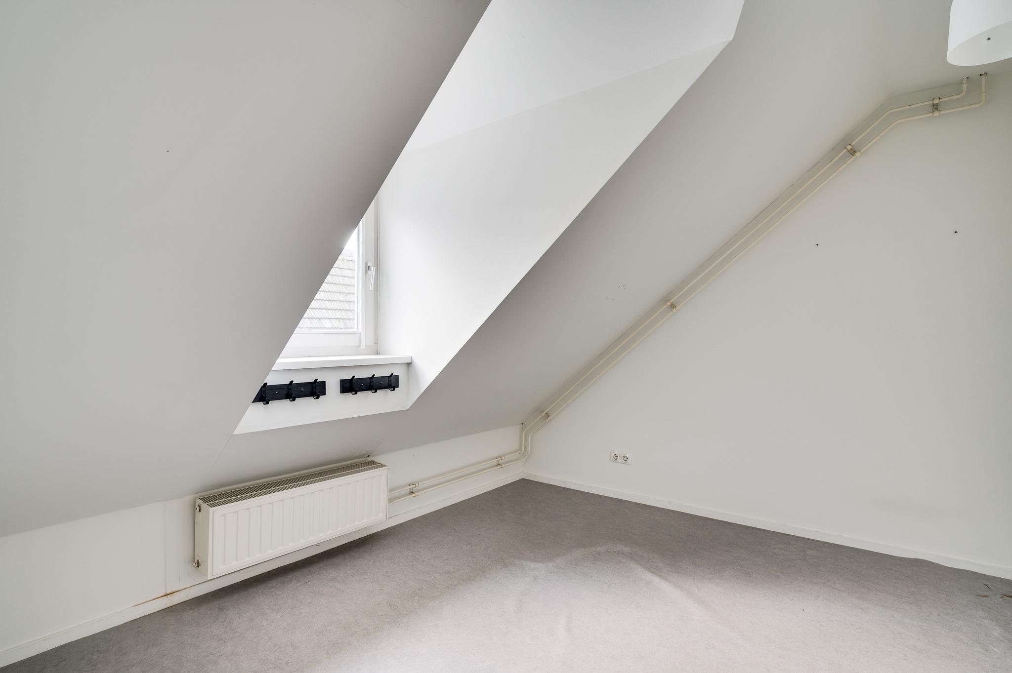 Een verdieping hoger zijn de slaapkamers, drie in totaal. Deze kamers zijn, net als de badkamer en een diepe bergkast, te bereiken vanaf de overloop. Slaapkamer I (circa 4,45 x 4,62) met inbouwkast is, net als slaapkamer II(circa 4,48 x 2,77) aan de voorzijde met uitzicht naar het pleintje. Aan de achterzijde is slaapkamer III (circa 3,20 x 2,86) die, net als de andere slaapkamers, een mooie dakkapel heeft.