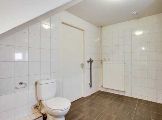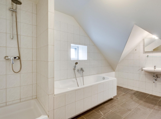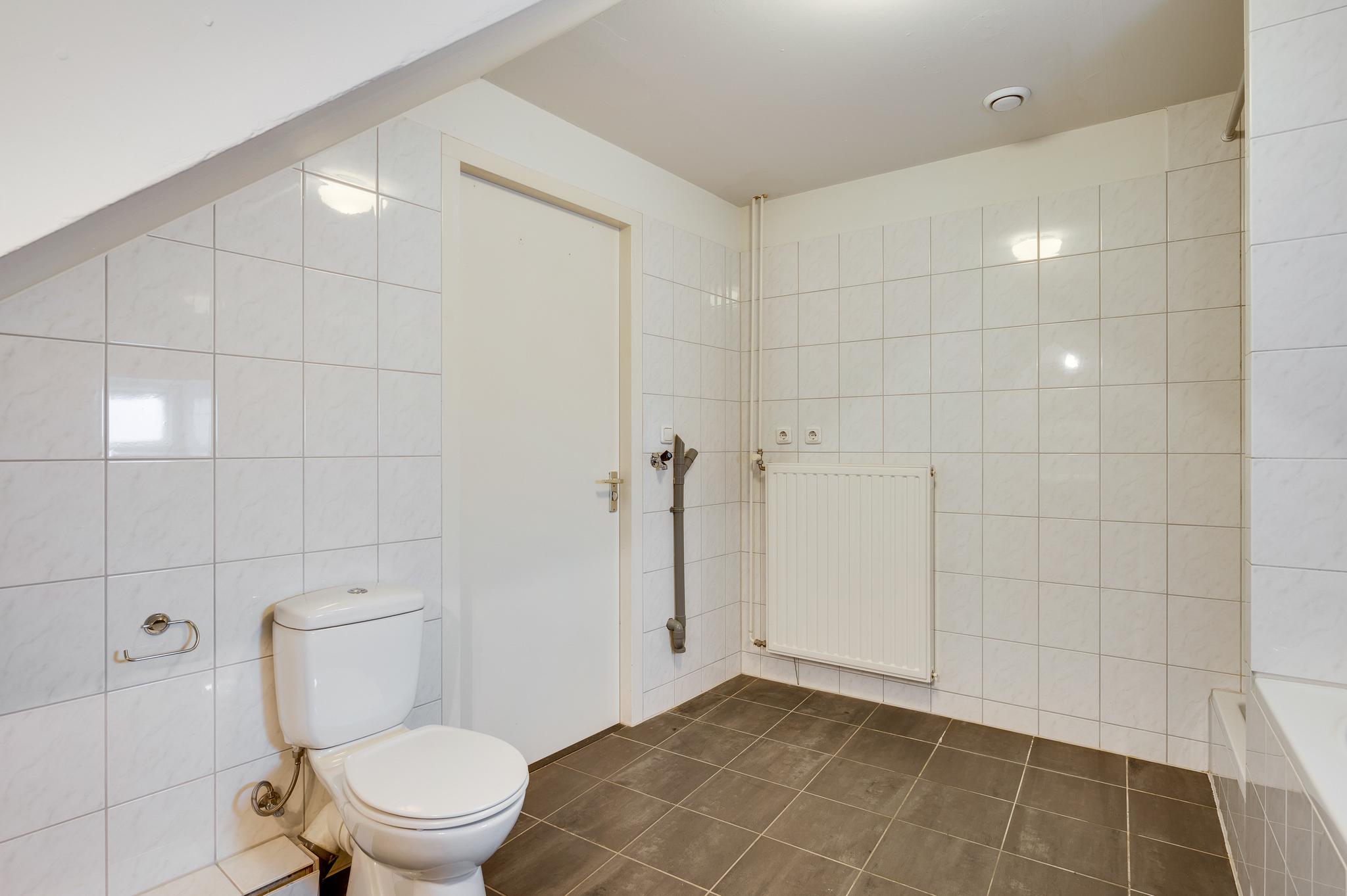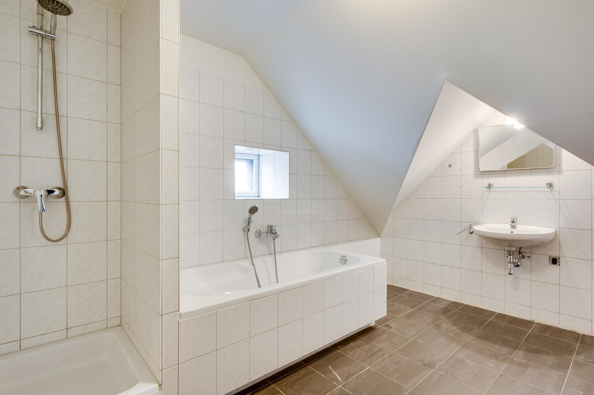 De badkamer (circa 3,85 x 3,00), met speelse schuine daklijnen en een raam, is ingedeeld met een ligbad, aparte douche, wastafel en een tweede toilet. Witte wandtegels zijn gecombineerd met grijze vloertegels en keurig wit sanitair. Ook is in de badkamer, naast de radiator, de aansluitingen voor de wasmachine en droger.