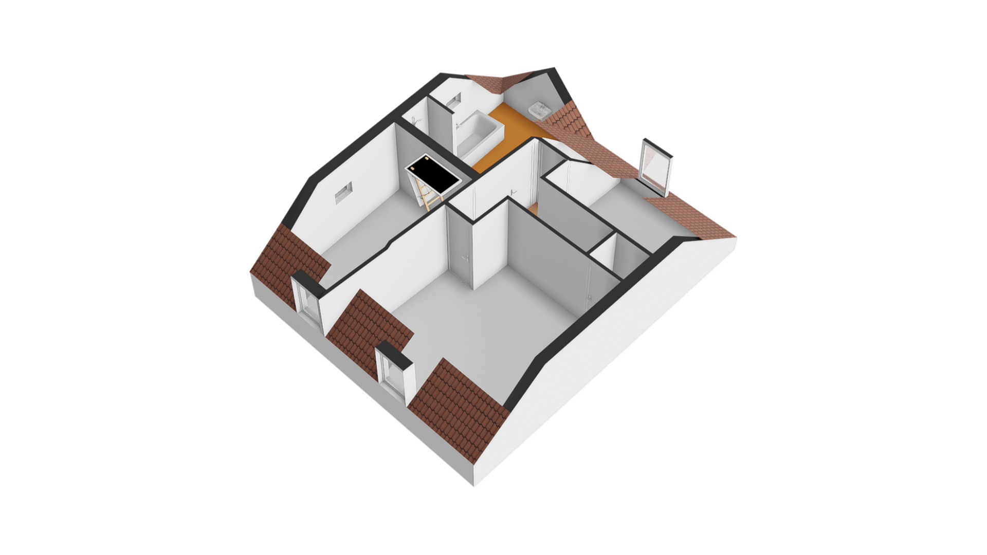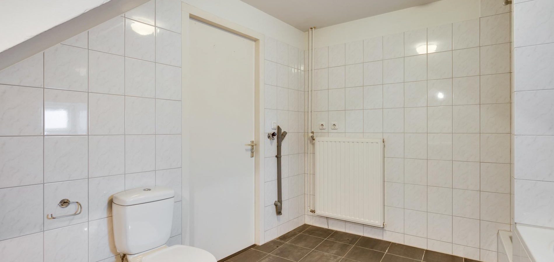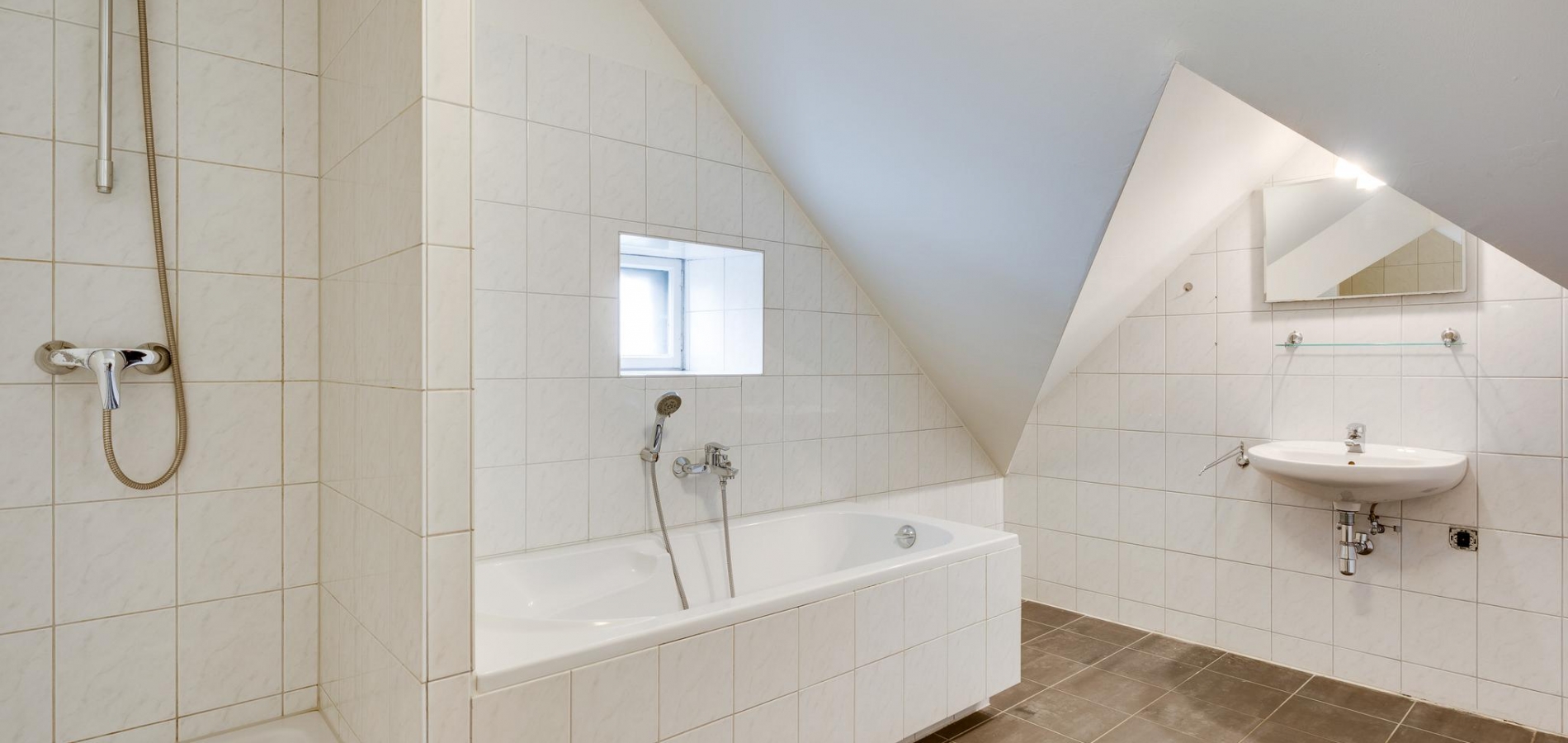 De badkamer (circa 3,85 x 3,00), met speelse schuine daklijnen en een raam, is ingedeeld met een ligbad, aparte douche, wastafel en een tweede toilet. Witte wandtegels zijn gecombineerd met grijze vloertegels en keurig wit sanitair. Ook is in de badkamer, naast de radiator, de aansluitingen voor de wasmachine en droger.