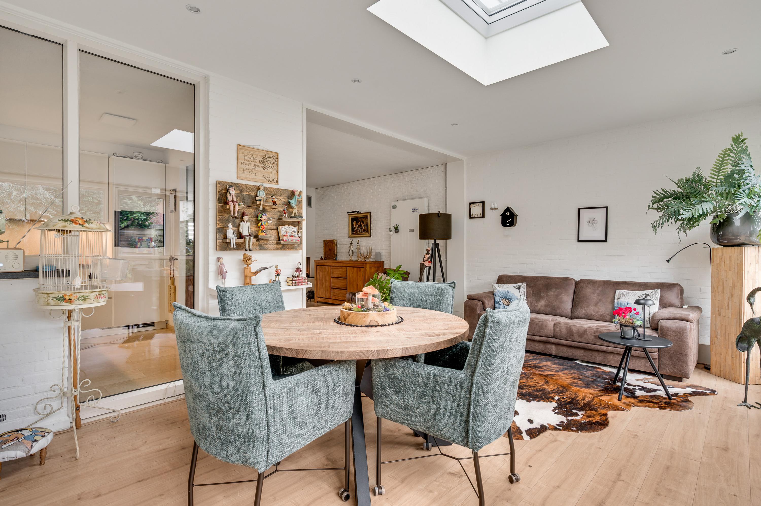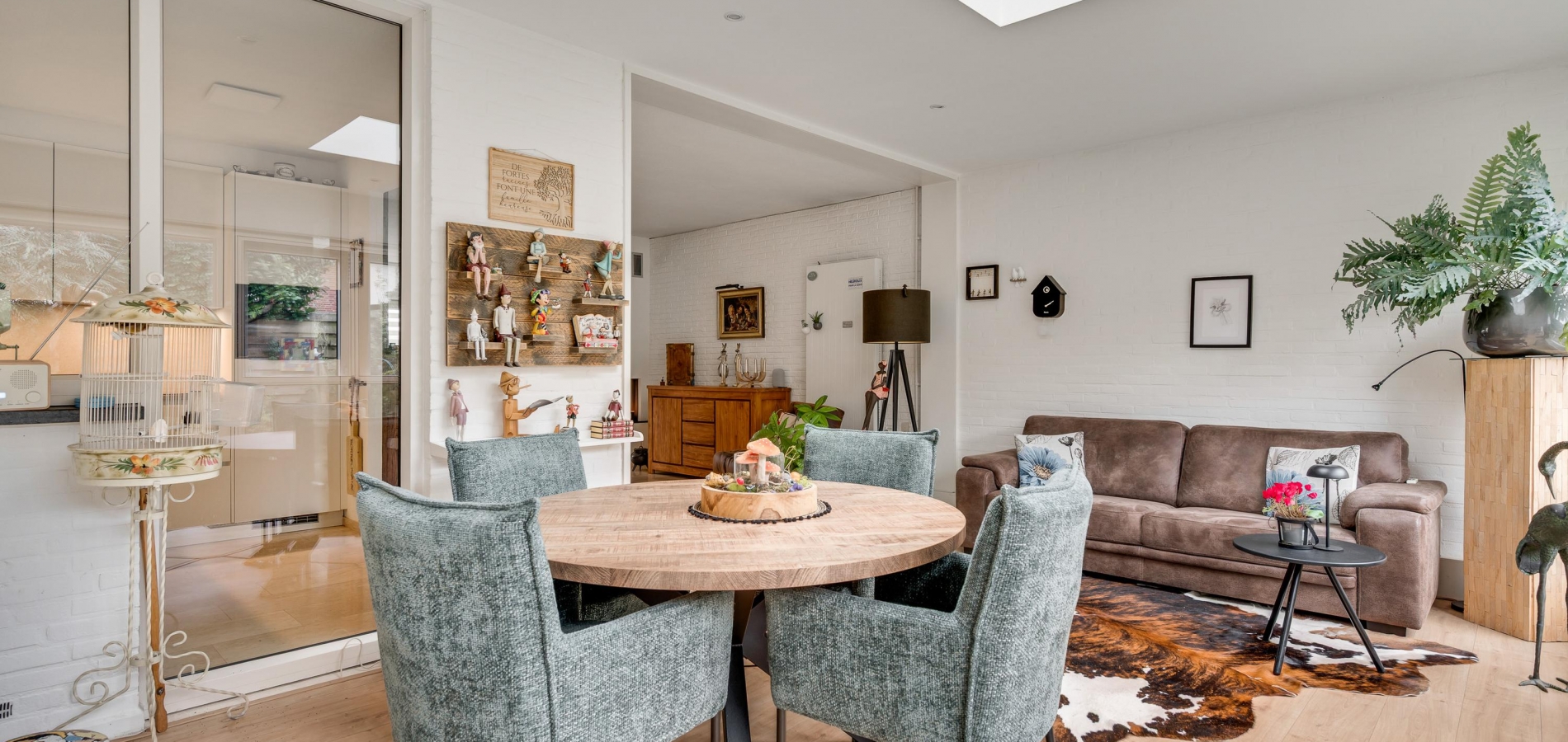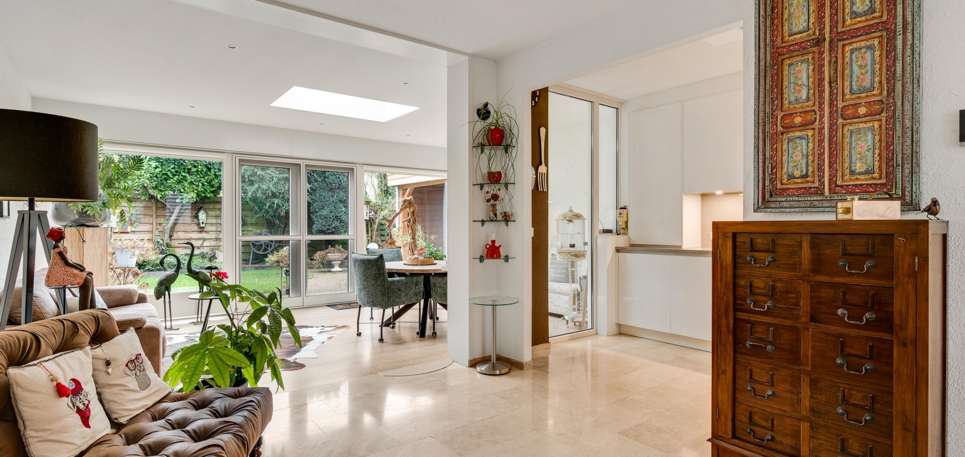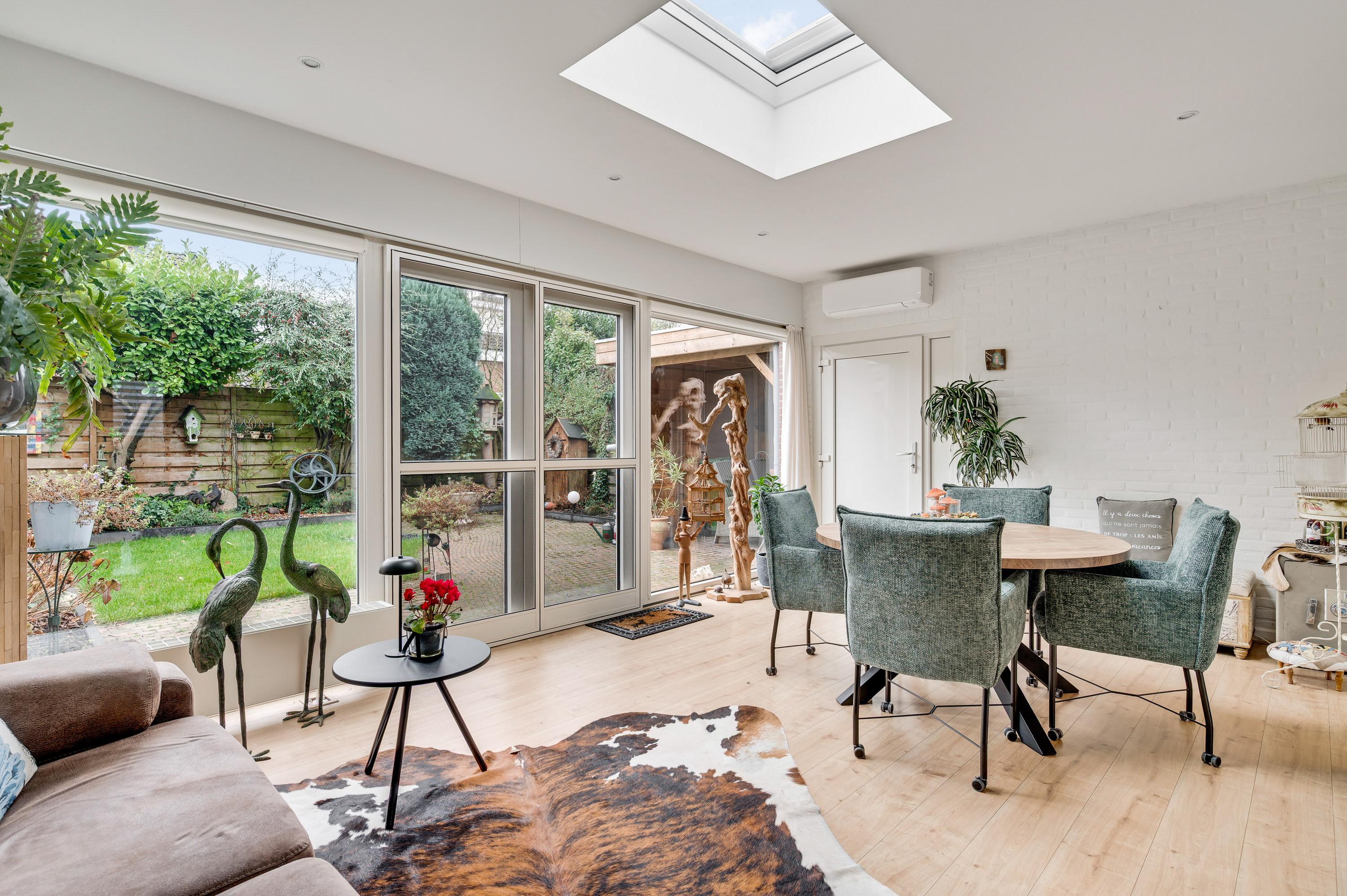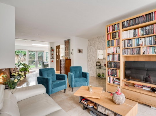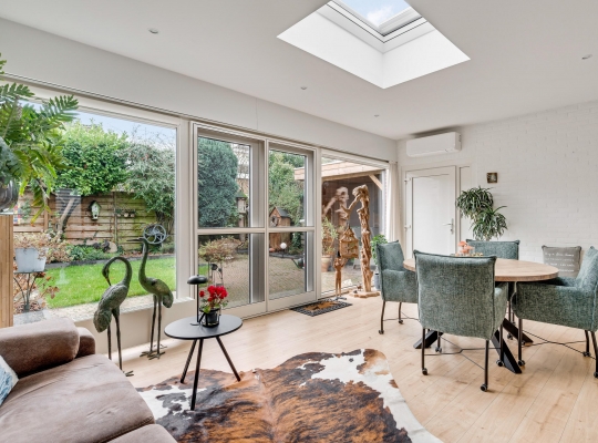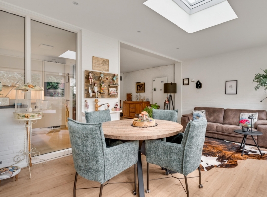De ruim 8 meter lange woonkamer is aan de achterzijde uitgebouwd met een grote, lichte serre. Het resultaat is een leefruimte van circa 50 m2, met een gashaard bij het zitgedeelte en een stijlvolle wandafwerking. In de serre, waar laminaat op de vloer ligt, zorgen grote ramen en een lichtkoepel voor veel lichtinval.