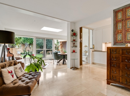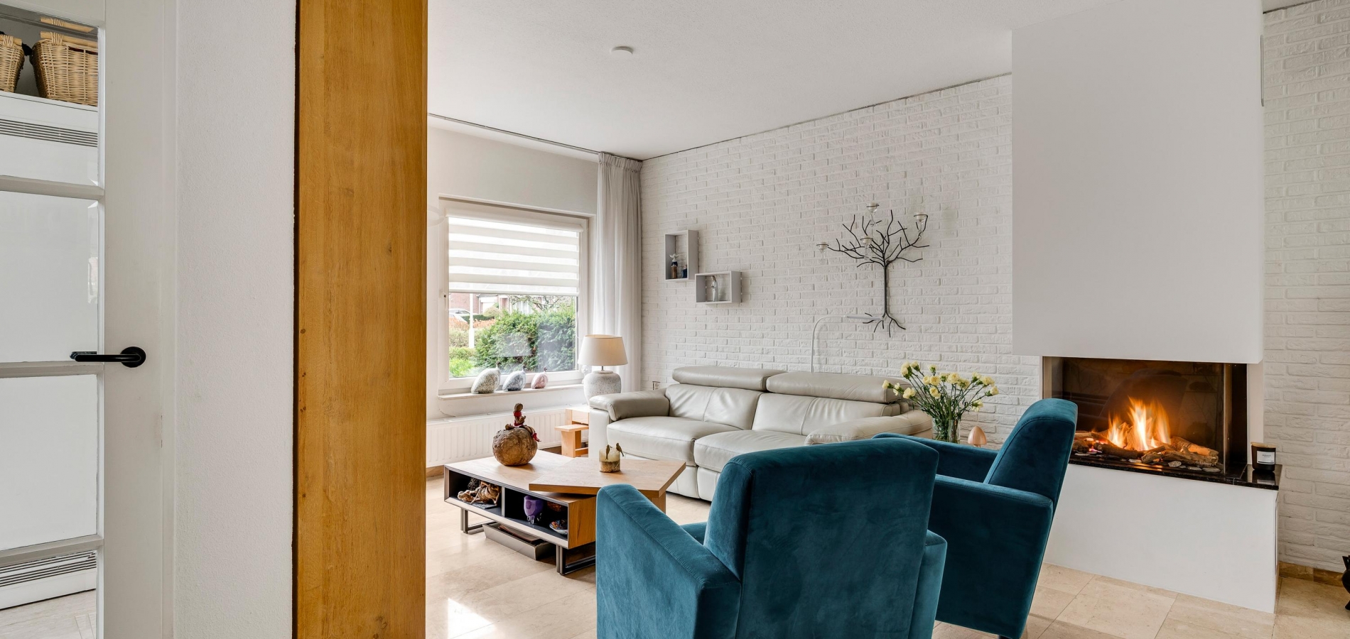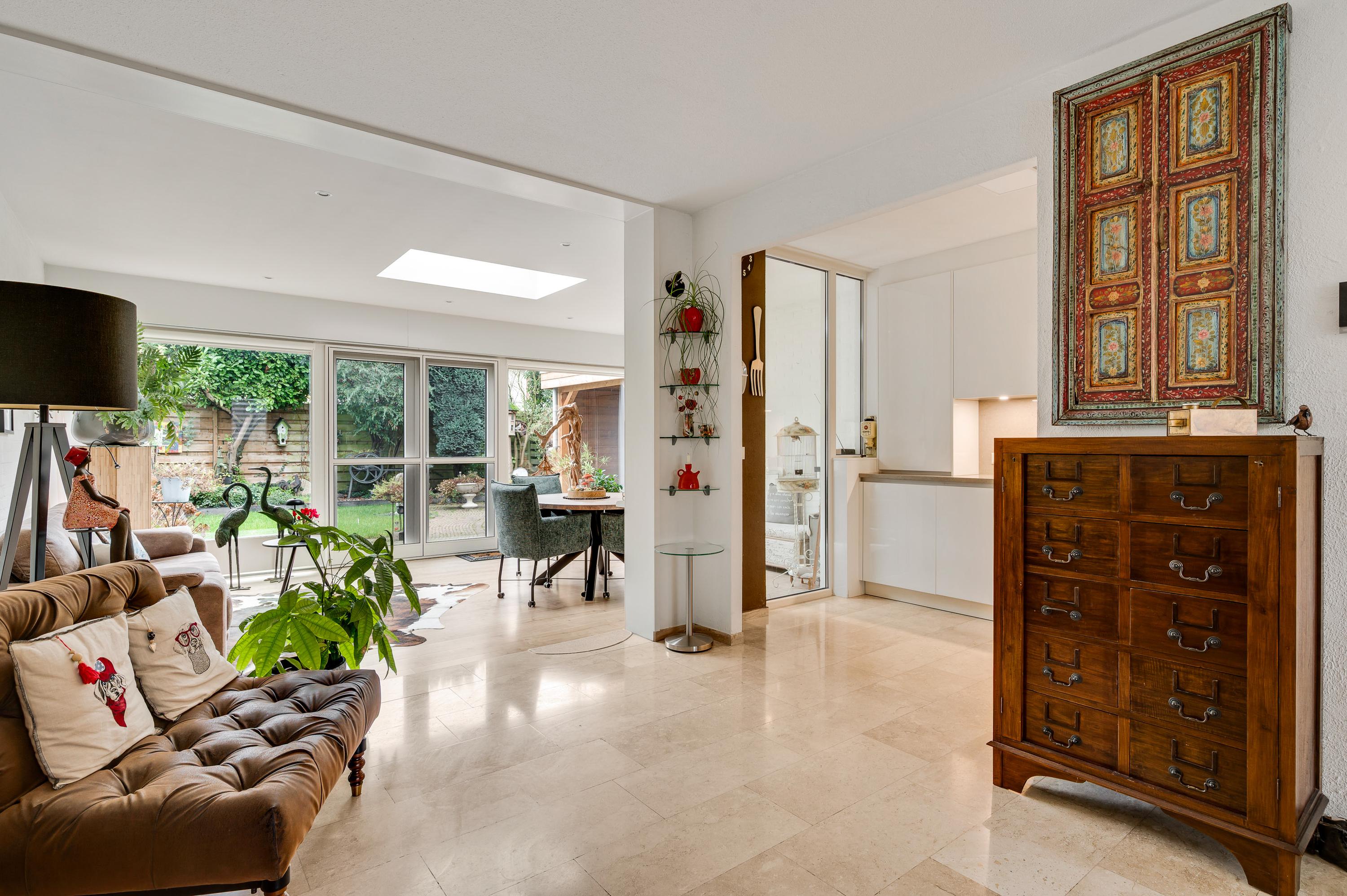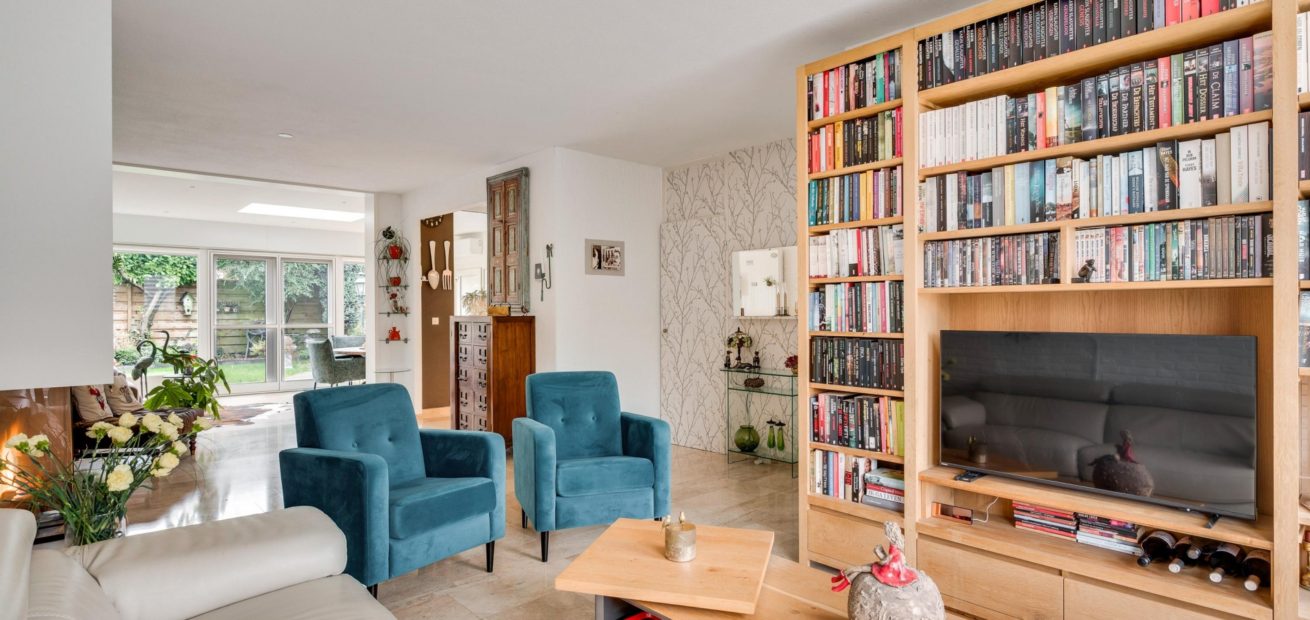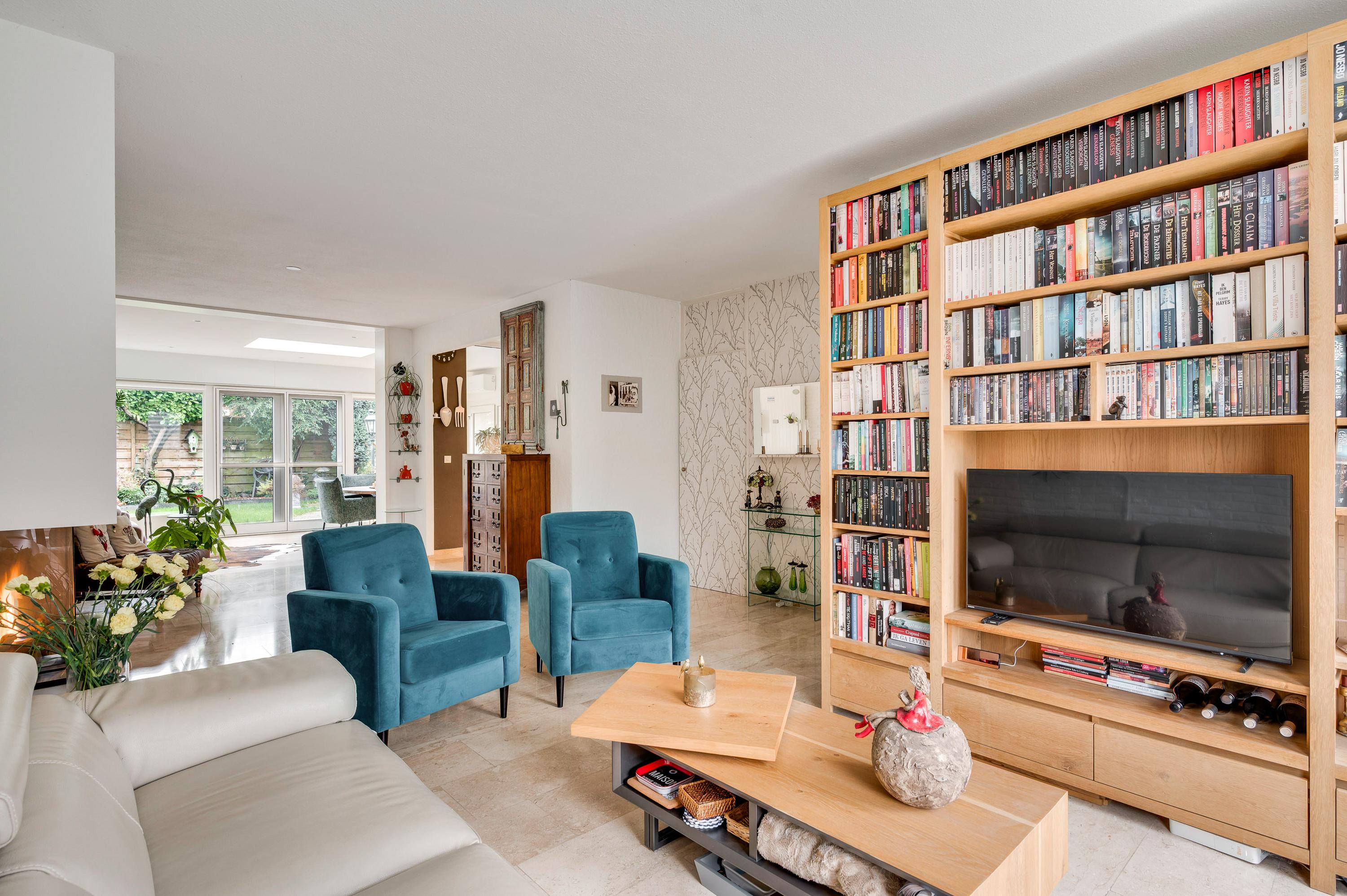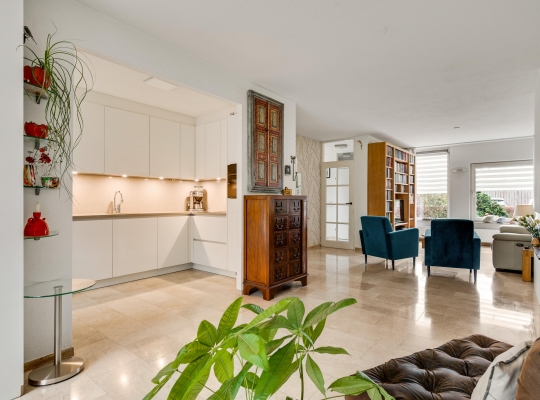 De ruim 8 meter lange woonkamer is aan de achterzijde uitgebouwd met een grote, lichte serre. Het resultaat is een leefruimte van circa 50 m2, met een gashaard bij het zitgedeelte en een stijlvolle wandafwerking. In de serre, waar laminaat op de vloer ligt, zorgen grote ramen en een lichtkoepel voor veel lichtinval.