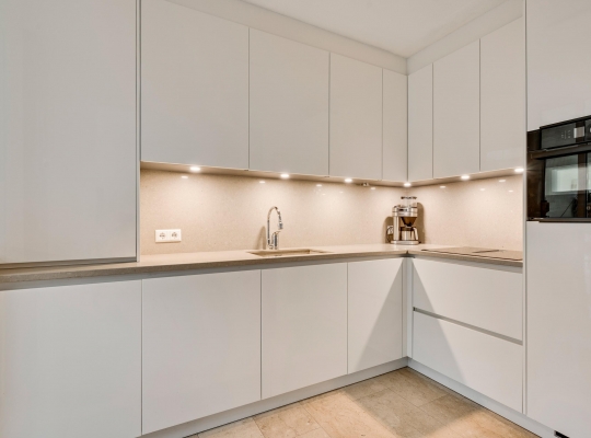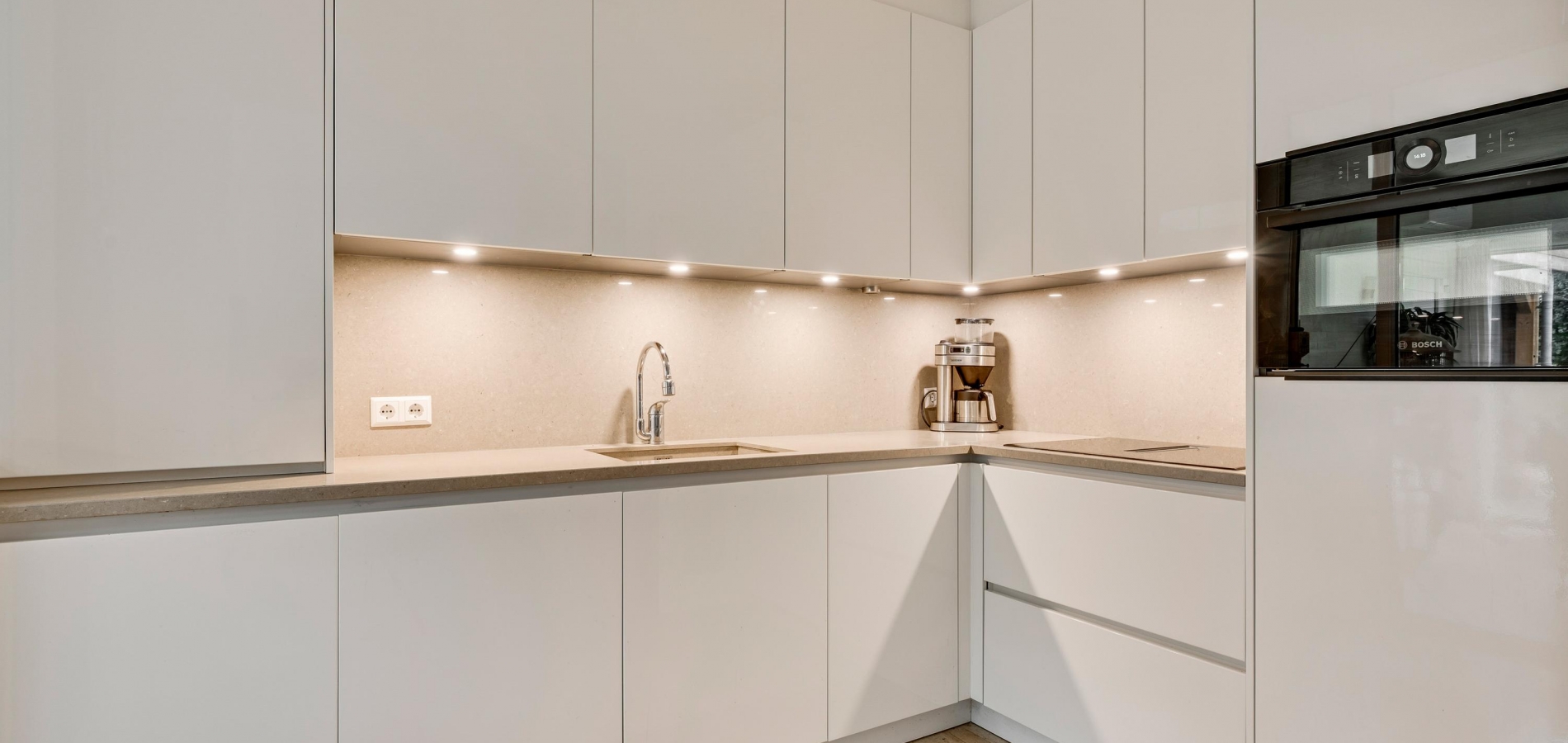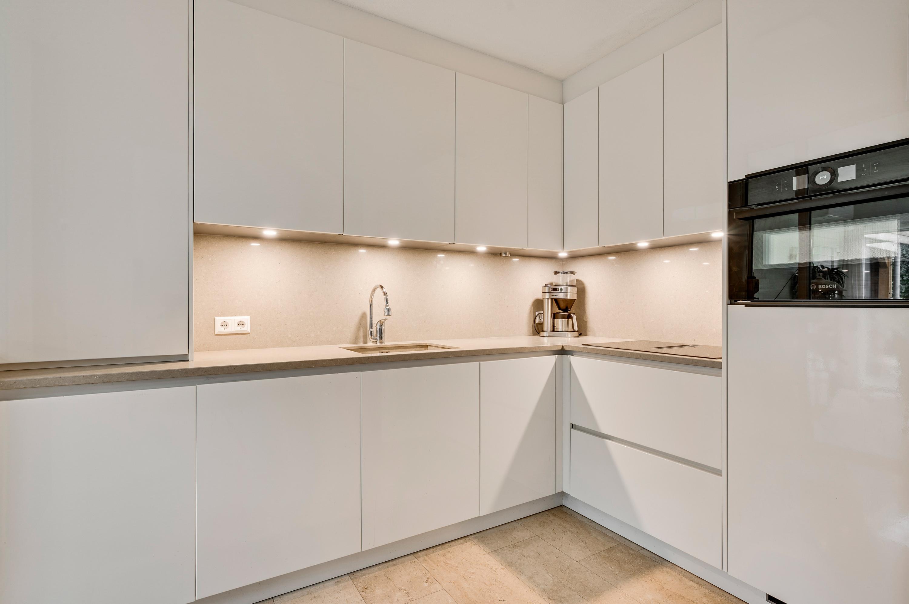 Een brede doorgang verbindt de woonkamer met de keuken waar een moderne hoekopstelling in een lichte kleur staat. Grote kasten, onder en boven het aanrecht, en twee lades bieden volop bergruimte en alle benodigde apparatuur is ingebouwd: een inductie kookplaat met afzuiging, een vaatwasser, combi-oven en een koelkast.