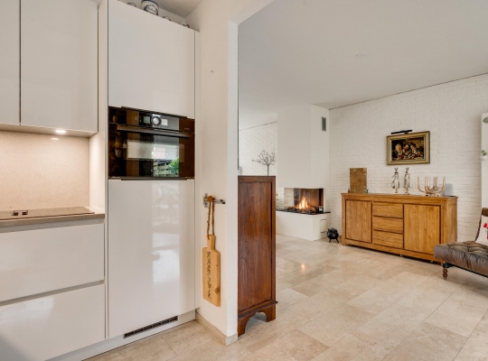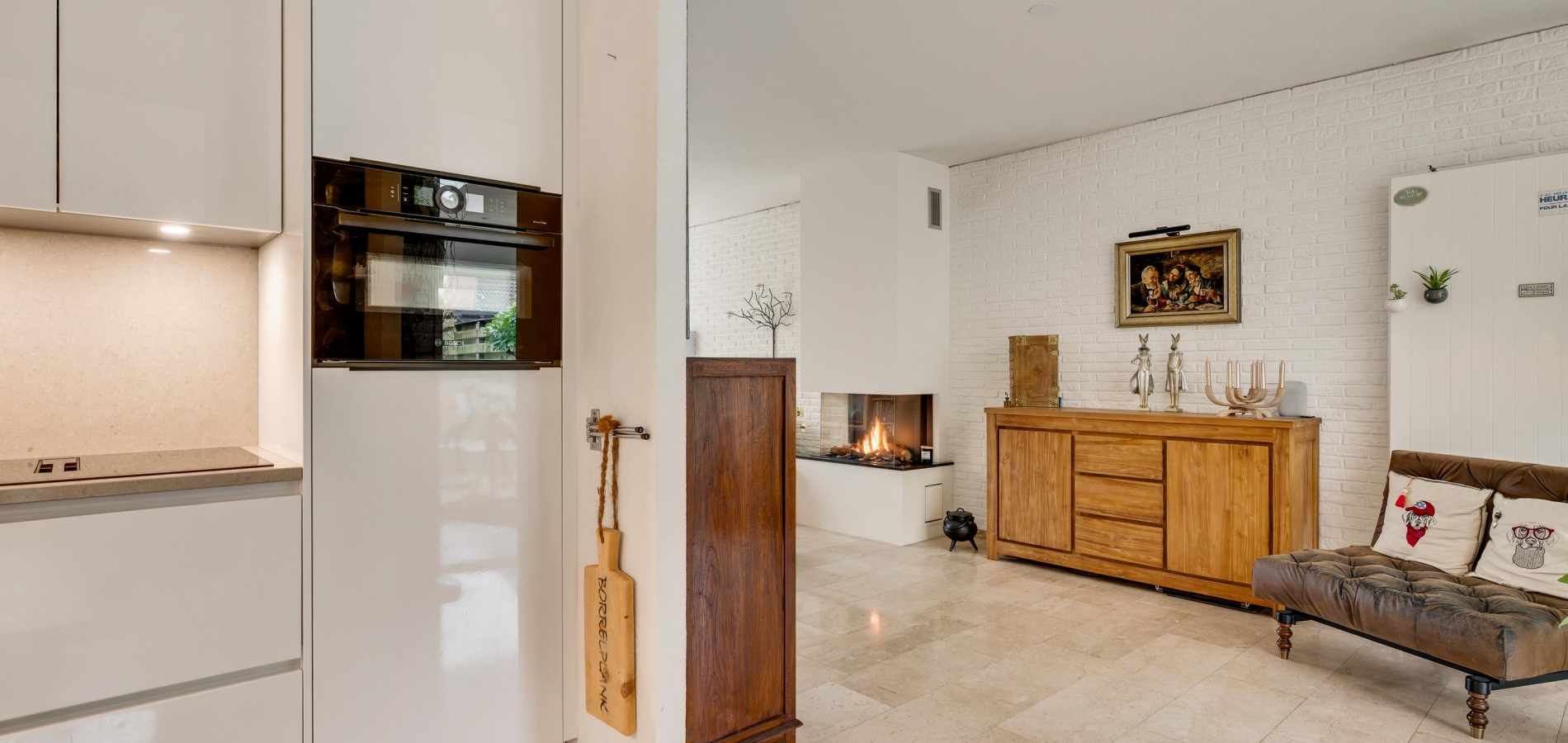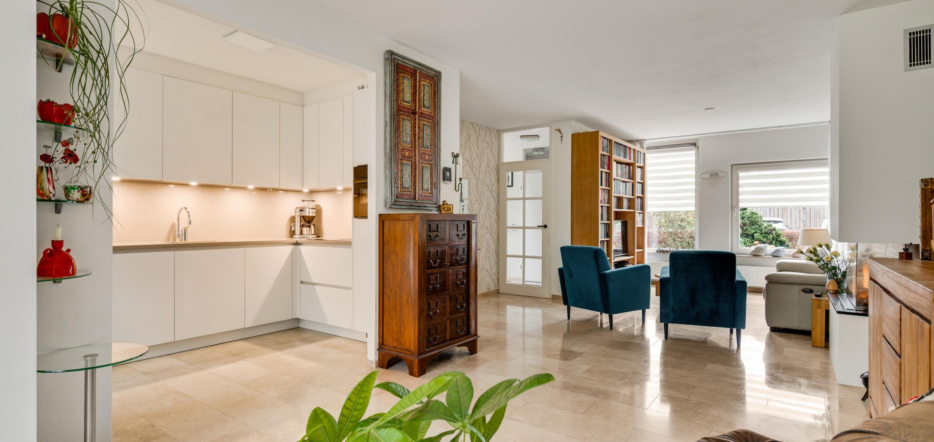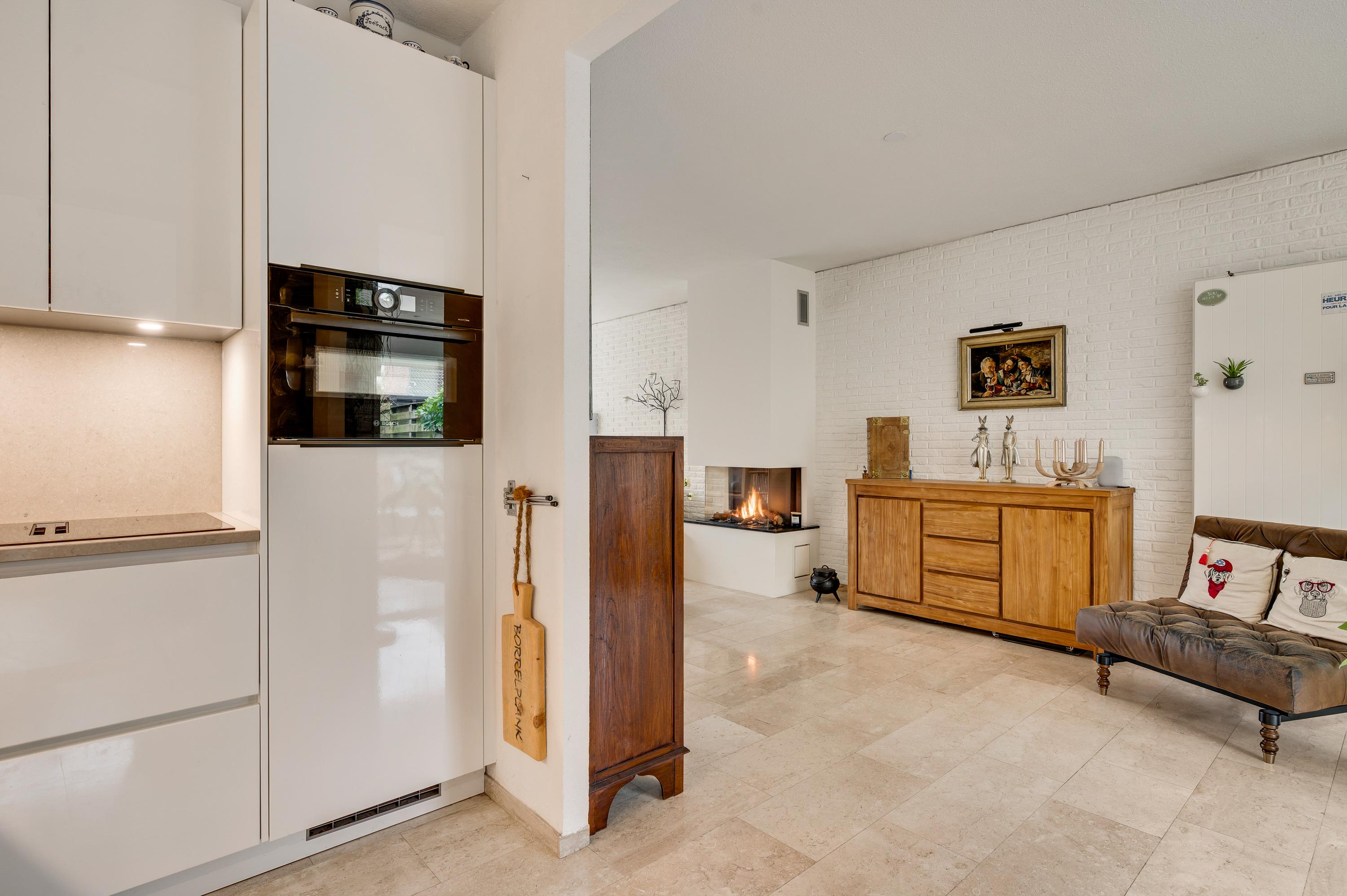 Een brede doorgang verbindt de woonkamer met de keuken waar een moderne hoekopstelling in een lichte kleur staat. Grote kasten, onder en boven het aanrecht, en twee lades bieden volop bergruimte en alle benodigde apparatuur is ingebouwd: een inductie kookplaat met afzuiging, een vaatwasser, combi-oven en een koelkast.