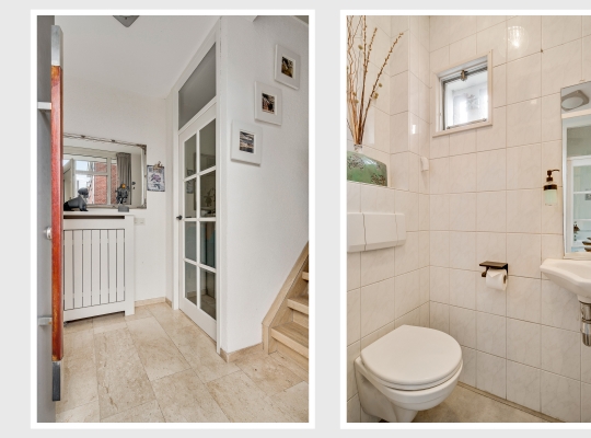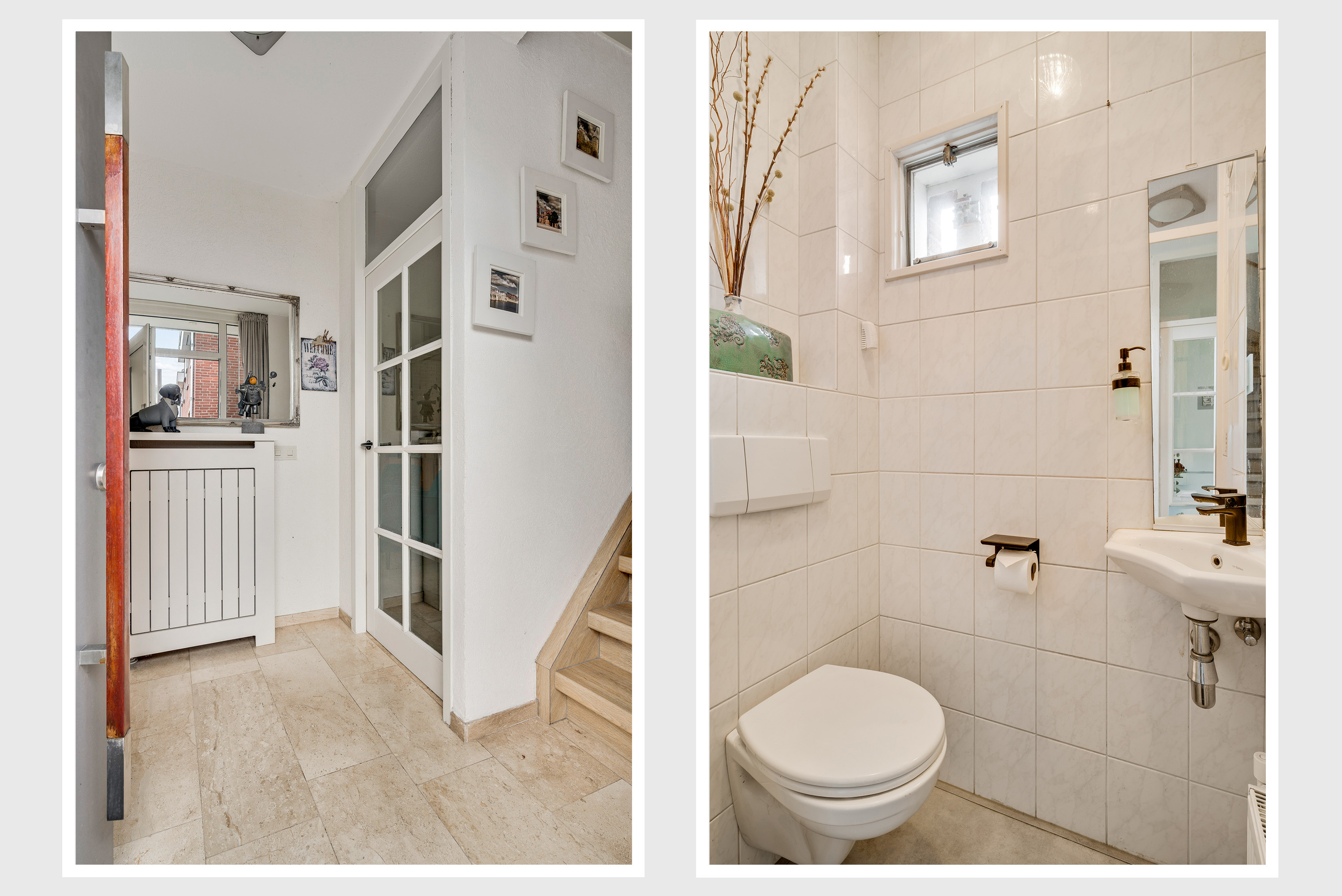 Bij de oprit is de entree van deze uitgebouwde, sfeervolle woning. In de hal ziet u de trapopgang, de meterkast met garderobe en de toiletruimte met fonteintje. In beide ruimtes ligt, net als in de woonkamer en keuken, een natuurstenen vloer.