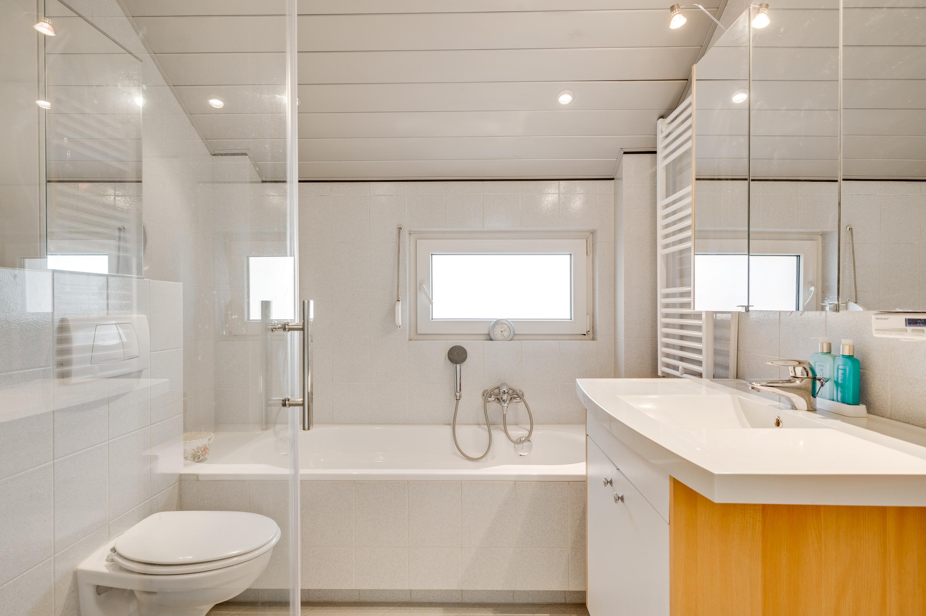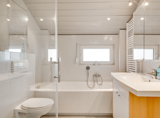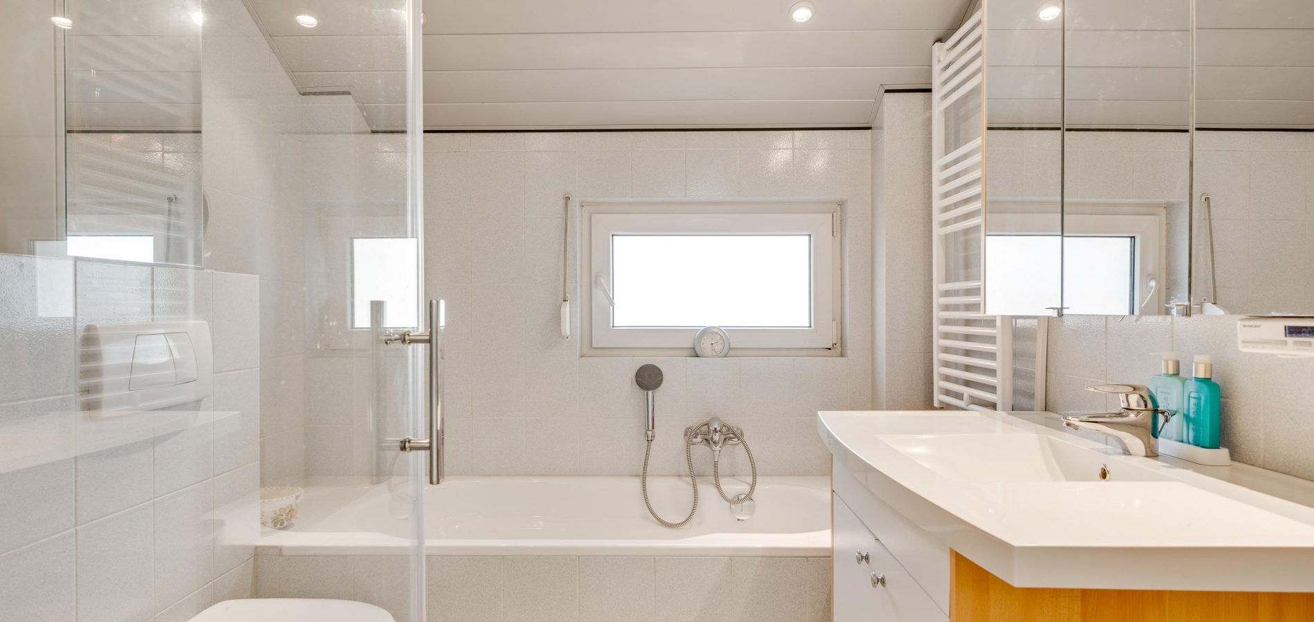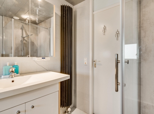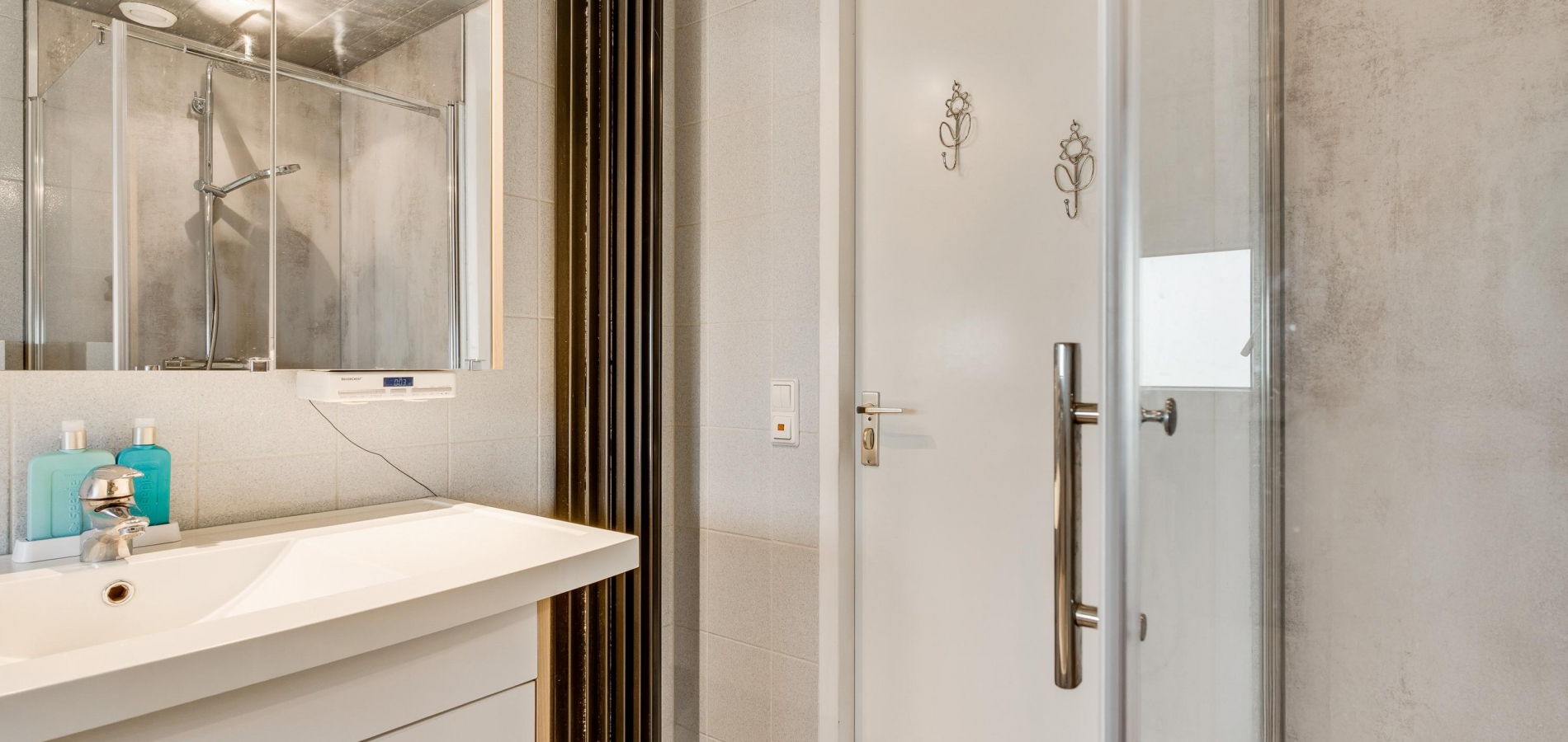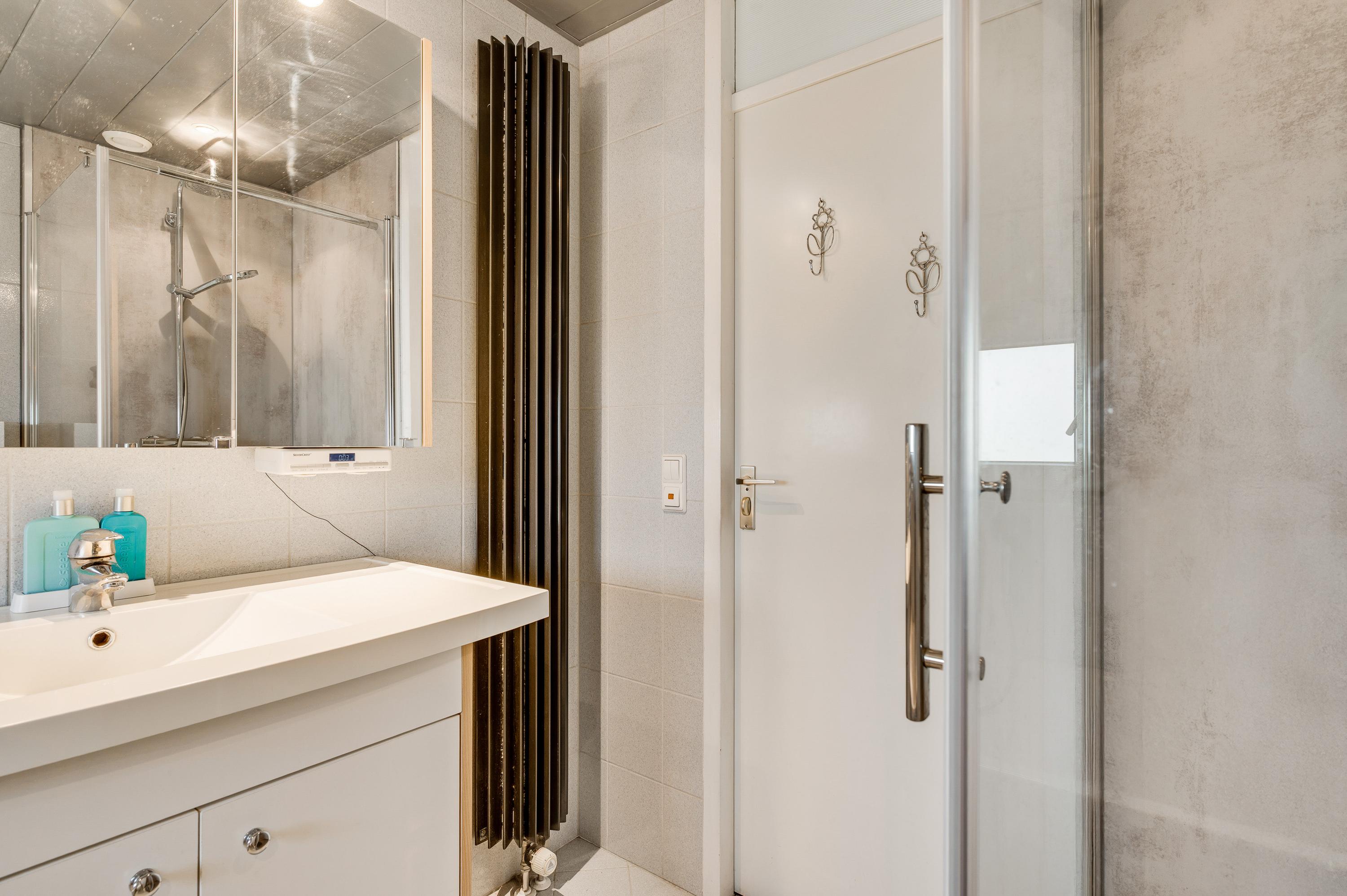 De badkamer (circa 2,53 x 2,21) is ingedeeld met een ligbad, inloopdouche, een toilet en een wastafelmeubel. Fraaie elementen zijn het tegelwerk, de designradiator, de wandwerking in de douche en de inbouwverlichting in het plafond.