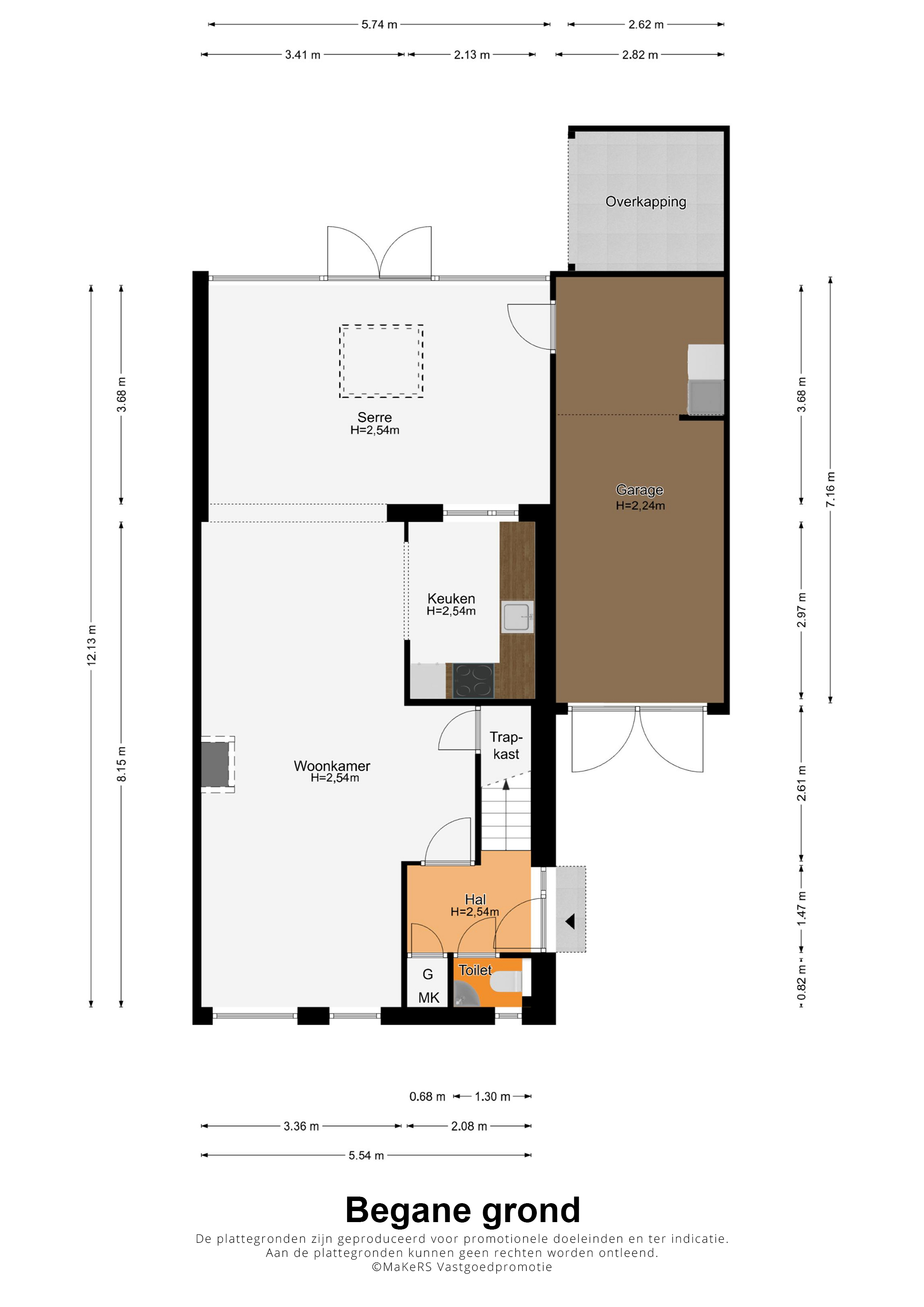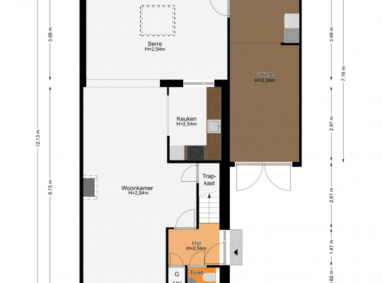 Vanuit de serre heeft u toegang tot de garage (circa 7,16 x 2,82), onder andere voorzien van elektra en water. Er is ruimte voor de fietsen, een auto en hier is de opstelling van de wasapparatuur. In het verlengde van de garage is een overkapping gebouwd, te bereiken vanuit de tuin.