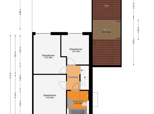 Op deze verdieping zijn de overloop, drie slaapkamers en de badkamer. Slaapkamer I (circa 3,28 x 4,14) is aan de voorzijde en slaapkamer II (circa 3,28/2,70 x 3,91) is, net als slaapkamer III (circa 2,97 x 2,79/2,21), aan de achterzijde. In alle slaapkamers ligt laminaat op de vloer.